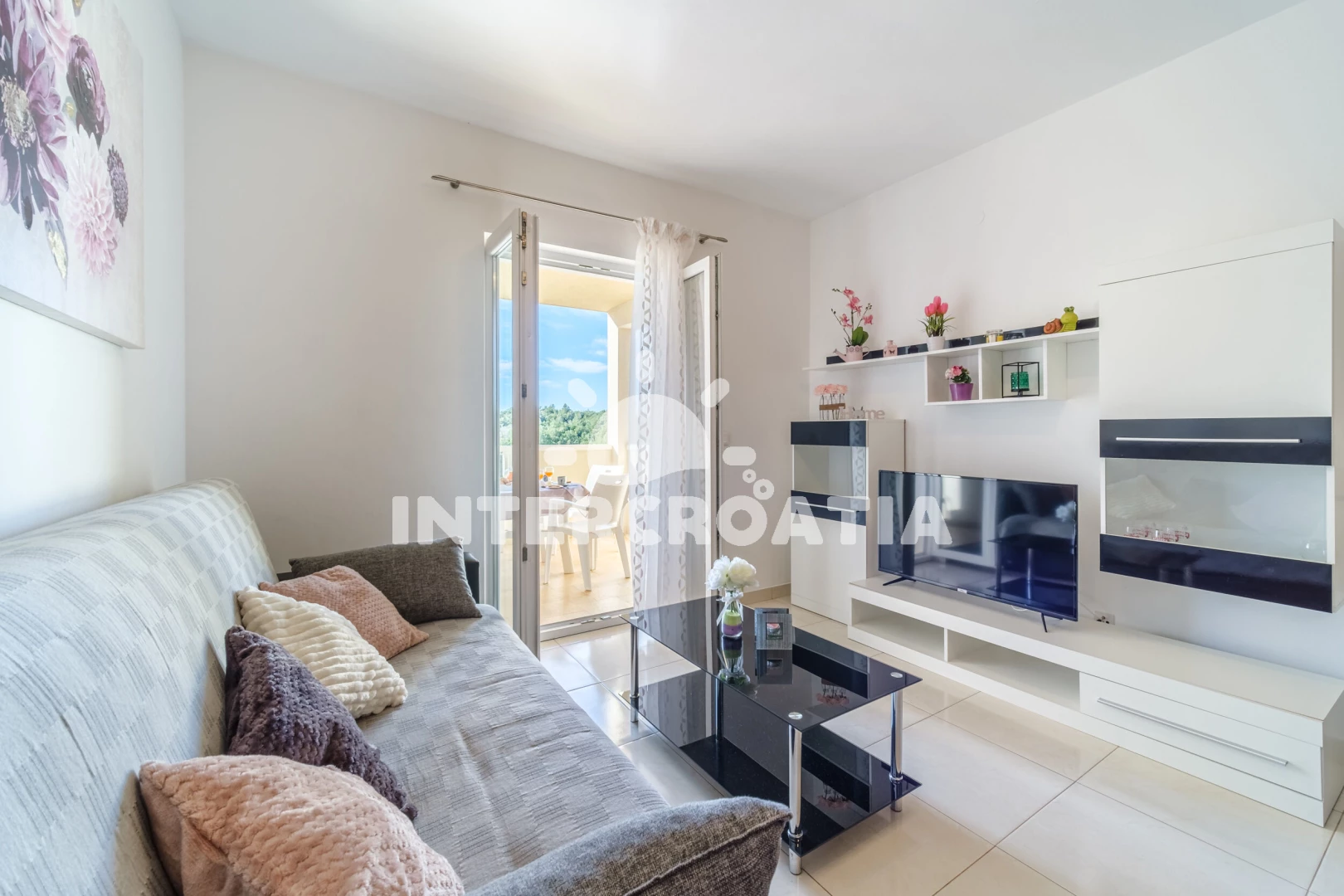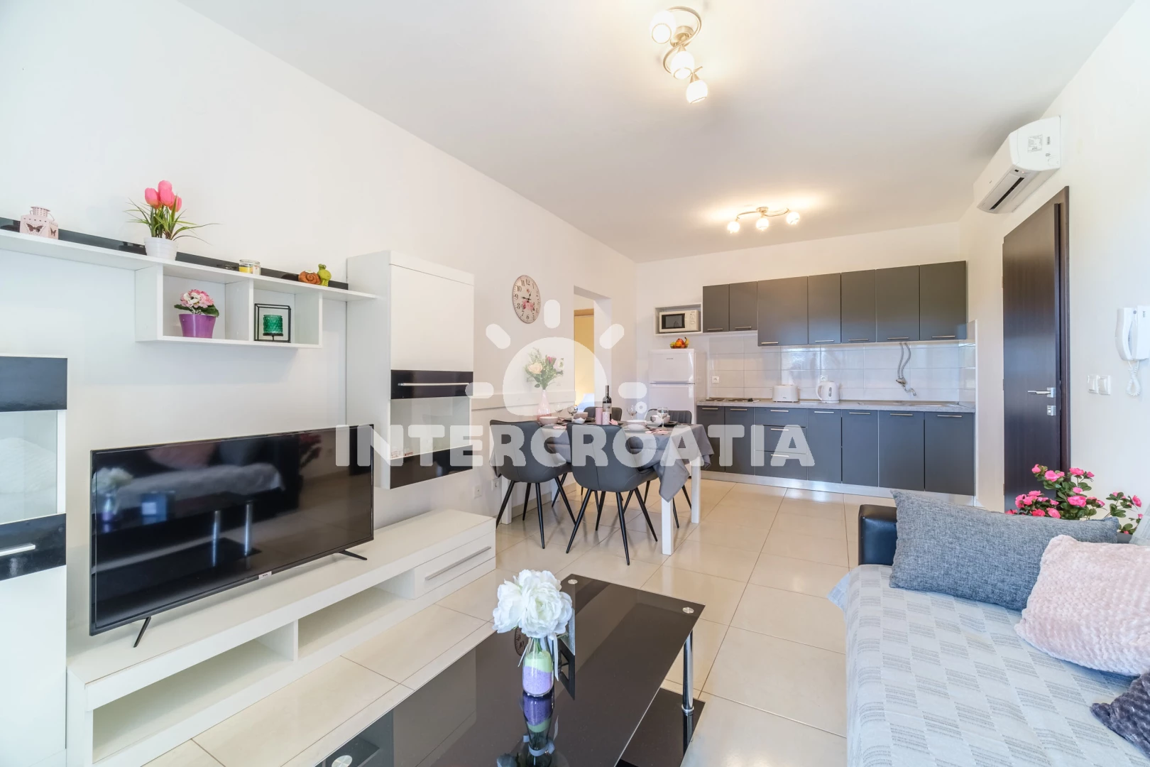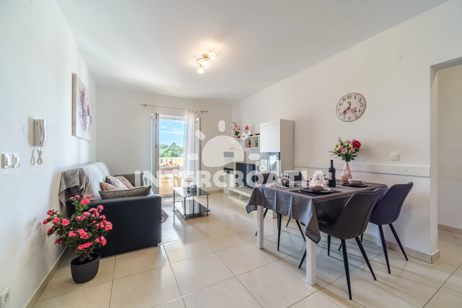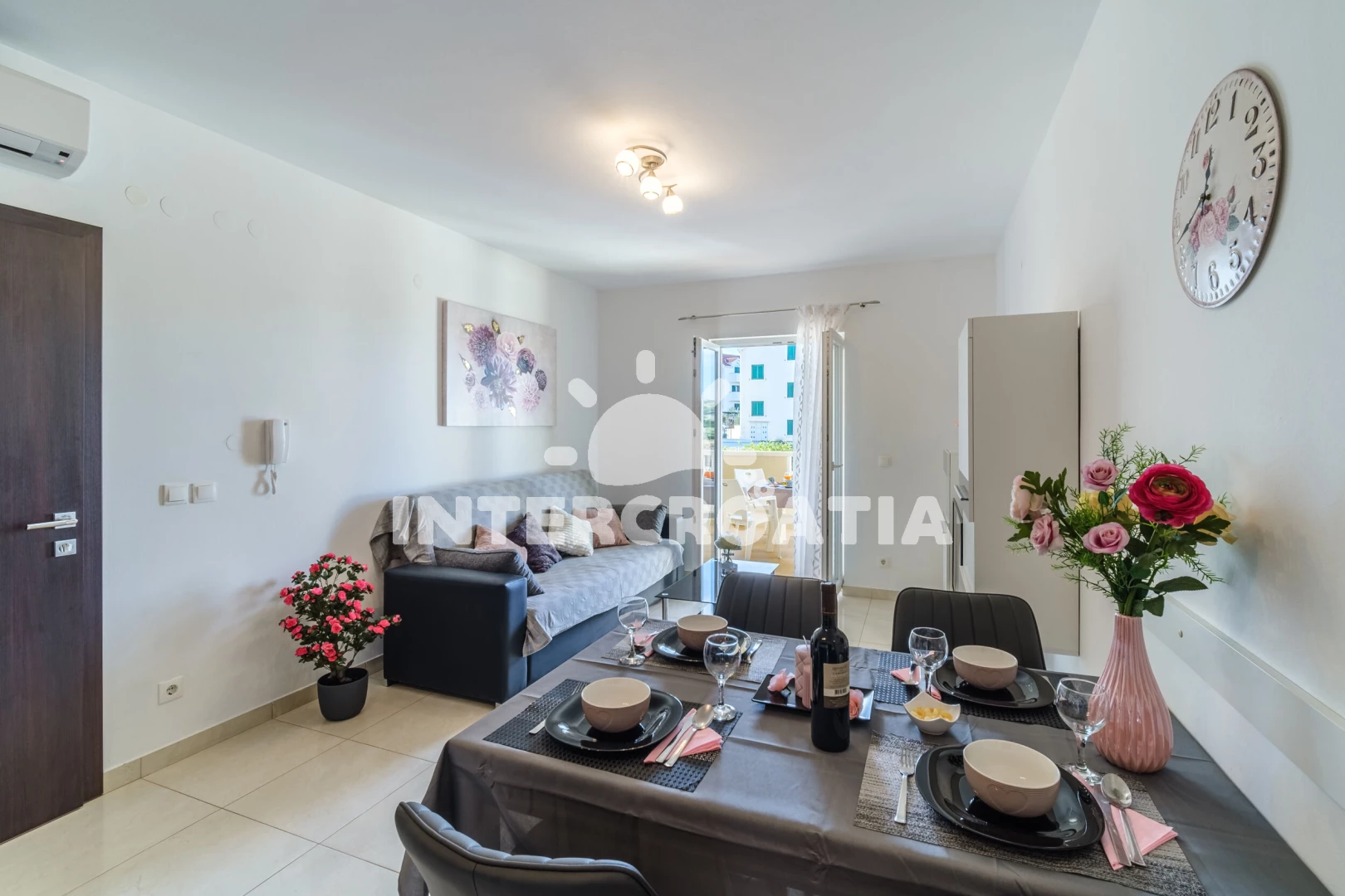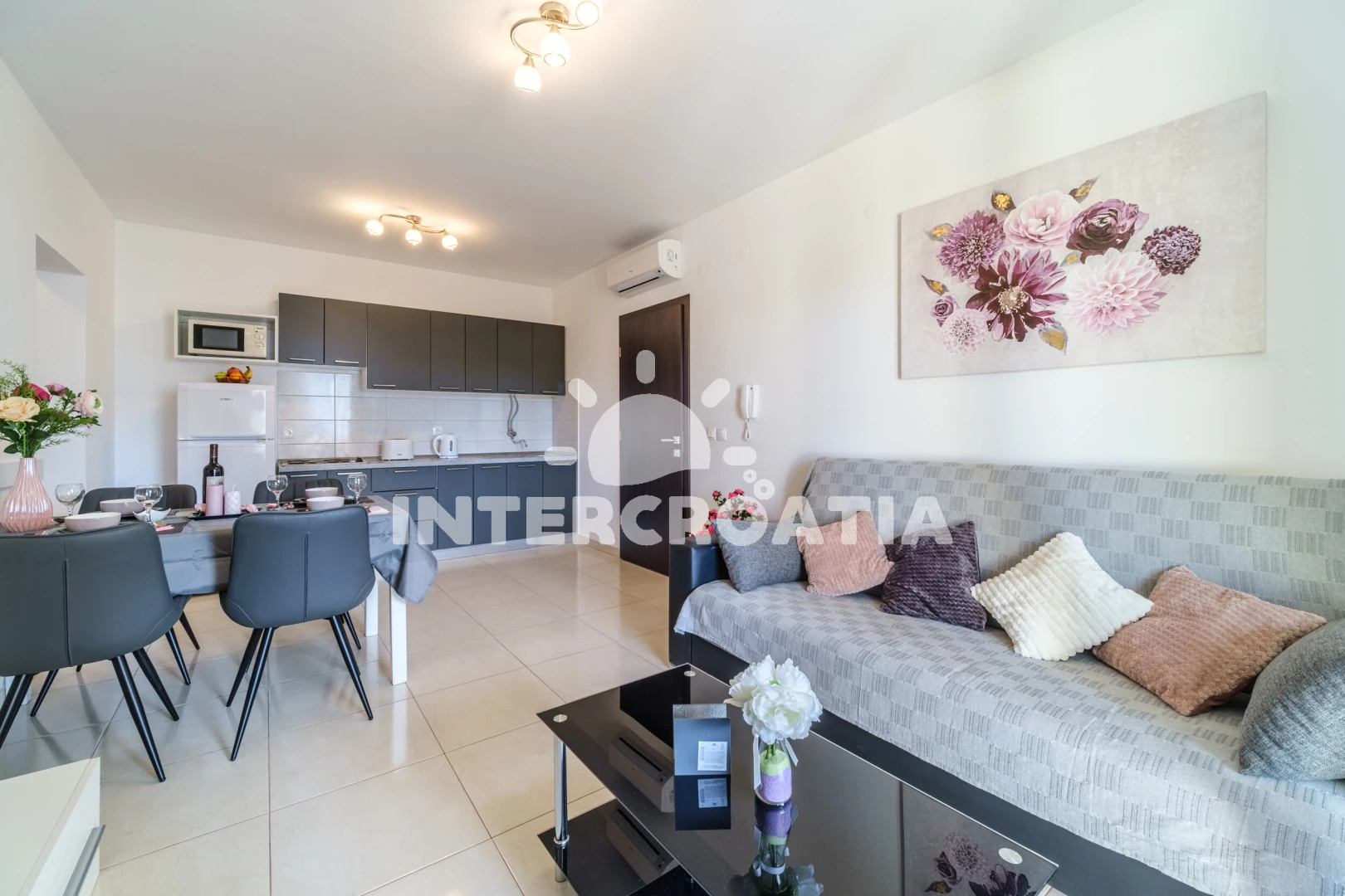 Apartmán (61 m2) s terasou, posezením a částečným výhledem na moře se nachází v přízemí domu. Apartmán má 2 ložnice a je vhodný pro až 5 osob. Obývací pokoj je spojený s kuchyní. Kuchyňská linka je vybavena varnou deskou, mikrovlnnou troubou, rychlovarnou konvicí, kávovarem, toustovačem, nádobím a lednicí s mrazákem. Obývací pokoj s jídelním stolem, pohovkou (rozložitelná na extra lůžko pro 1 osobu), televizí se satelitním programem, rádiem, klimatizací a vstupem na terasu. První ložnice s dvoulůžkem. Druhá ložnice se dvěma jednolůžky. Koupelna se sprchovým koutem, umyvadlem, fénem, pračkou a wc. Hostům je k dispozici parkování u objektu zdarma.