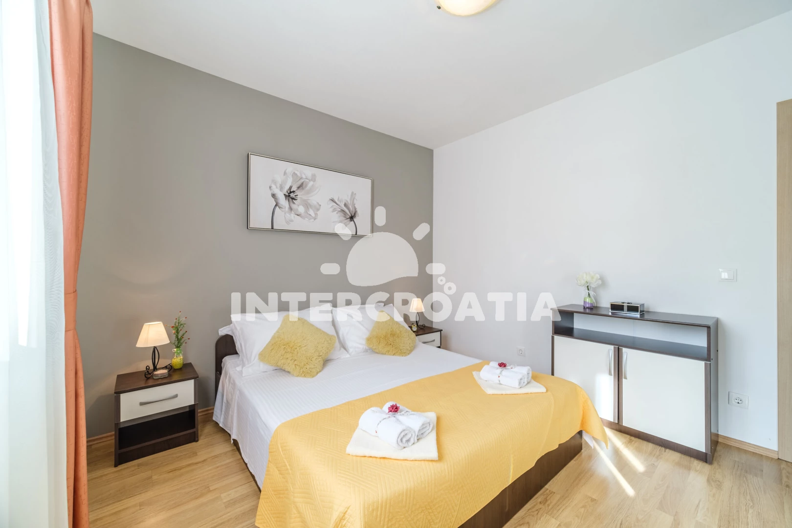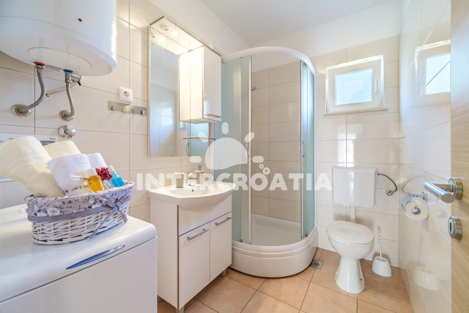 Apartmán (42 m2) s terasou a venkovním posezením se nachází v přízemí domu. Apartmán má 2 ložnice a je vhodný pro až 5 osob. Obývací pokoj je spojený s kuchyní. Kuchyňská linka je vybavena dvouplotýnkovým vařičem, mikrovlnnou troubou, rychlovarnou konvicí, kávovarem, toustovačem, nádobím a lednicí s mrazákem. Obývací pokoj s jídelním stolem, pohovkou (rozložitelná na extra lůžko pro 1 osobu), televizí se satelitním programem, rádiem a klimatizací. První ložnice s dvoulůžkem. Druhá ložnice se dvěma jednolůžky. Koupelna se sprchovým koutem, umyvadlem, fénem, pračkou a wc. Hostům je k dispozici parkování u objektu zdarma.