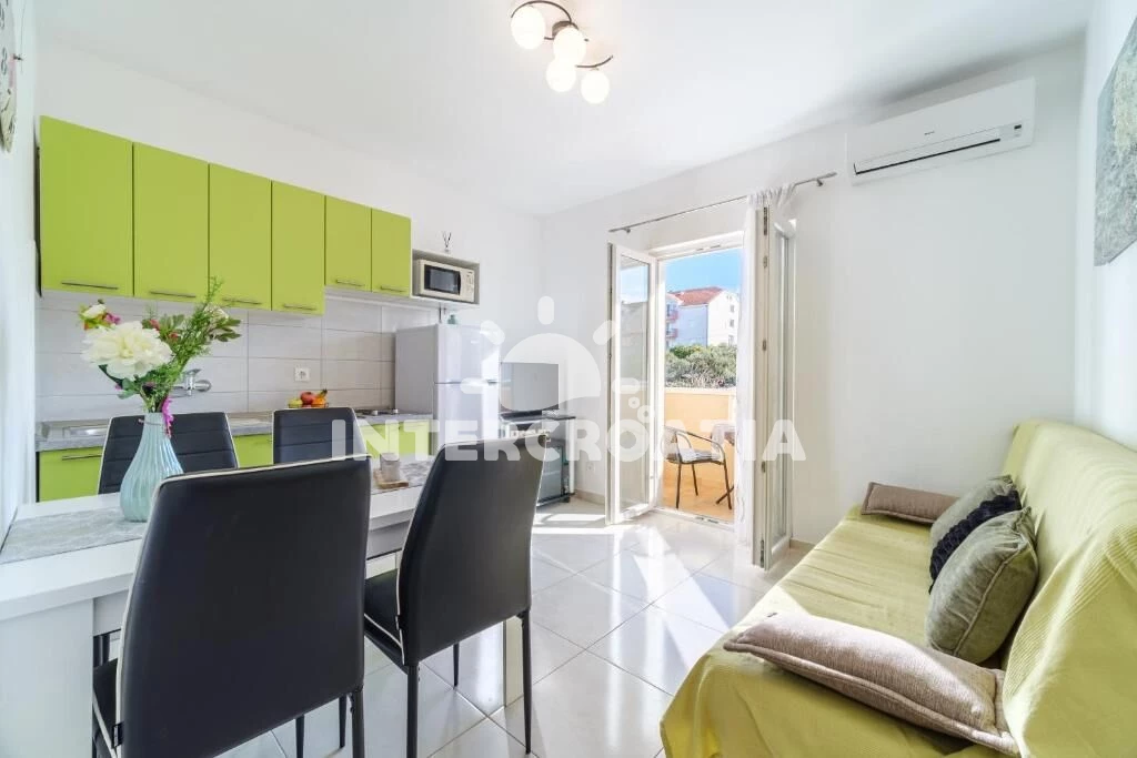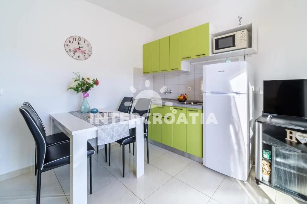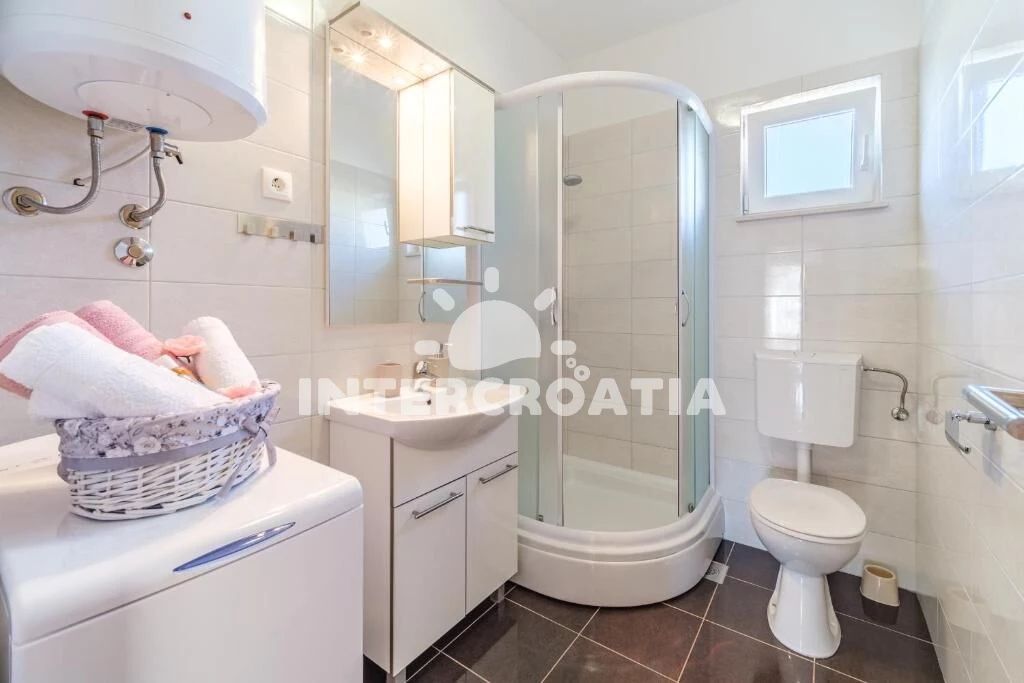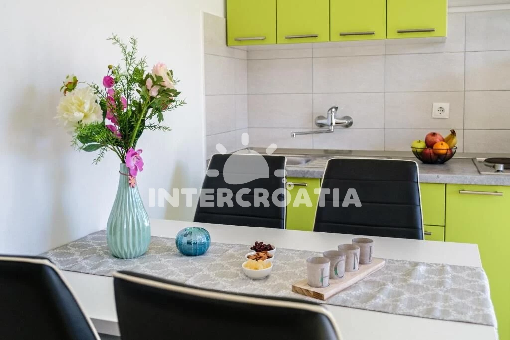 Apartmán (45 m2) s balkonem a venkovním posezením se nachází v 1. patře domu. Apartmán má 2 ložnice a je vhodný pro až 5 osob. Obývací pokoj je spojený s kuchyní. Kuchyňská linka je vybavena dvouplotýnkovým vařičem, mikrovlnnou troubou, rychlovarnou konvicí, kávovarem, toustovačem, nádobím a lednicí s mrazákem. Obývací pokoj s jídelním stolem, pohovkou (rozložitelná na extra lůžko pro 1 osobu), televizí se satelitním programem, klimatizací a vstupem na terasu. První ložnice s dvoulůžkem. Druhá ložnice se dvěma jednolůžky. Koupelna se sprchovým koutem, umyvadlem, fénem, pračkou a wc. Hostům je k dispozici parkování u objektu zdarma.