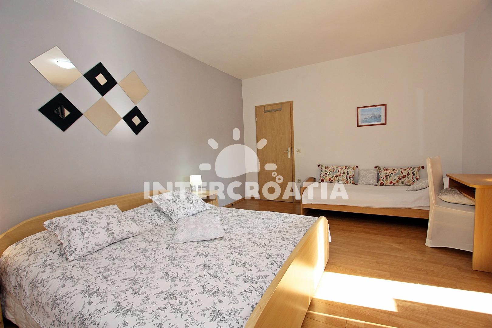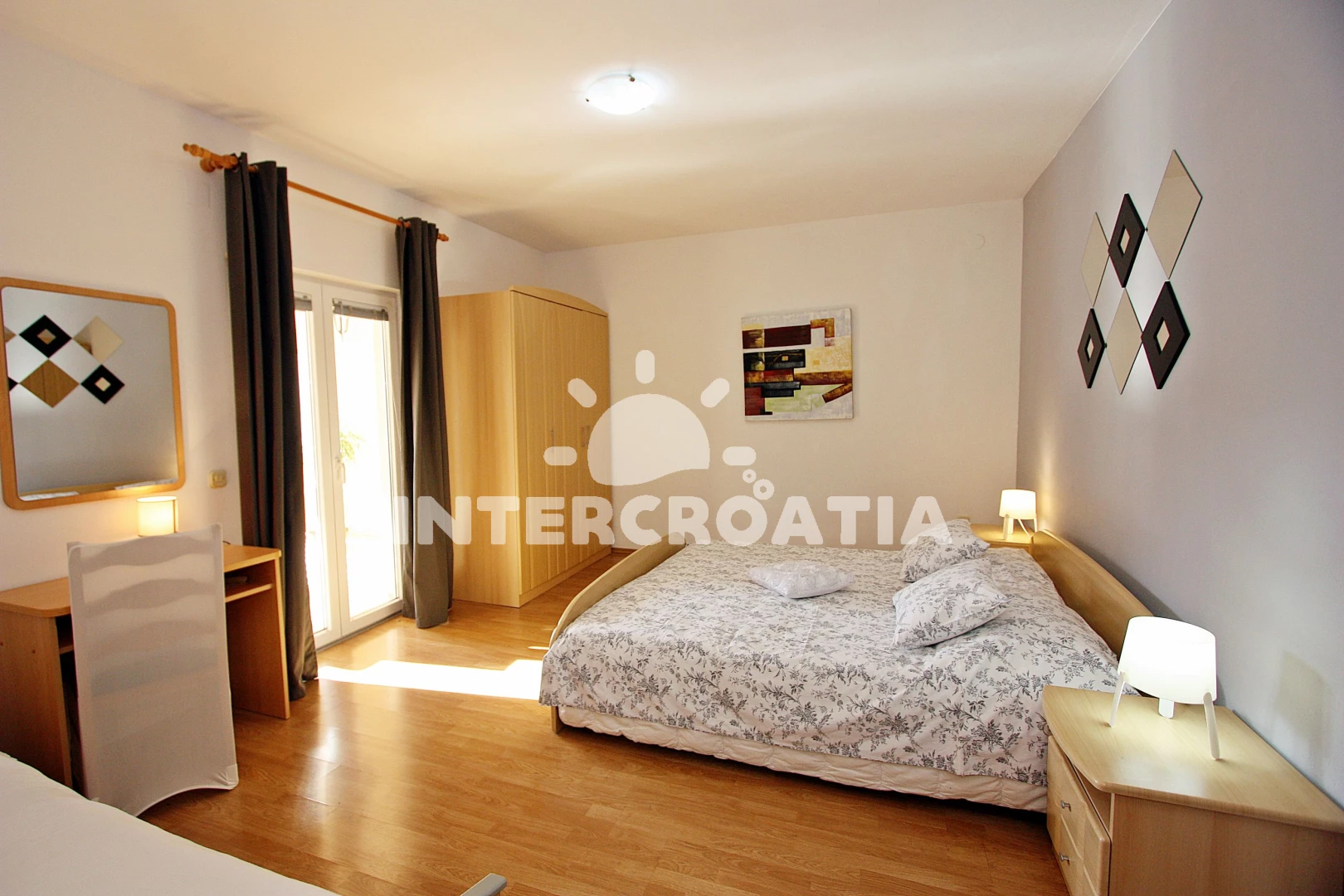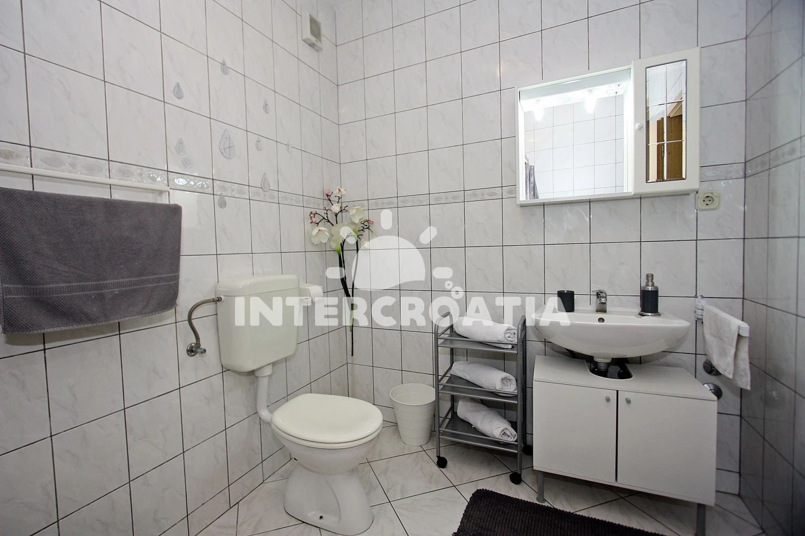 Vzdálenosti: Moře 300 m, pláž 300 m (oblázky), tenisové kurty 150 m, supermarket 200 m, restaurace 300 m, lékárna 300 m, ambulance 300 m, směnárna 300 m, bar 400 m, banka 500 m, pošta 500 m, centrum 800 m, marina 800 m, kotviště pro čluny 800 m, čerpací stanice 1 km, letiště 20 km,