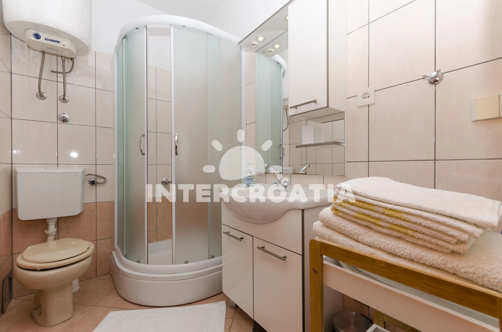 Apartmán (38 m2) s výhledem na moře. Nachází se v přízemí objektu. Apartmán má 1 ložnici a je vhodný pro až 3 osoby. Kuchyňská linka je vybavena varnou deskou, troubou, nádobím, lednicí. V obývací místnosti je rozložitelná pohovka (extra lůžko pro 1 osobu). K dispozici televize se satelitním programem. Ložnice s dvoulůžkem. Koupelna s vanou, umyvadlem, fénem a WC.