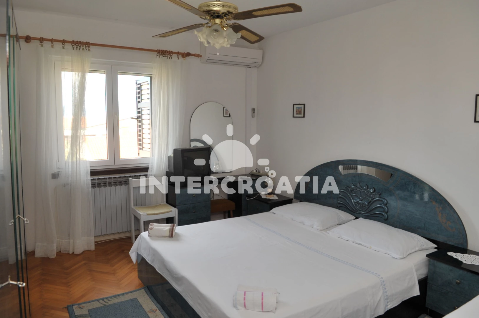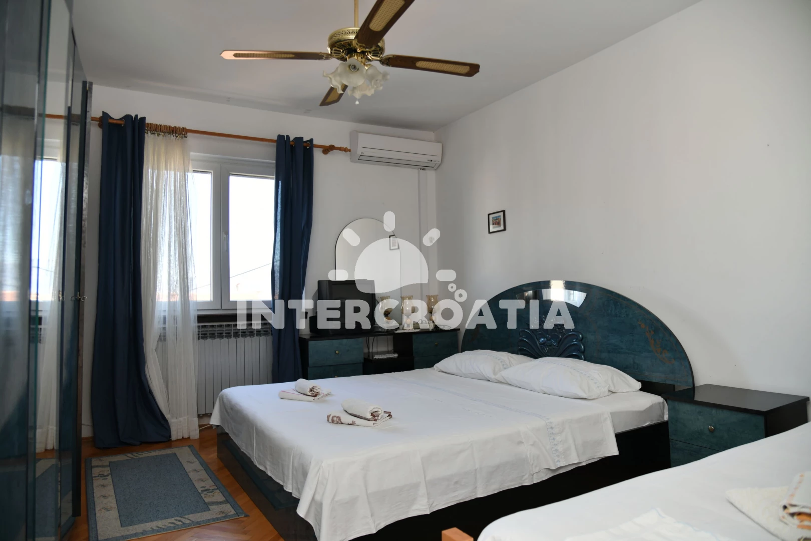 Apartmán (104 m2) s balkonem, a výhledem na moře. Nachází se ve 2. patře objektu. Apartmán má 3 ložnice a je vhodný pro až 7 osob. Kuchyňská linka je vybavena varnou deskou, kávovarem, troubou, toustovačem, myčkou na nádobí, mikrovlnnou troubou, rychlovarnou konvicí, nádobím, lednicí. K dispozici televize se satelitním programem, žehlička. První ložnice s dvoulůžkem, přistýlkou. Druhá ložnice s přistýlkou, jednolůžkem. Třetí ložnice s dvoulůžkem. První koupelna se sprchovým koutem, umyvadlem, fénem a WC. Druhá koupelna se sprchovým koutem, umyvadlem, fénem a WC.