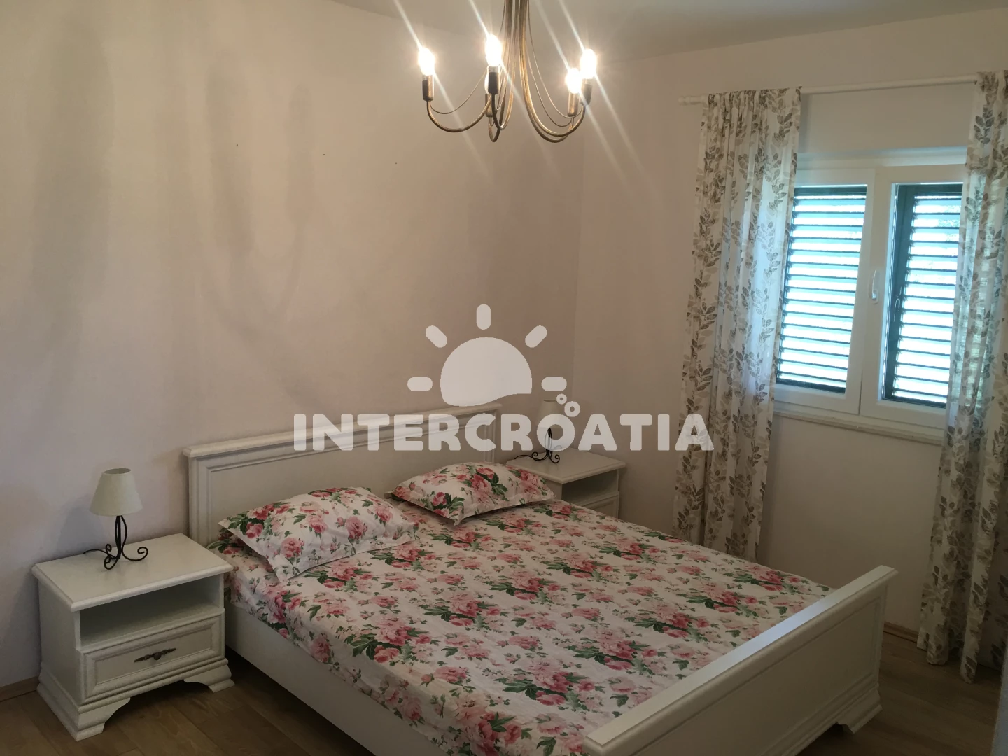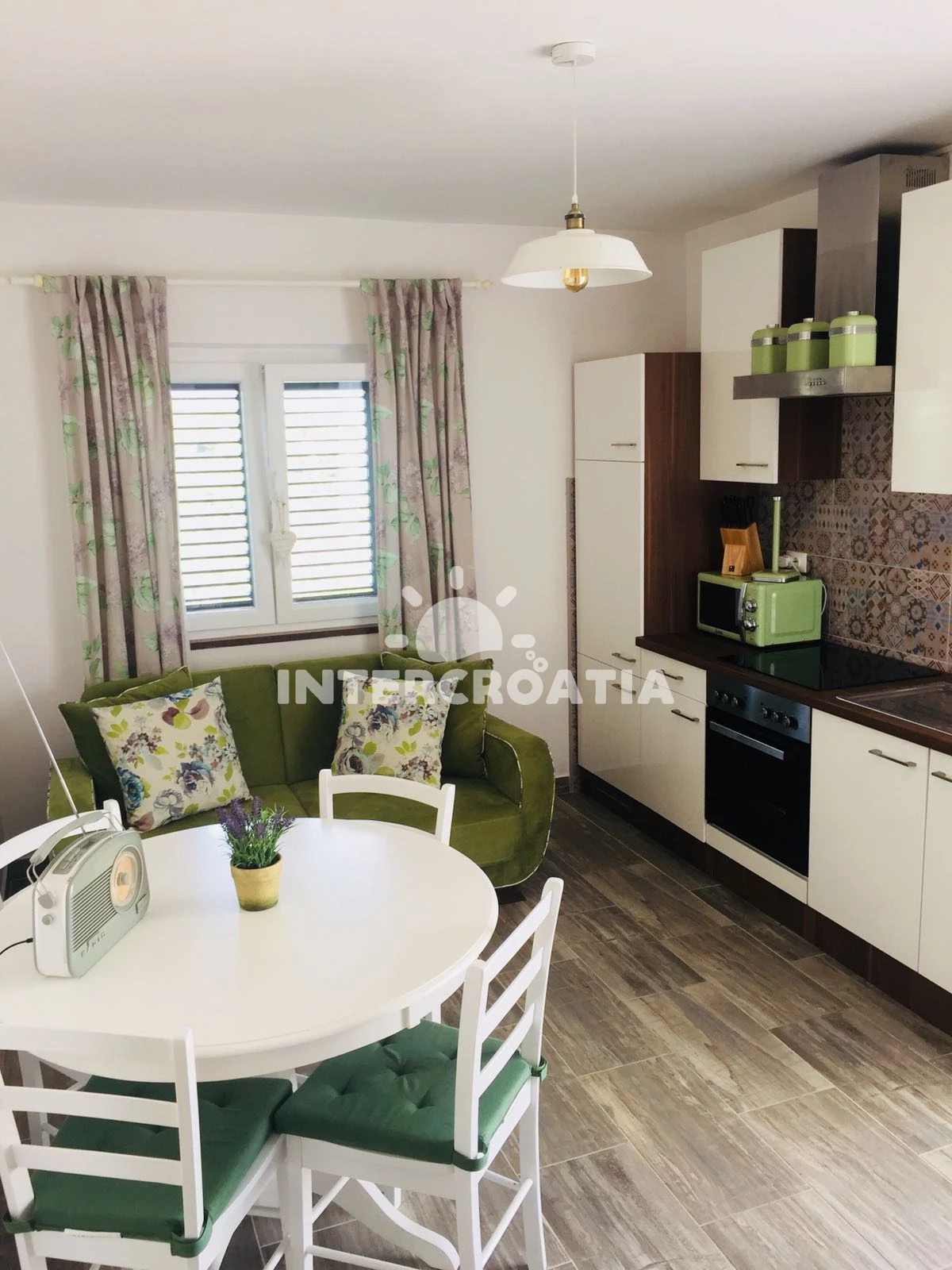 Apartmán (50 m2) s terasou, a výhledem na moře. Nachází se v 1. patře objektu. Apartmán má 2 ložnice a je vhodný pro až 5 osob. Kuchyňská linka je vybavena varnou deskou, toustovačem, troubou, mikrovlnnou troubou, rychlovarnou konvicí, nádobím, lednicí, mrazákem. V obývací místnosti je rozložitelná pohovka (extra lůžko pro 1 osobu). K dispozici televize, radio, žehlička. První ložnice s dvoulůžkem. Druhá ložnice s dvoulůžkem. Koupelna se sprchovým koutem, umyvadlem, fénem a WC. Hostům je k dispozici parkování u objektu zdarma.