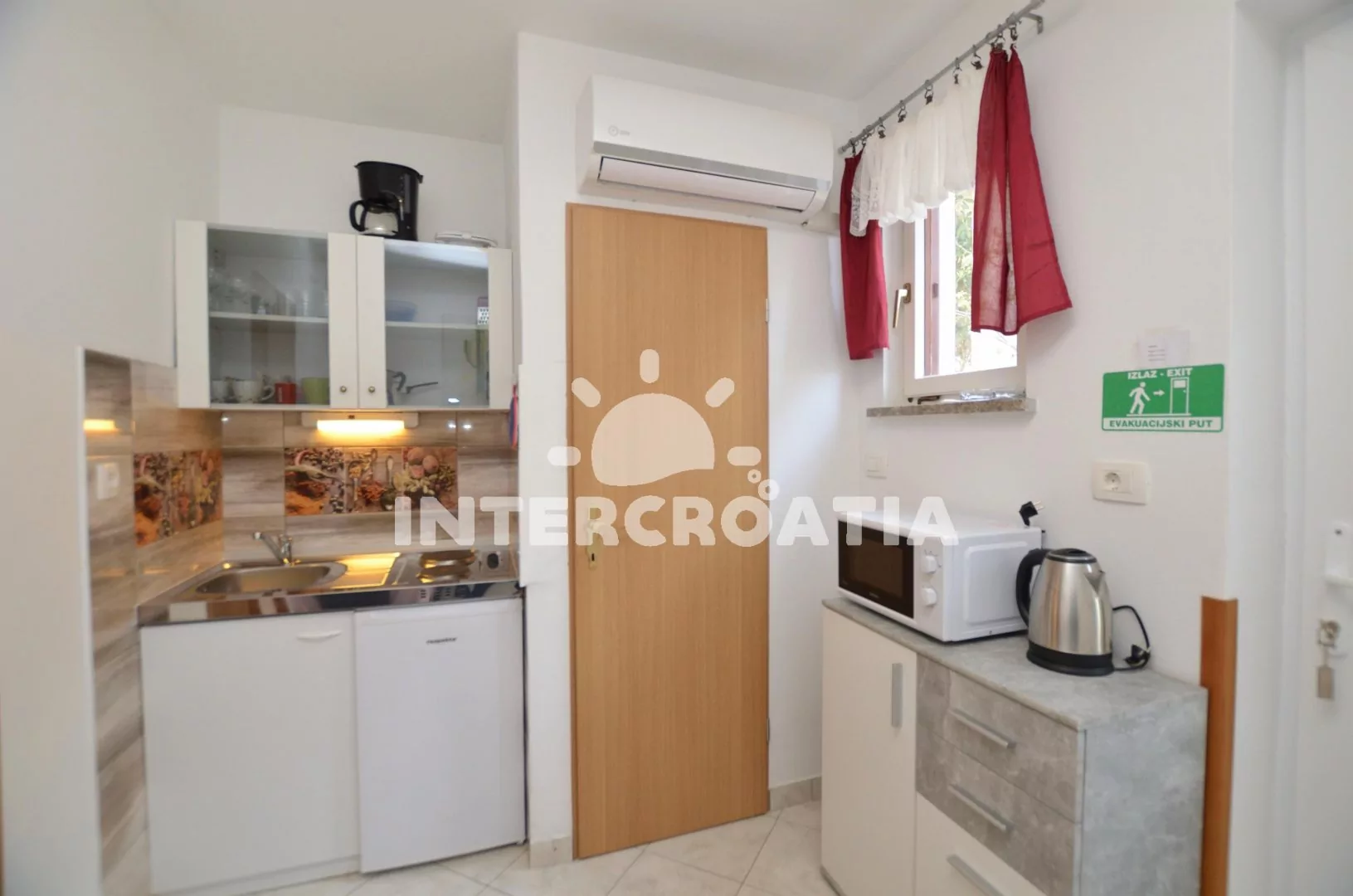 Apartmán (19 m2) s terasou a výhledem do zahrady se nachází v přízemí domu. Apartmán je vhodný pro 2 osoby. Obývací místnost je spojena s kuchyní. Kuchyňská linka je vybavena dvouplotýnkovým vařičem, kávovarem, rychlovarnou konvicí, toustovačem, nádobím a lednicí s mrazákem. Obývací místnost s jídelním stolem pro 2 osoby, televizí se satelitním programem a klimatizací. Ložnice s dvoulůžkem. Koupelna se sprchovým koutem, umyvadlem, fénem a wc. Hostům je k dispozici parkování u objektu zdarma.