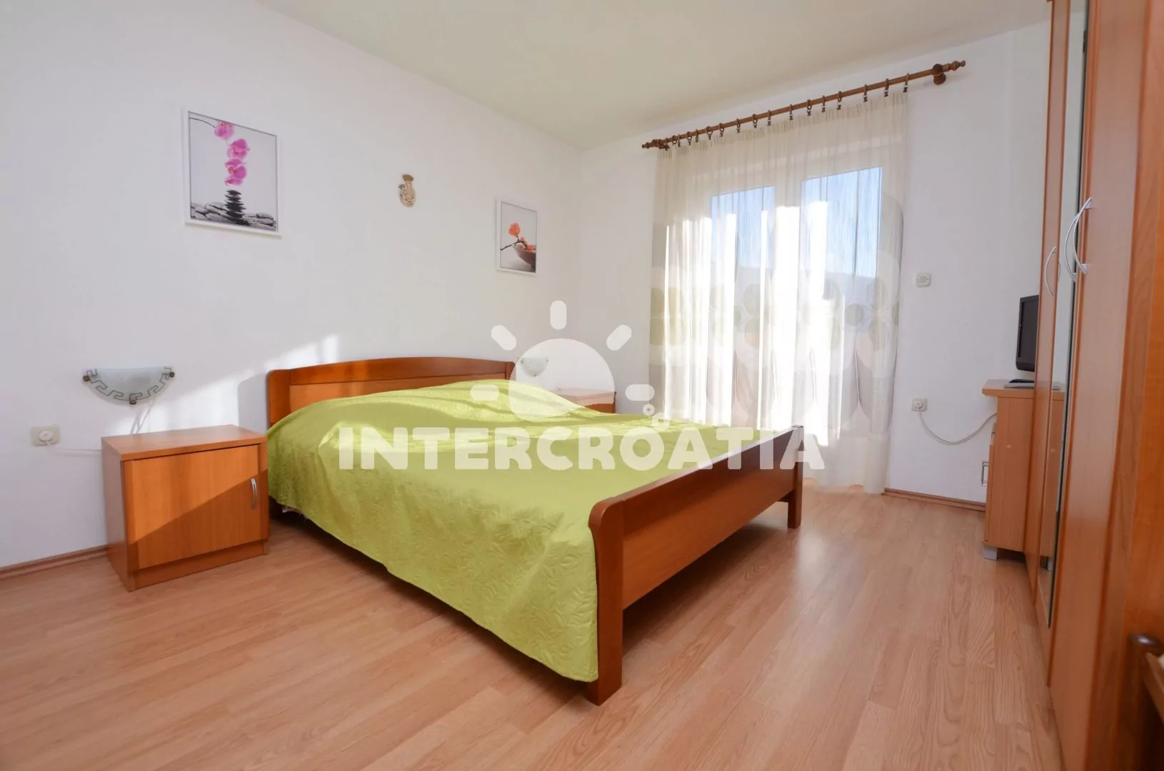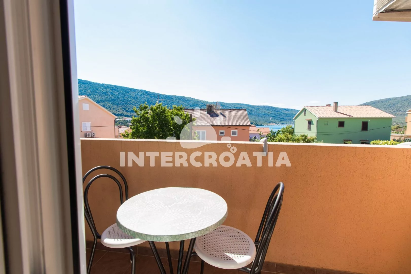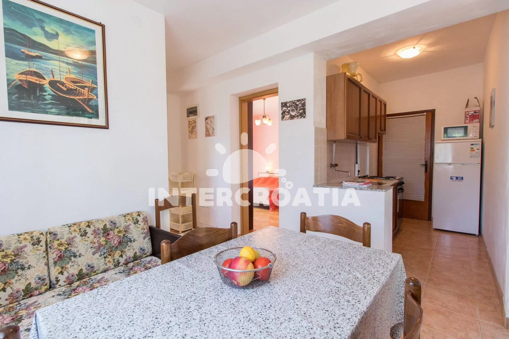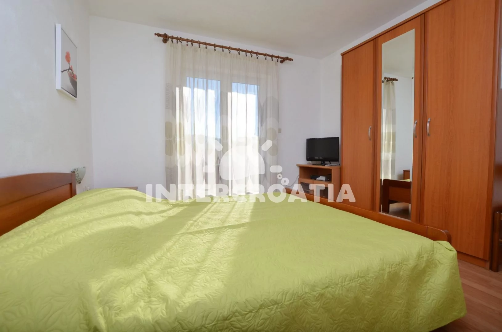 Apartmán (50 m2) s balkonem, lodžií a výhledem na moře se nachází v 1. patře domu a je vhodný pro 4 až 5 osob. Obývací pokoj je spojený s kuchyní. Kuchyňská linka je vybavena sporákem s troubou, kávovarem, mikrovlnnou troubou, nádobím a lednicí s mrazákem. Obývací pokoj s jídelním stolem pro 4 osoby, pohovkou a klimatizací. První ložnice s dvoulůžkem, televizí se satelitním programem a vstupem na balkon. Druhá ložnice s dvoulůžkem, přistýlkou a vstupem na balkon. Koupelna se sprchovým koutem, umyvadlem, fénem a wc. Hostům je k dispozici parkování u objektu zdarma.
