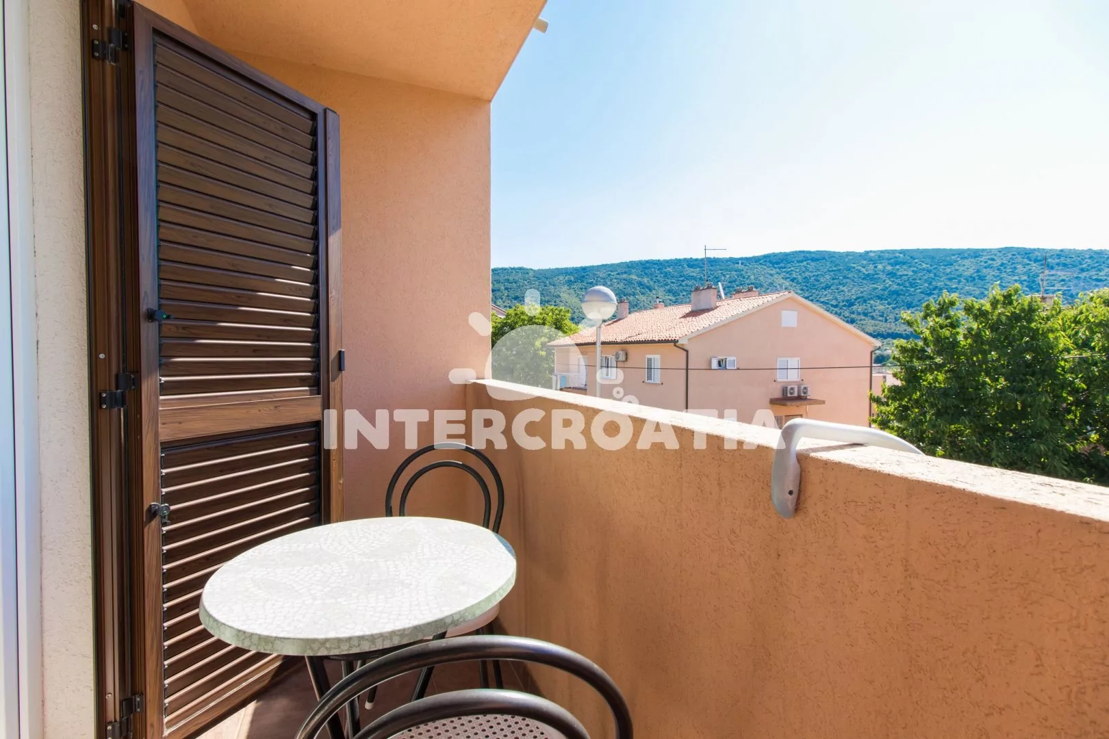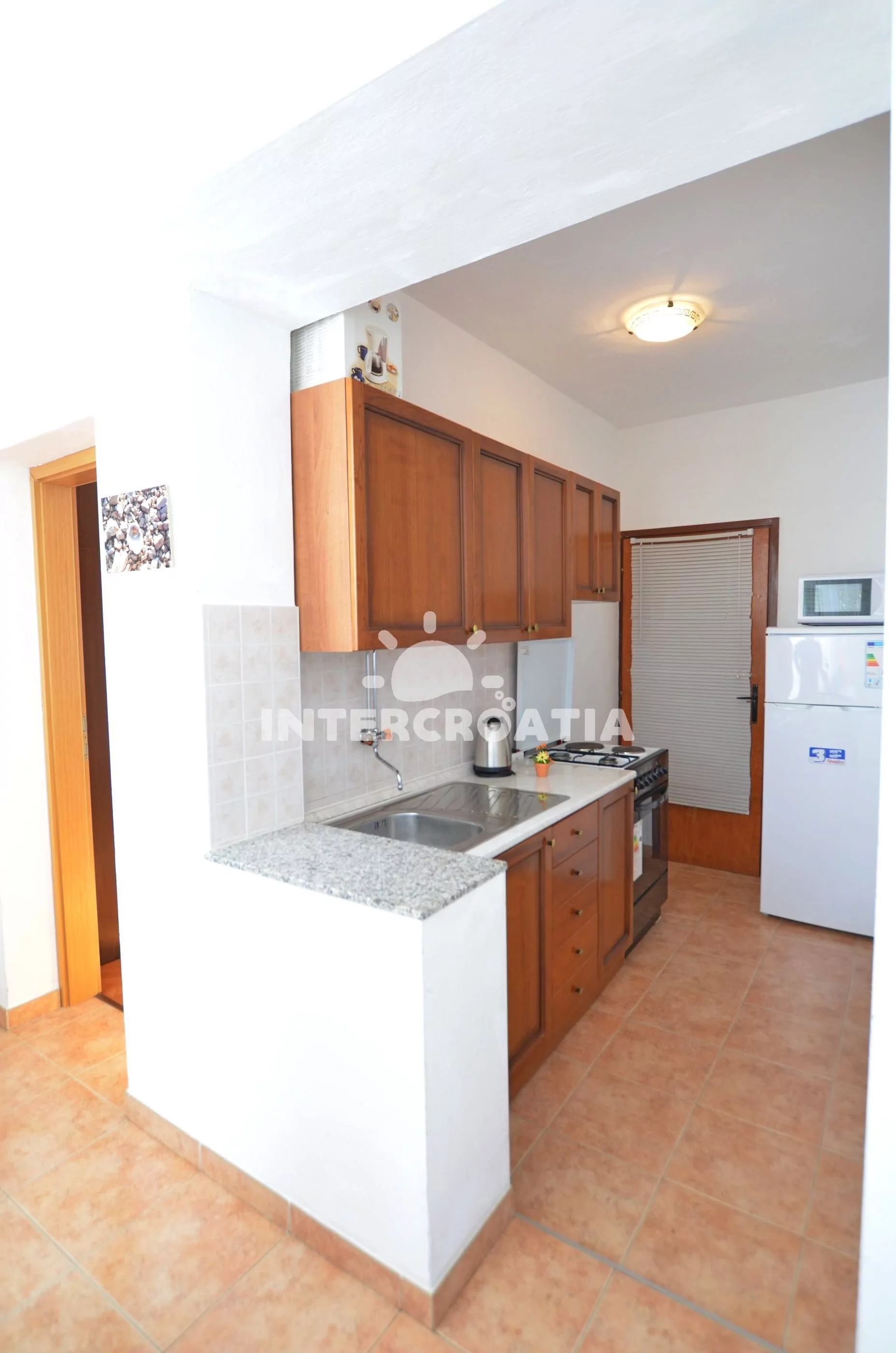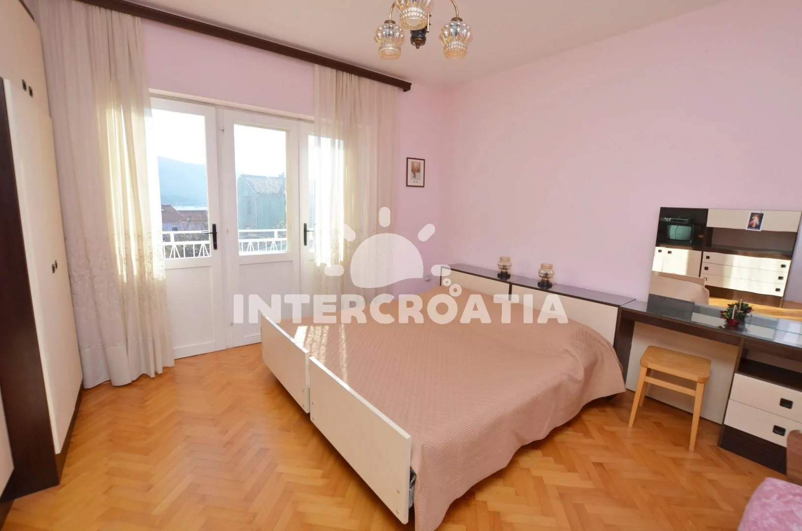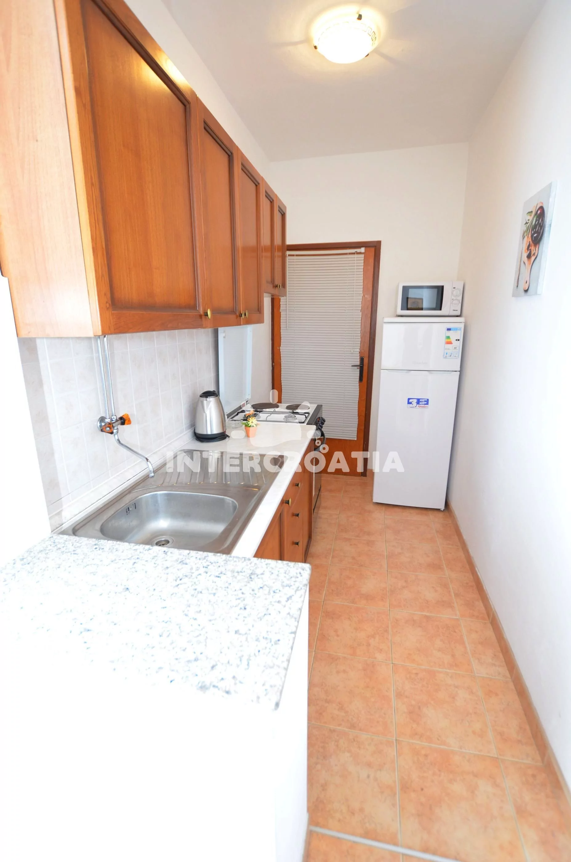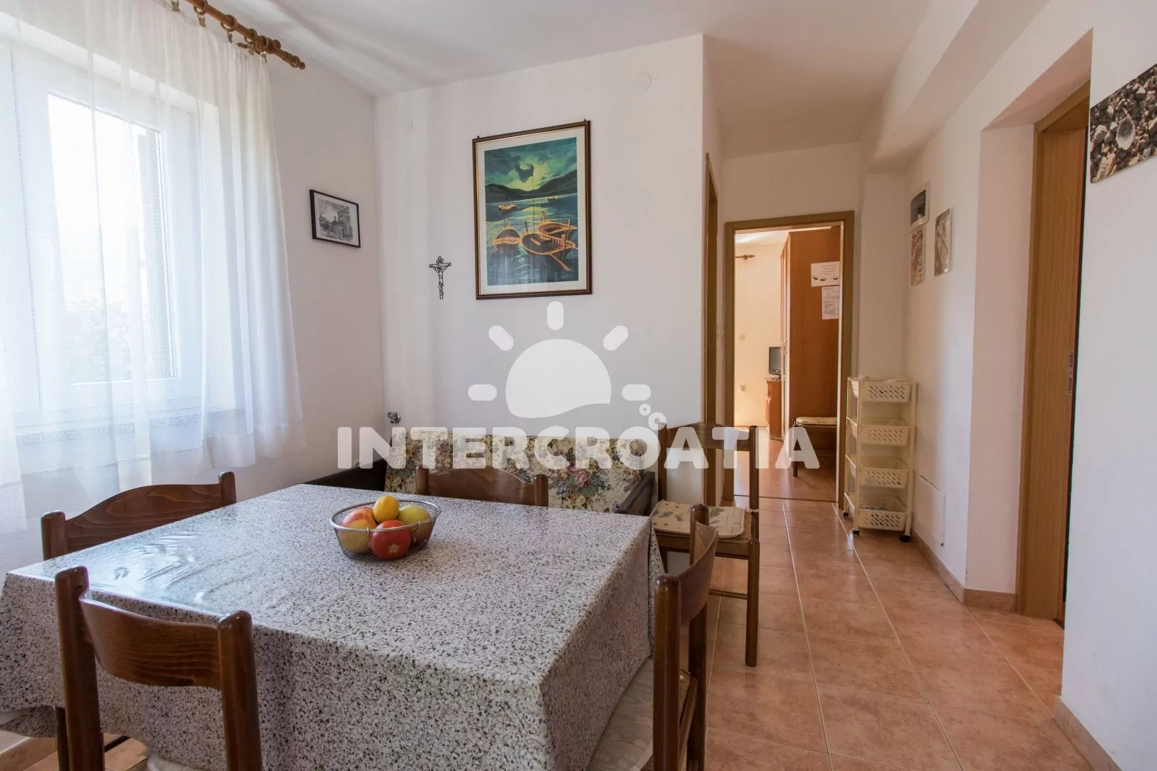 Apartmán (50 m2) s balkonem, lodžií a výhledem na moře se nachází v 1. patře domu a je vhodný pro 4 až 5 osob. Obývací pokoj je spojený s kuchyní. Kuchyňská linka je vybavena sporákem s troubou, kávovarem, mikrovlnnou troubou, nádobím a lednicí s mrazákem. Obývací pokoj s jídelním stolem pro 4 osoby, pohovkou a klimatizací. První ložnice s dvoulůžkem, televizí se satelitním programem a vstupem na balkon. Druhá ložnice s dvoulůžkem, přistýlkou a vstupem na balkon. Koupelna se sprchovým koutem, umyvadlem, fénem a wc. Hostům je k dispozici parkování u objektu zdarma.