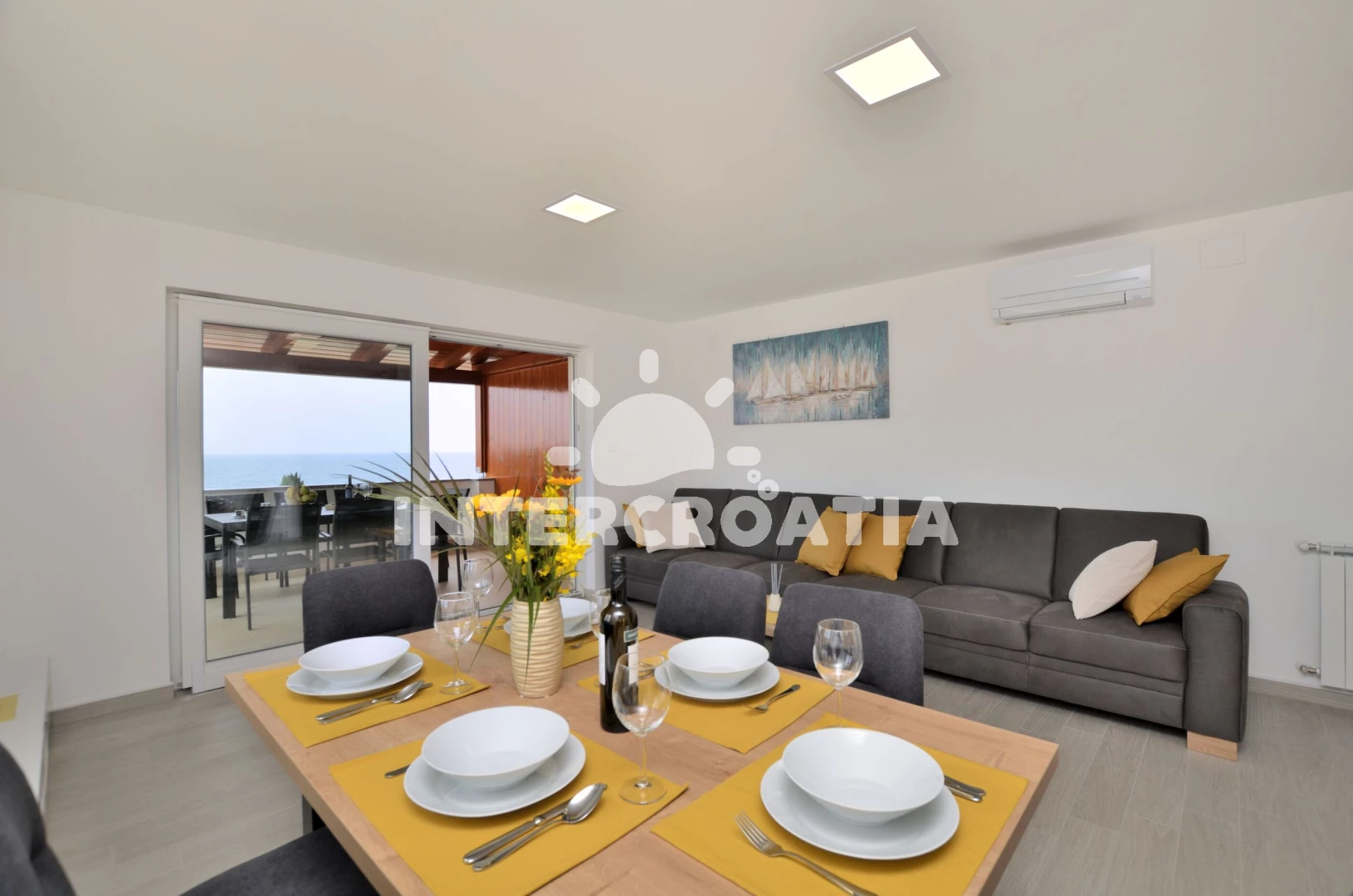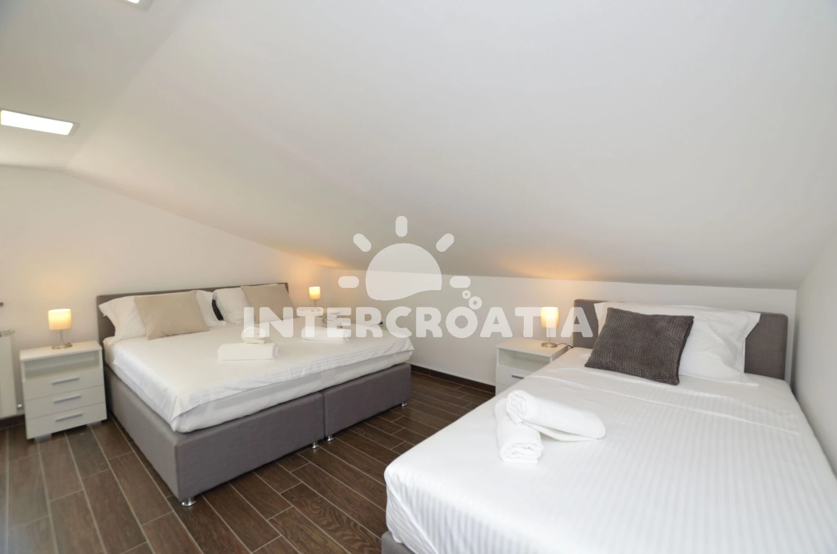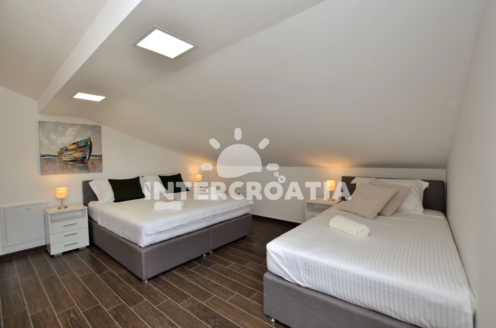 Apartmán (110 m2) s terasou, a výhledem na moře. Nachází se ve dvou patrech objektu. Apartmán má 3 ložnice a je vhodný pro až 8 osob. Kuchyňská linka je vybavena varnou deskou, troubou, toustovačem, kávovarem, myčkou na nádobí, mikrovlnnou troubou, rychlovarnou konvicí, nádobím, lednicí, mrazákem. K dispozici televize se satelitním programem, žehlička. První ložnice s dvoulůžkem. Druhá ložnice s dvoulůžkem, přistýlkou. Třetí ložnice s přistýlkou, dvoulůžkem. První koupelna se sprchovým koutem, umyvadlem, fénem a WC. Druhá koupelna se sprchovým koutem, umyvadlem, fénem a WC.