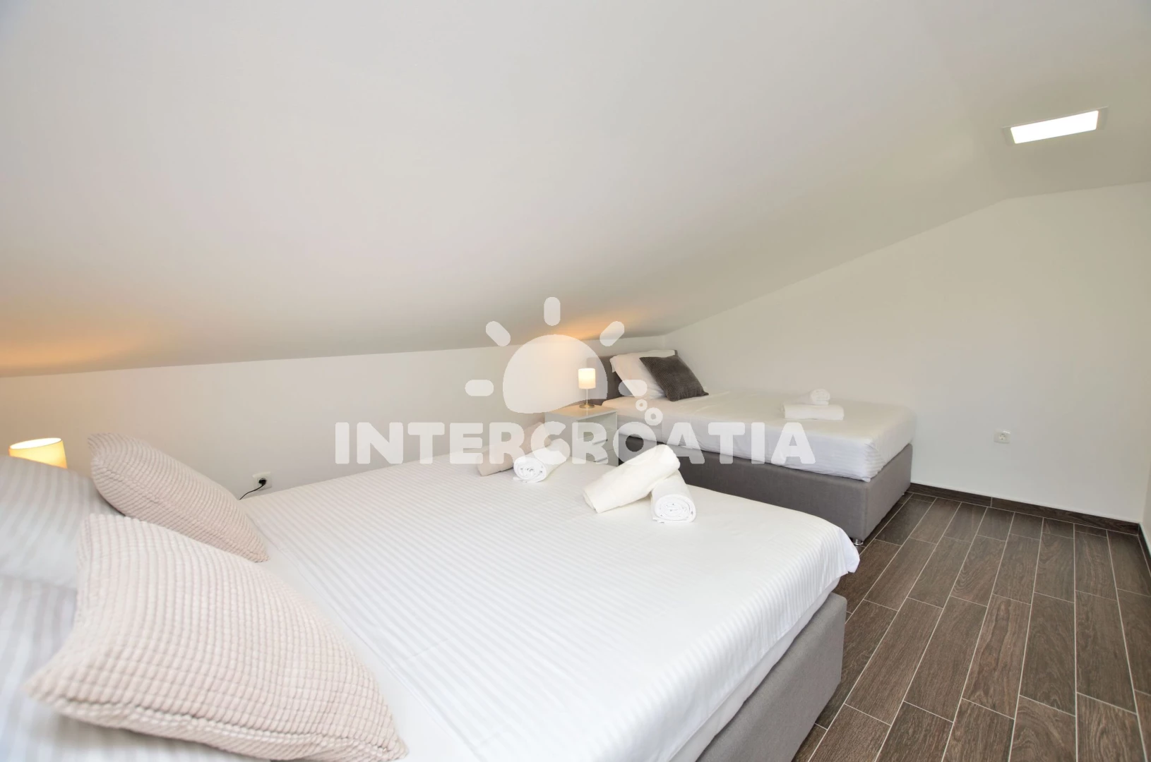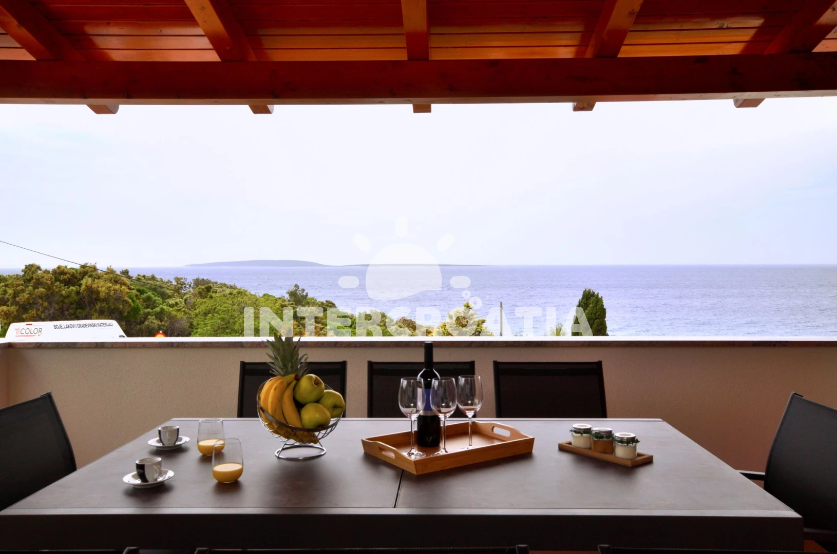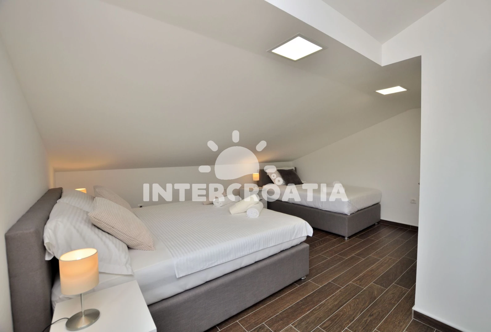 Apartmán (110 m2) s terasou, a výhledem na moře. Nachází se ve dvou patrech objektu. Apartmán má 3 ložnice a je vhodný pro až 8 osob. Kuchyňská linka je vybavena varnou deskou, troubou, toustovačem, kávovarem, myčkou na nádobí, mikrovlnnou troubou, rychlovarnou konvicí, nádobím, lednicí, mrazákem. K dispozici televize se satelitním programem, žehlička. První ložnice s dvoulůžkem. Druhá ložnice s dvoulůžkem, přistýlkou. Třetí ložnice s přistýlkou, dvoulůžkem. První koupelna se sprchovým koutem, umyvadlem, fénem a WC. Druhá koupelna se sprchovým koutem, umyvadlem, fénem a WC.