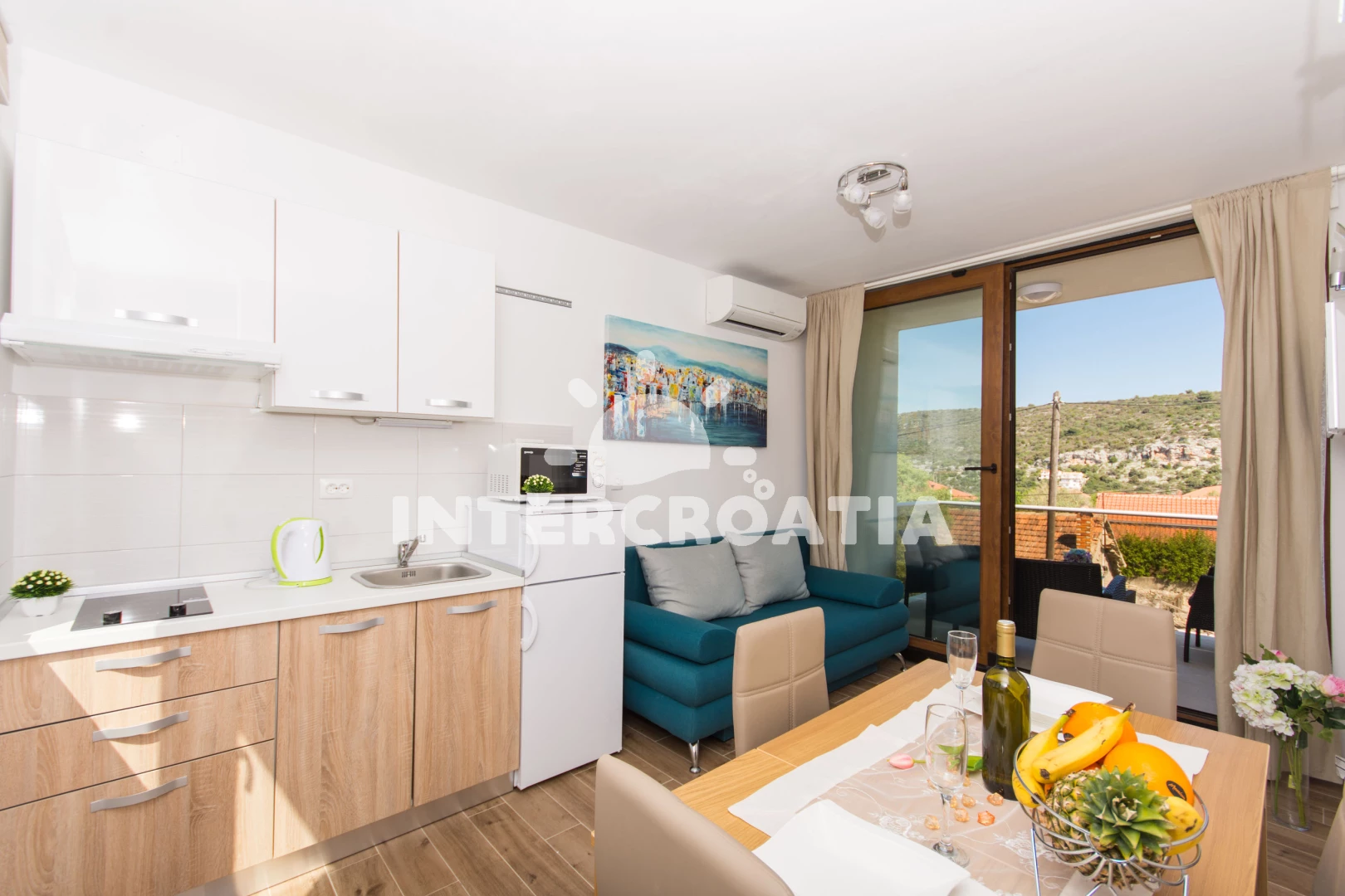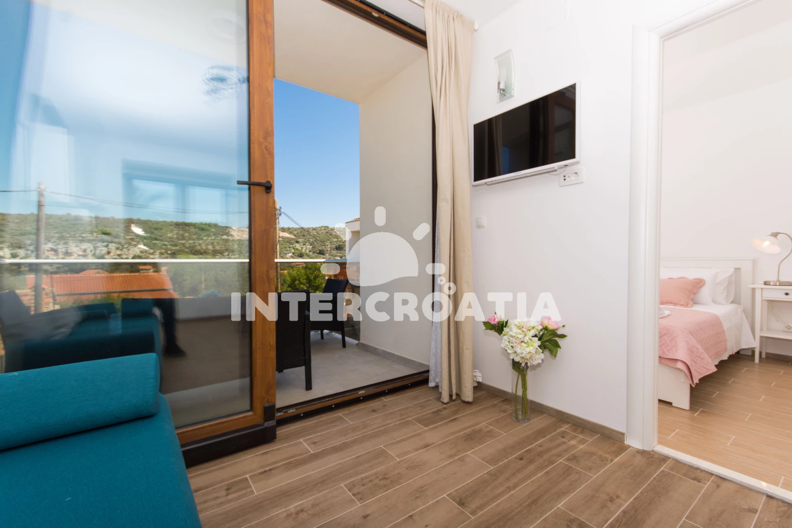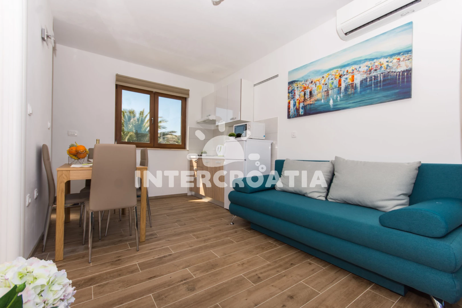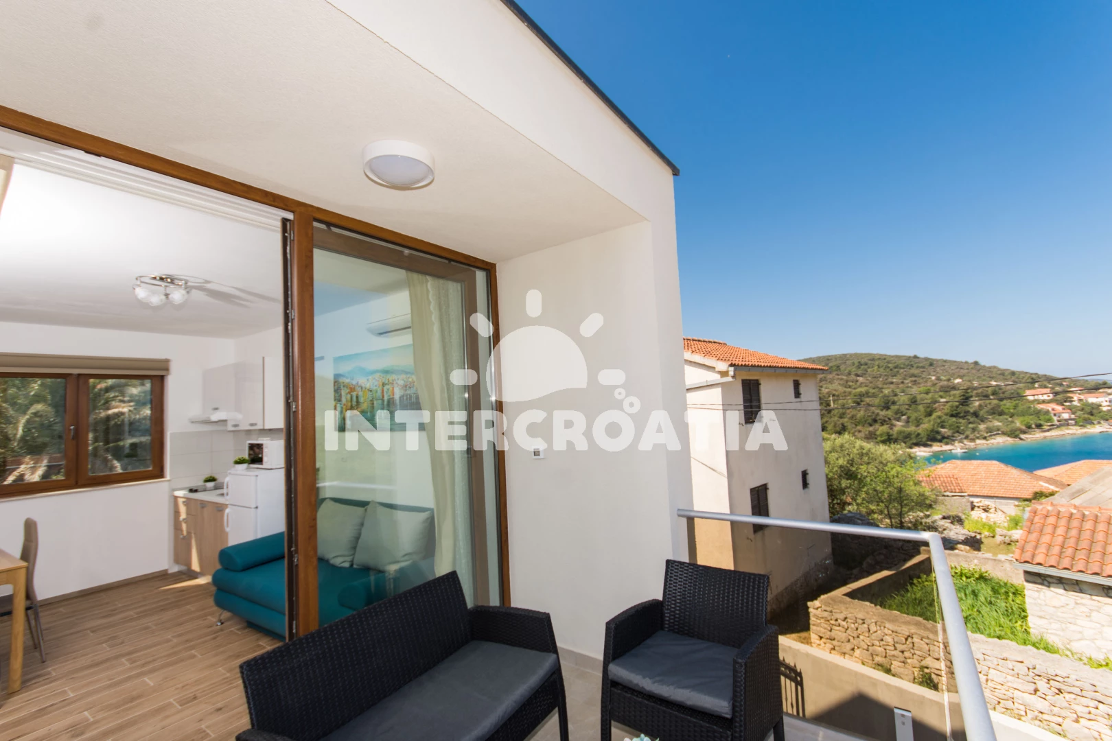 Apartmán (35 m2) s balkonem, a výhledem na moře. Nachází se v 1. patře objektu. Apartmán má 1 ložnici a je vhodný pro až 4 osoby. Kuchyňská linka je vybavena varnou deskou, kávovarem, toustovačem, mikrovlnnou troubou, rychlovarnou konvicí, nádobím, lednicí, mrazákem. V obývací místnosti je rozložitelná pohovka (extra lůžko pro 2 osoby). K dispozici televize se satelitním programem, žehlička. Ložnice s dvoulůžkem. Koupelna se sprchovým koutem, umyvadlem, fénem a WC.