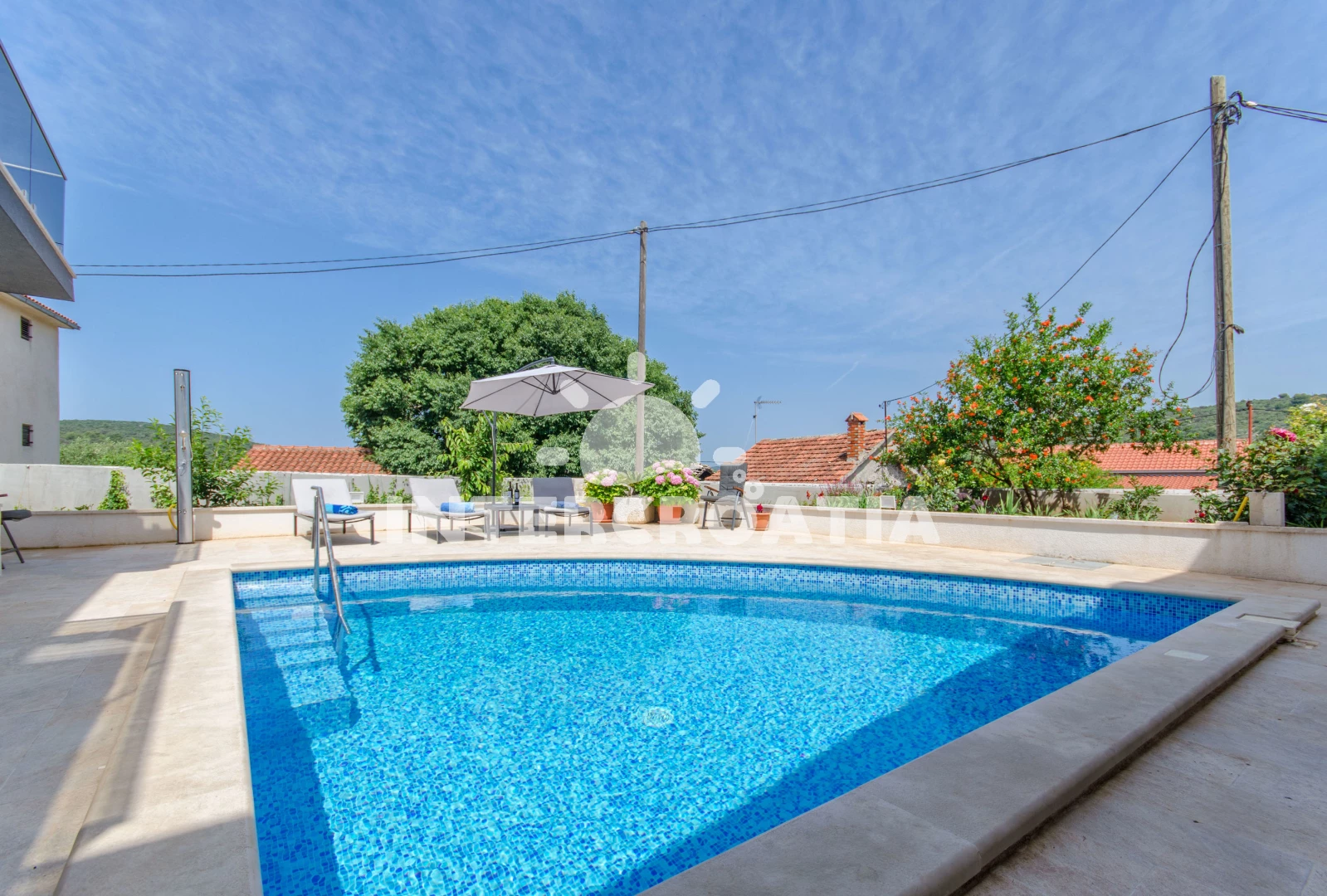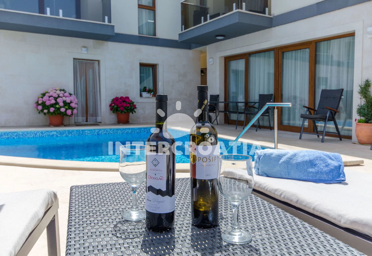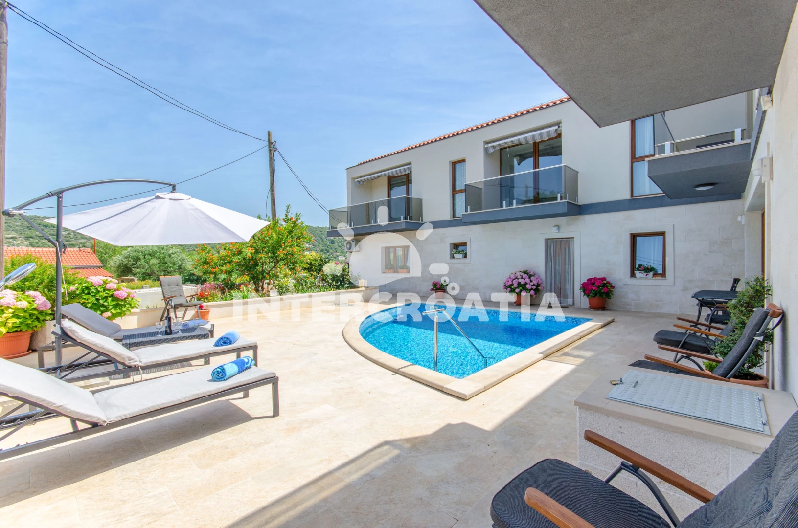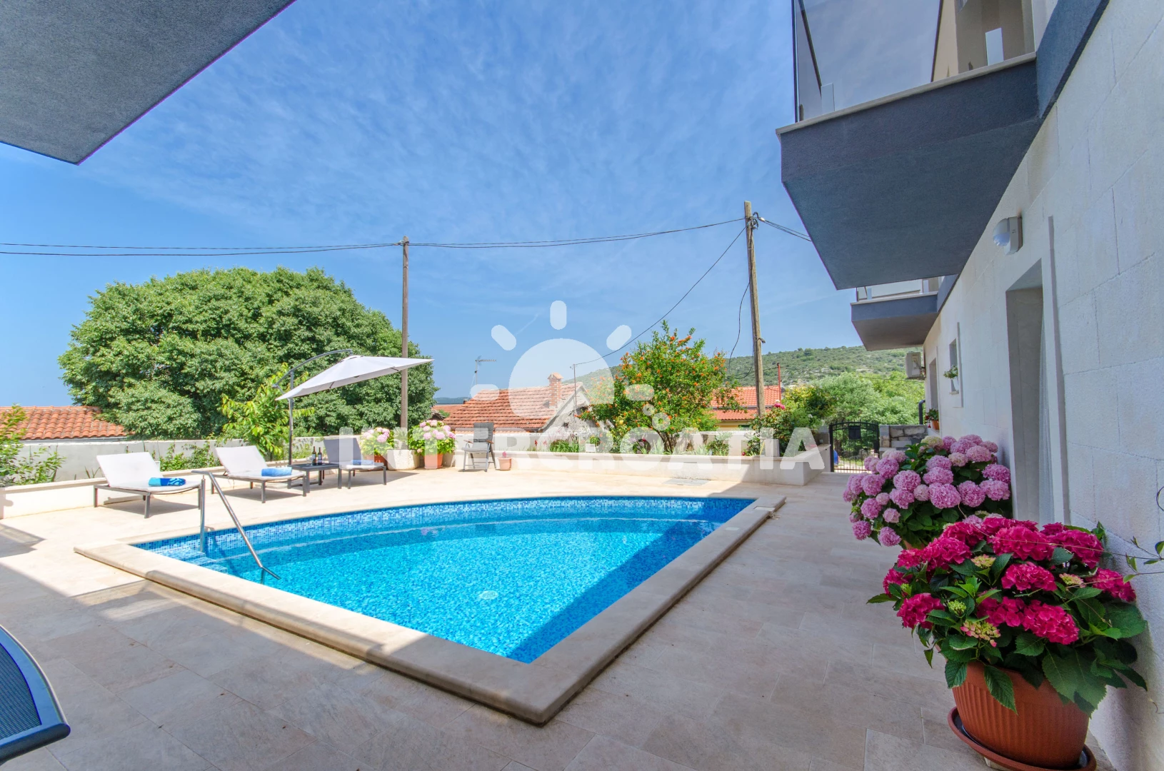 Apartmán se nachází 120 m od moře a pláže. Pláž je betonové desky. Apartmán disponuje bazénem s lehátky pro ubytované hosty. U objektu je k dispozici společná zahrada s posezením a grilem. Parkování je před domem.