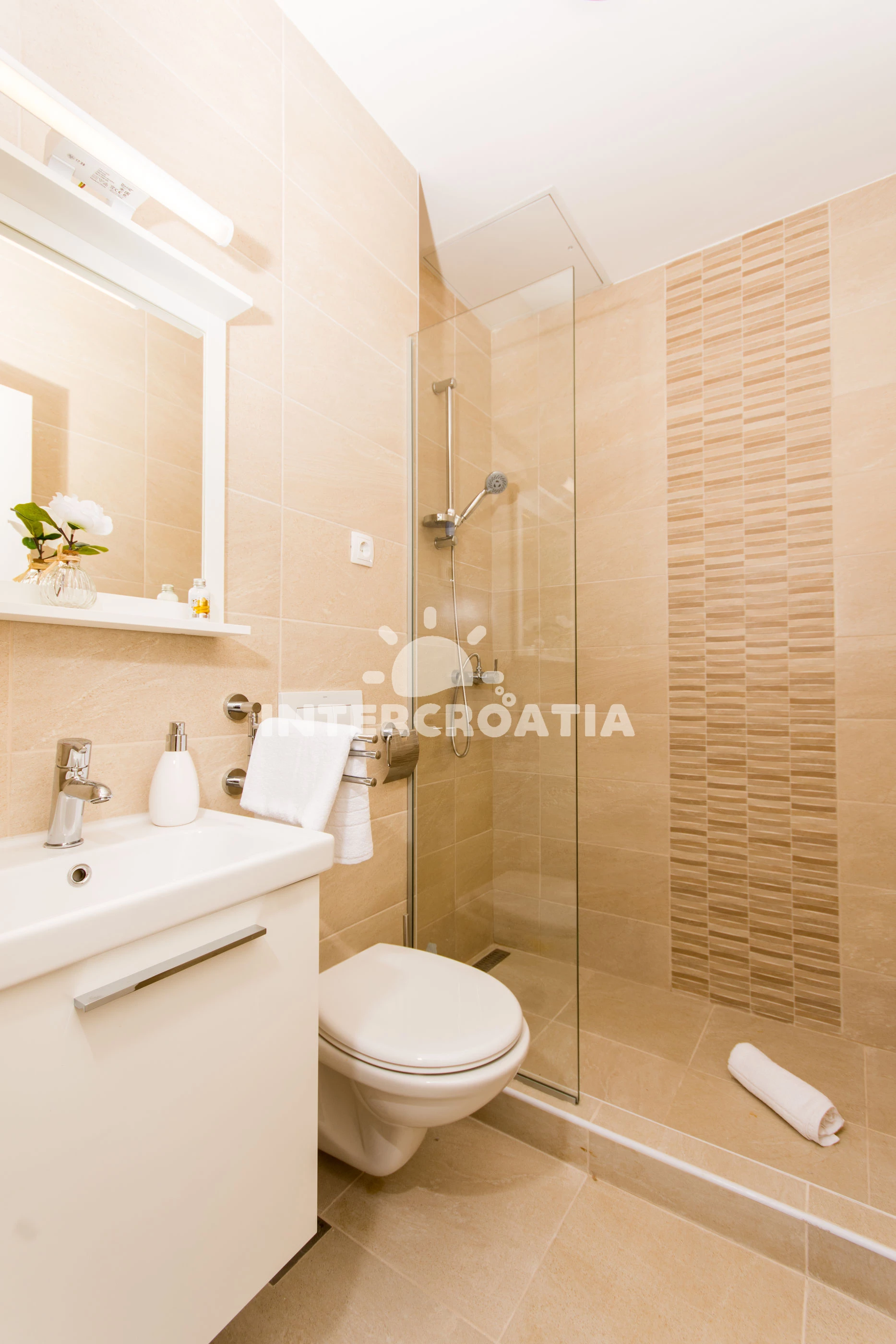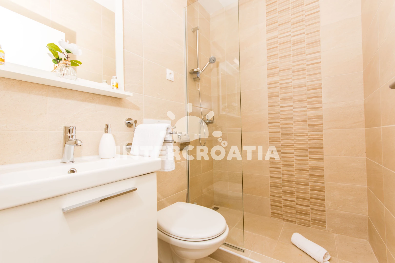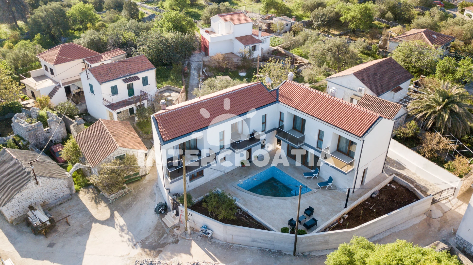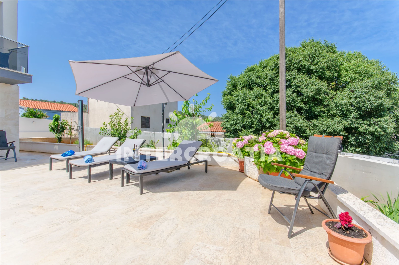 Apartmán se nachází 120 m od moře a pláže. Pláž je betonové desky. Apartmán disponuje bazénem s lehátky pro ubytované hosty. U objektu je k dispozici společná zahrada s posezením a grilem. Parkování je před domem.