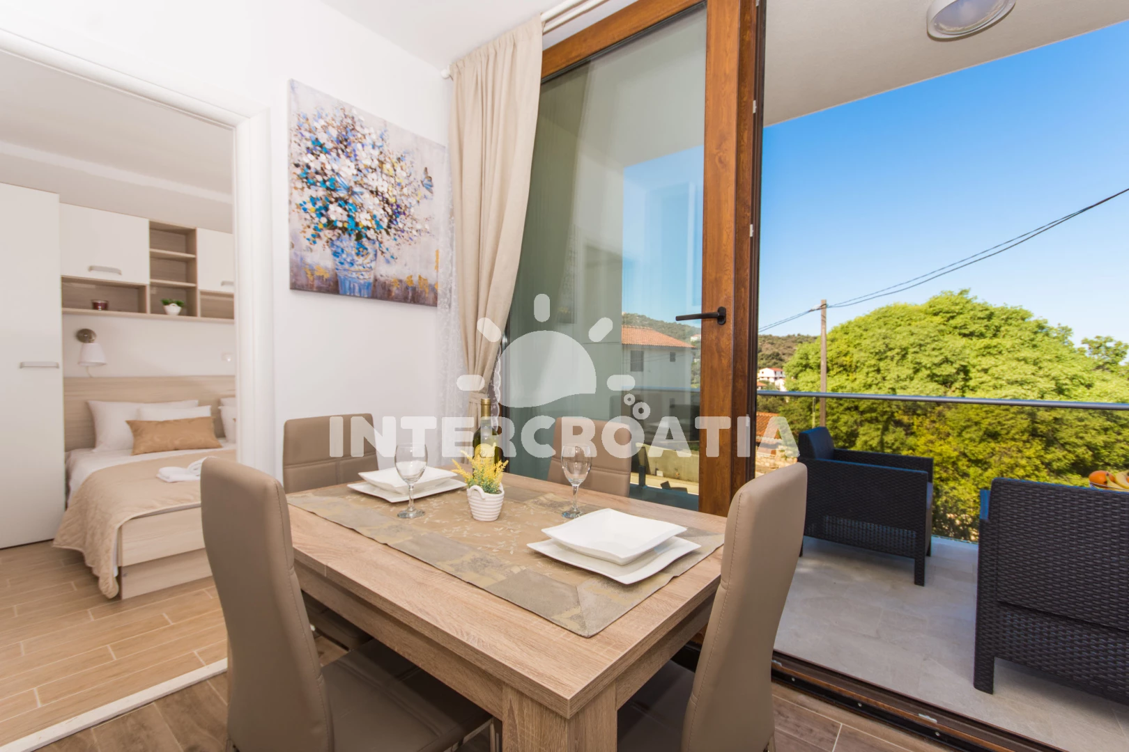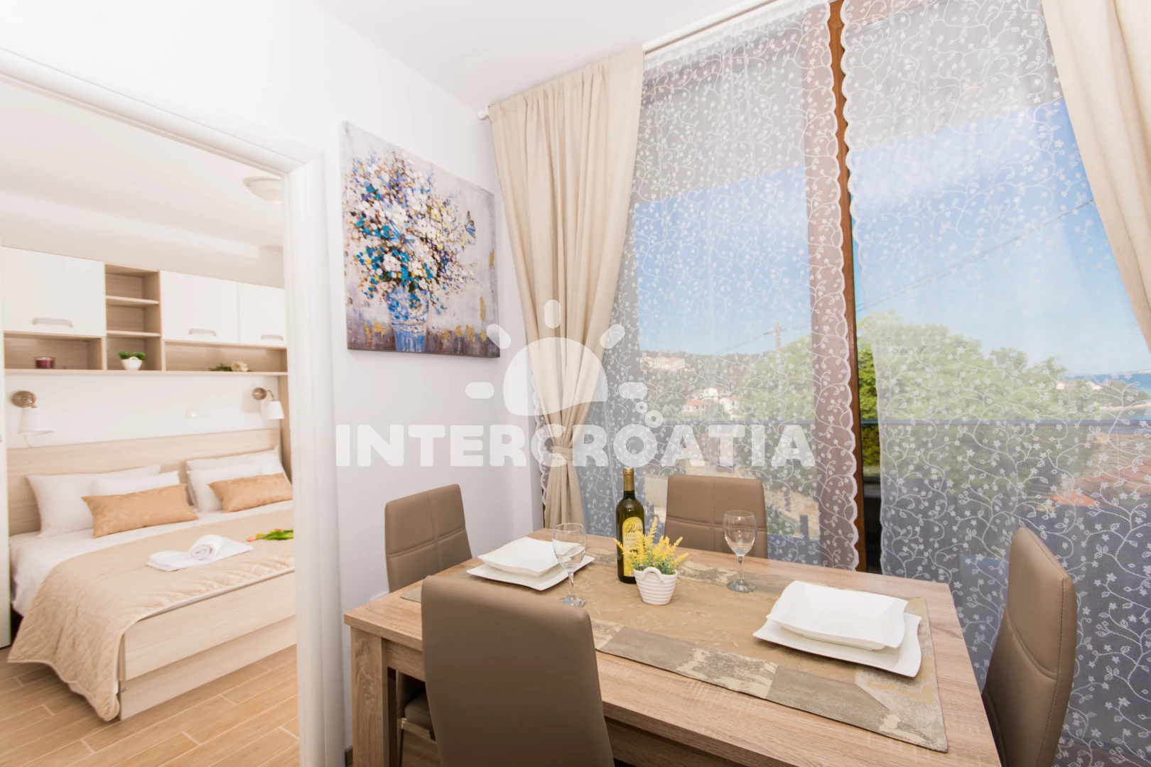 Apartmán (45 m2) s balkonem, a výhledem na moře. Nachází se v 1. patře objektu. Apartmán má 1 ložnici a je vhodný pro až 4 osoby. Kuchyňská linka je vybavena varnou deskou, troubou, kávovarem, toustovačem, mikrovlnnou troubou, rychlovarnou konvicí, nádobím, lednicí, mrazákem. V obývací místnosti je rozložitelná pohovka (extra lůžko pro 2 osoby). K dispozici televize se satelitním programem, žehlička. Ložnice s dvoulůžkem. Koupelna se sprchovým koutem, umyvadlem, fénem a WC.