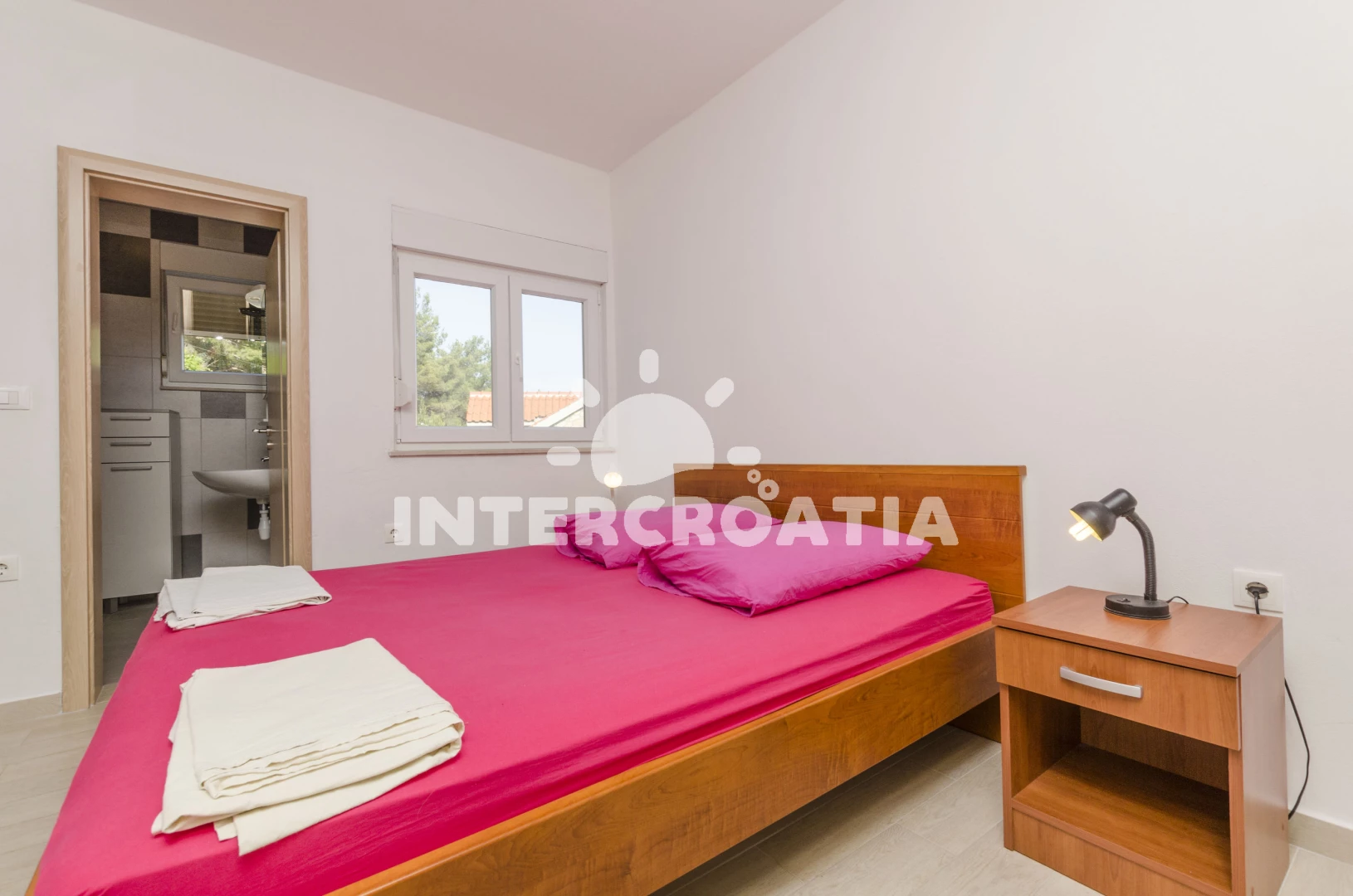 Apartmán (100 m2) s terasou, a výhledem na moře. Nachází se v 1. patře objektu. Apartmán má 2 ložnice a je vhodný pro až 6 osob. Kuchyňská linka je vybavena varnou deskou, troubou, rychlovarnou konvicí, nádobím, lednicí, mrazákem. V obývací místnosti je rozložitelná pohovka (extra lůžko pro 2 osoby). K dispozici televize se satelitním programem, žehlička. První ložnice s dvoulůžkem. Druhá ložnice s dvoulůžkem. První koupelna se sprchovým koutem, umyvadlem, WC. Druhá koupelna se sprchovým koutem, umyvadlem, WC. Hostům je k dispozici parkování u objektu zdarma.