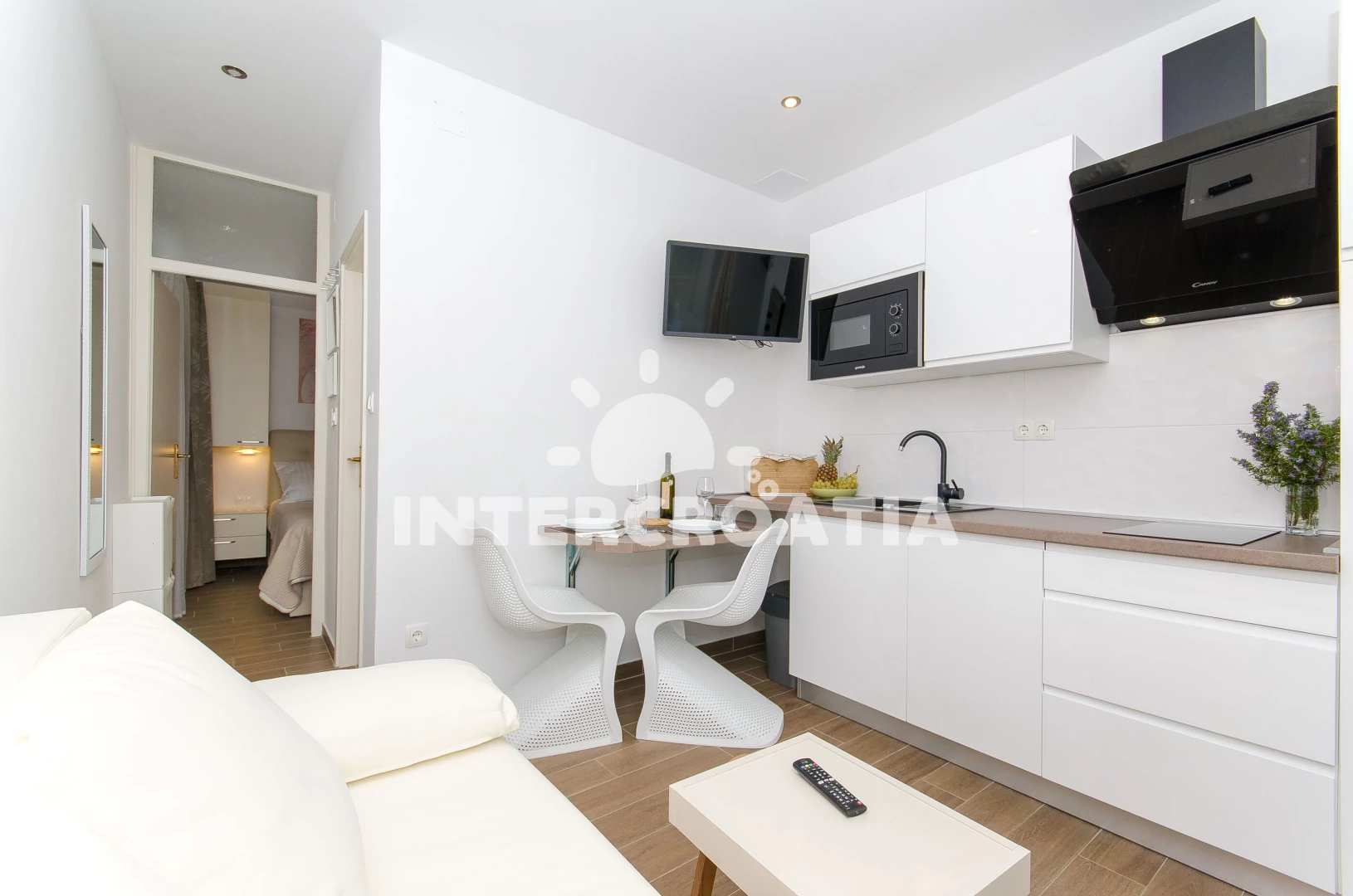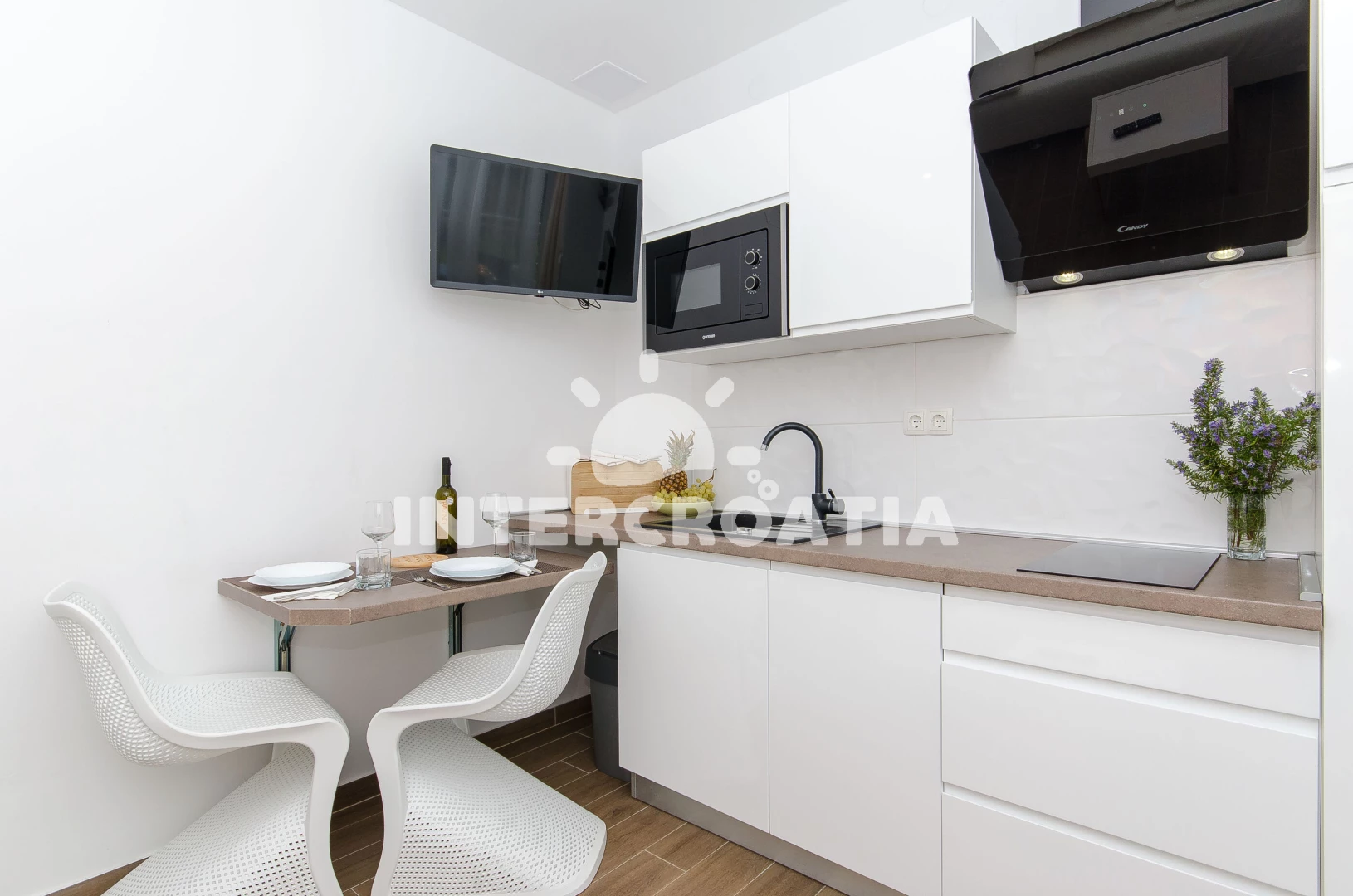 Apartmán (2) s terasou. Nachází se v objektu. Kuchyňská linka je vybavena varnou deskou, kávovarem, toustovačem, myčkou na nádobí, mikrovlnnou troubou, rychlovarnou konvicí, nádobím, lednicí,…