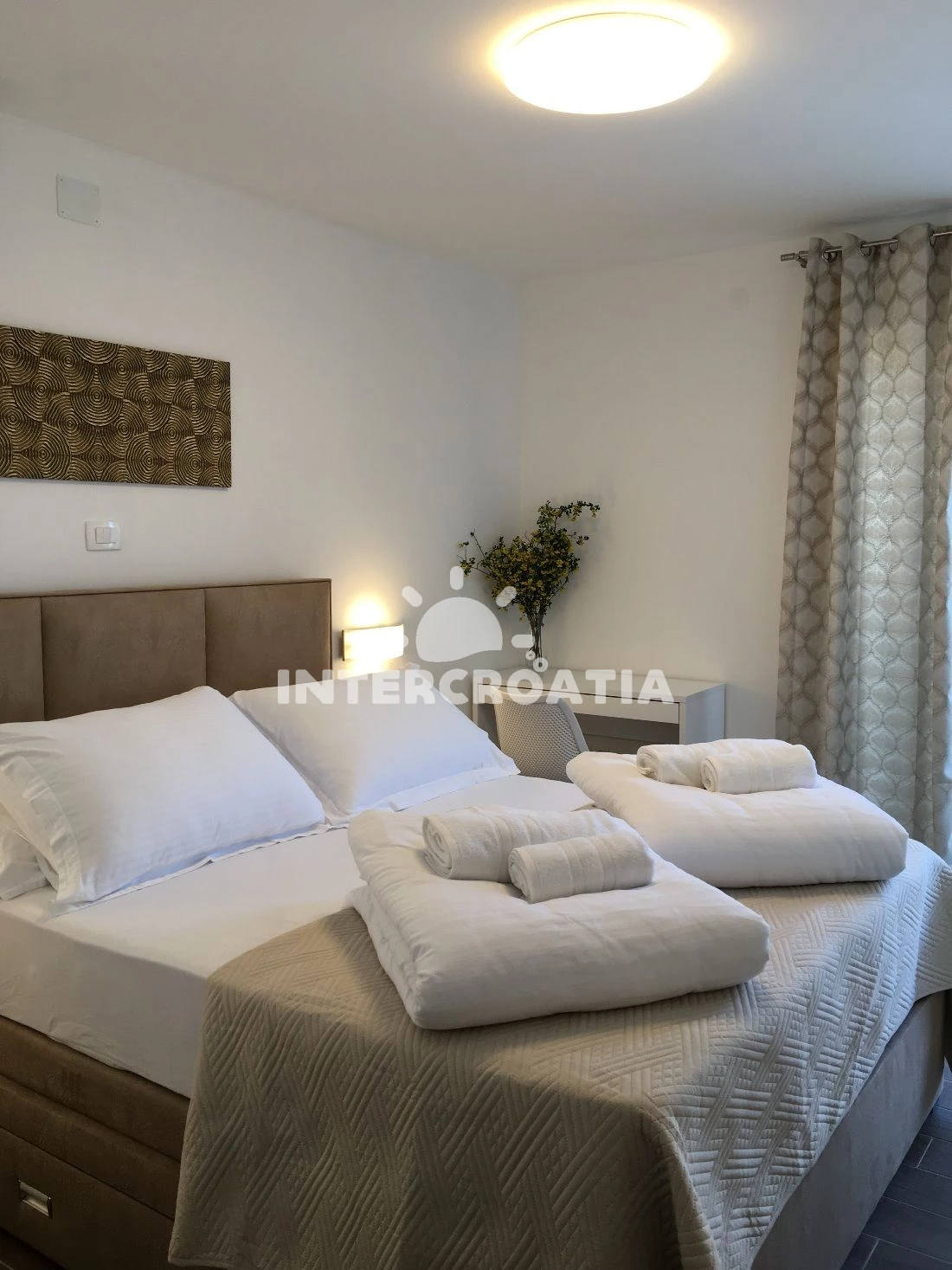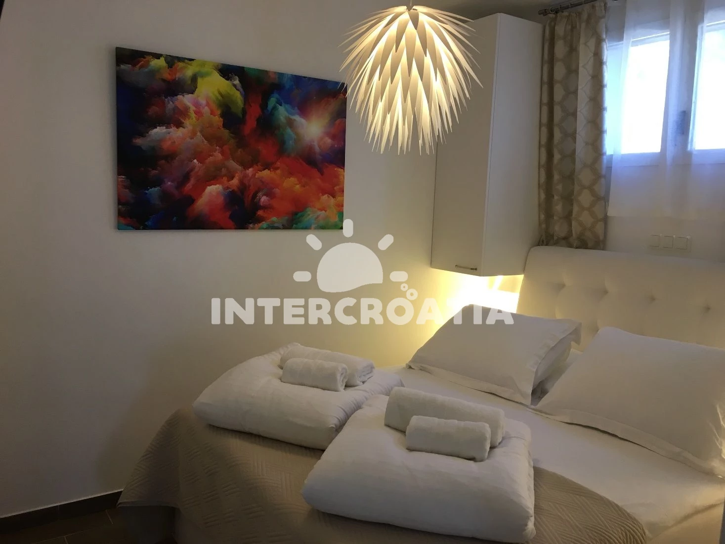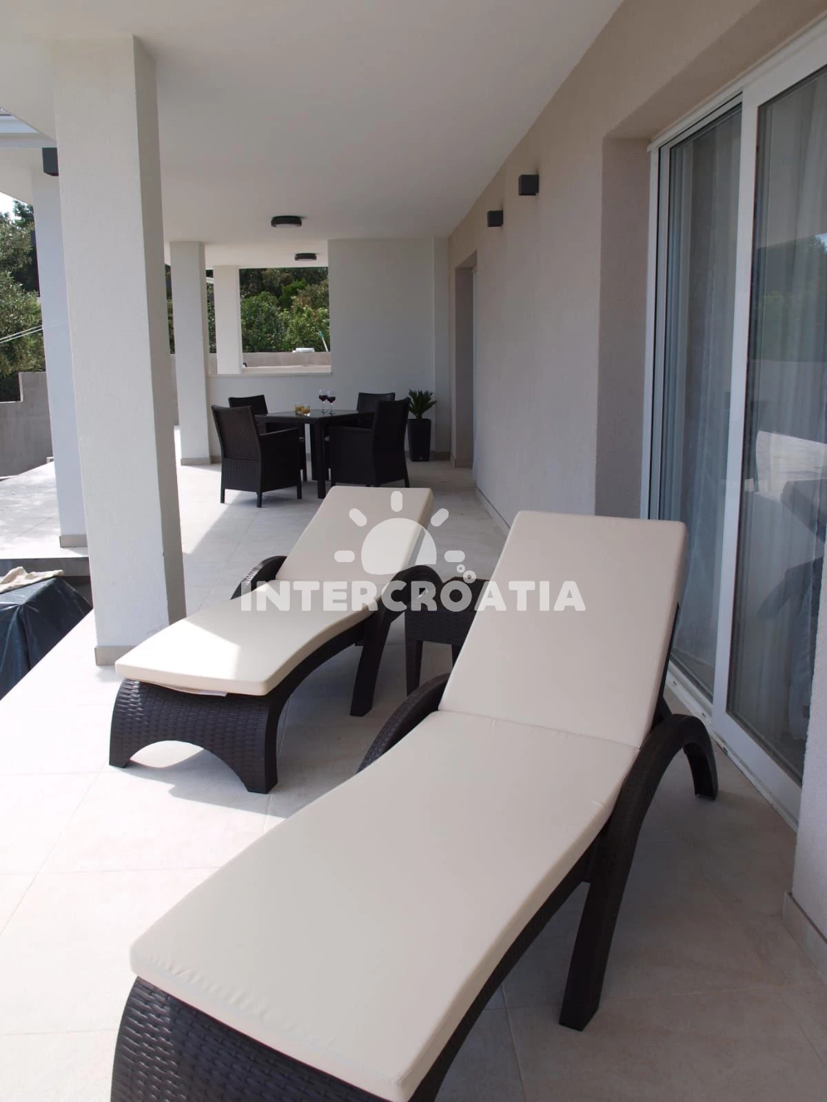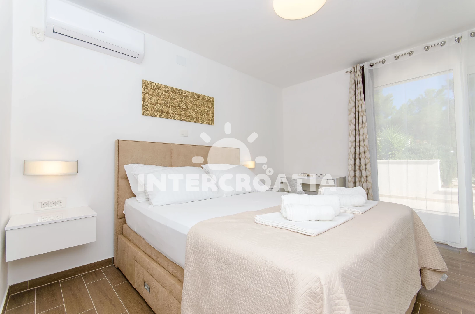 Apartmán se nachází 100 m od moře a pláže. Pláž je skalnatá a oblázková. Apartmán disponuje bazénem s lehátky pro ubytované hosty. U objektu je k dispozici společná zahrada s posezením a grilem. Parkování je před domem.
