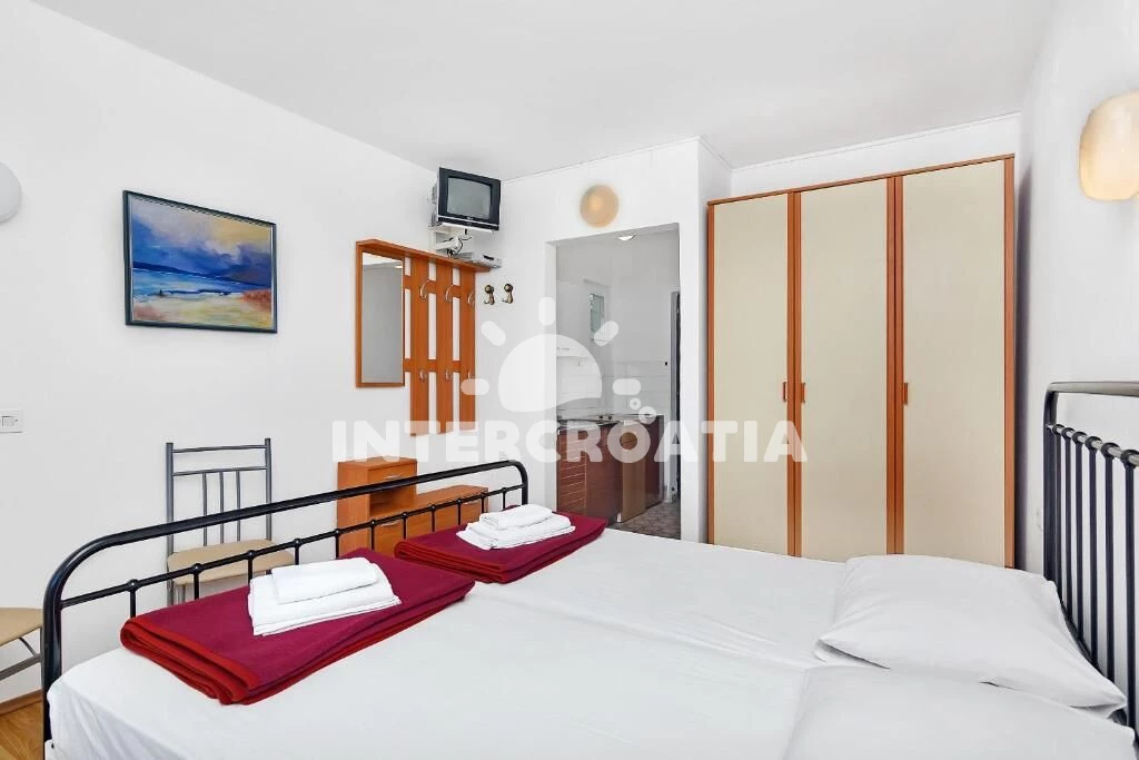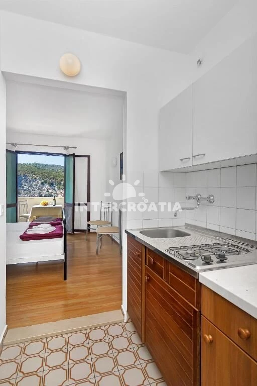 Apartmán typu studio (20 m2) s balkonem, a výhledem na moře. Nachází se ve 2. patře objektu. Kuchyňská linka je vybavena varnou deskou, nádobím, lednicí. K dispozici dvoulůžko, televize se satelitním…