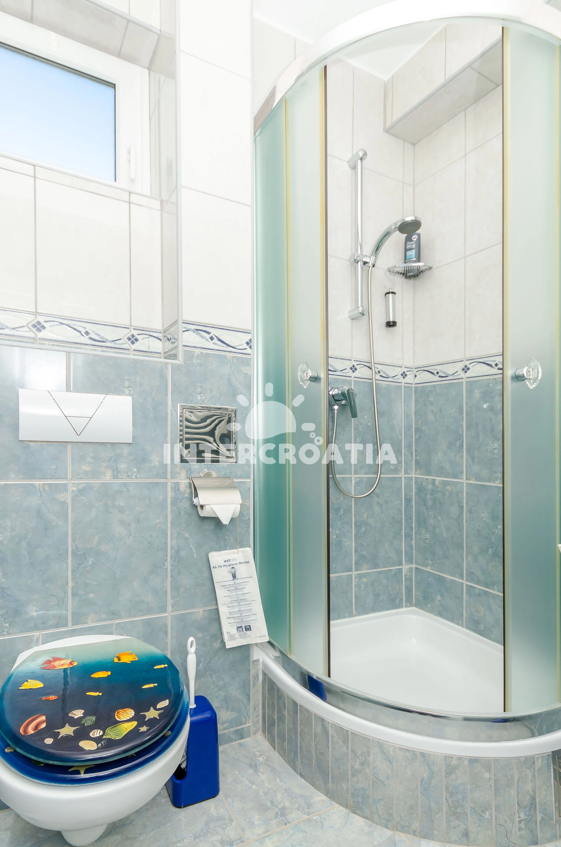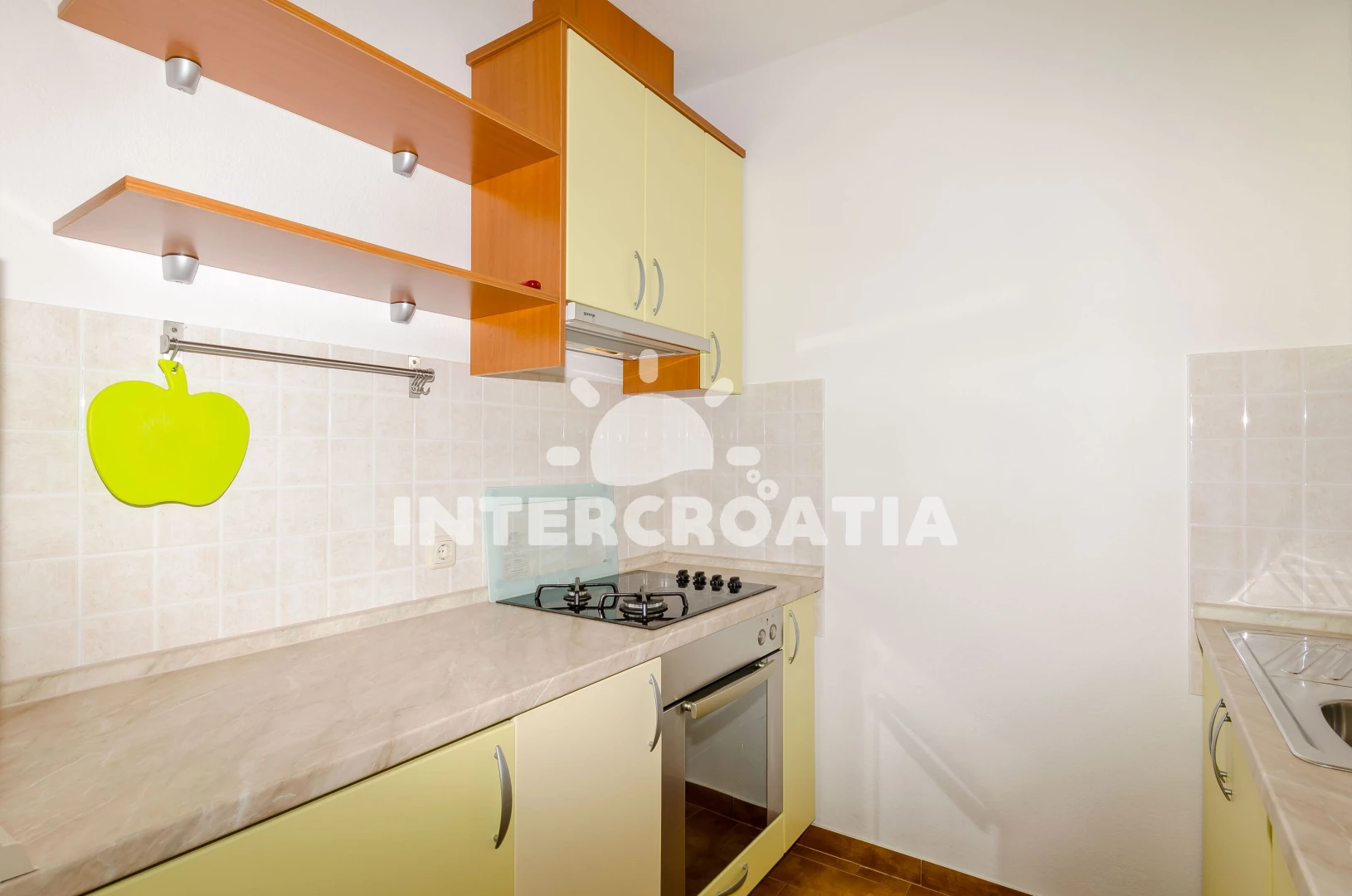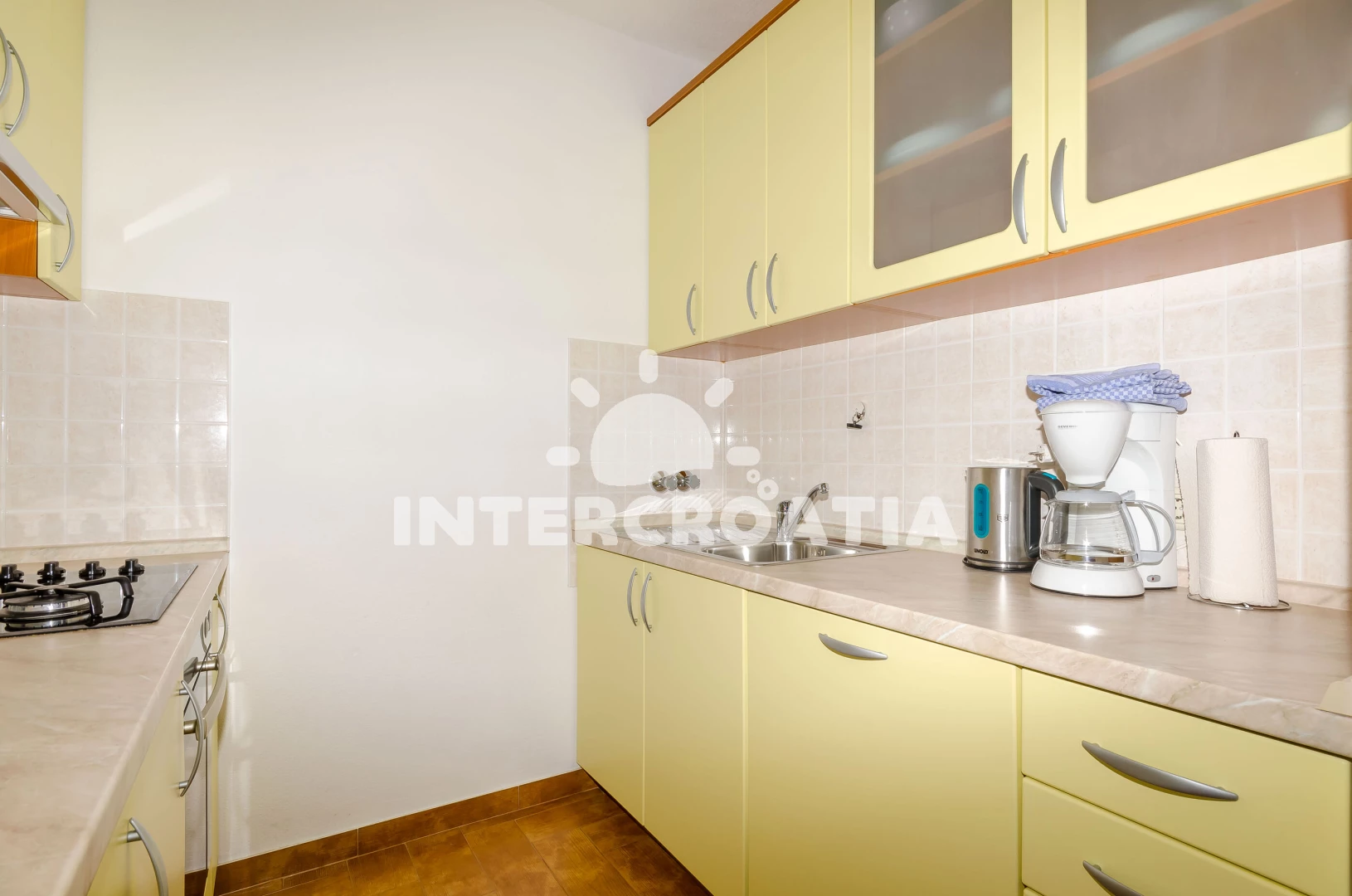 Apartmán se nachází 500 m od moře a pláže. Pláž je skalnatá, oblázková, větší kamení a betonové desky. U objektu je k dispozici společná zahrada s posezením a grilem. Parkování je před domem.
