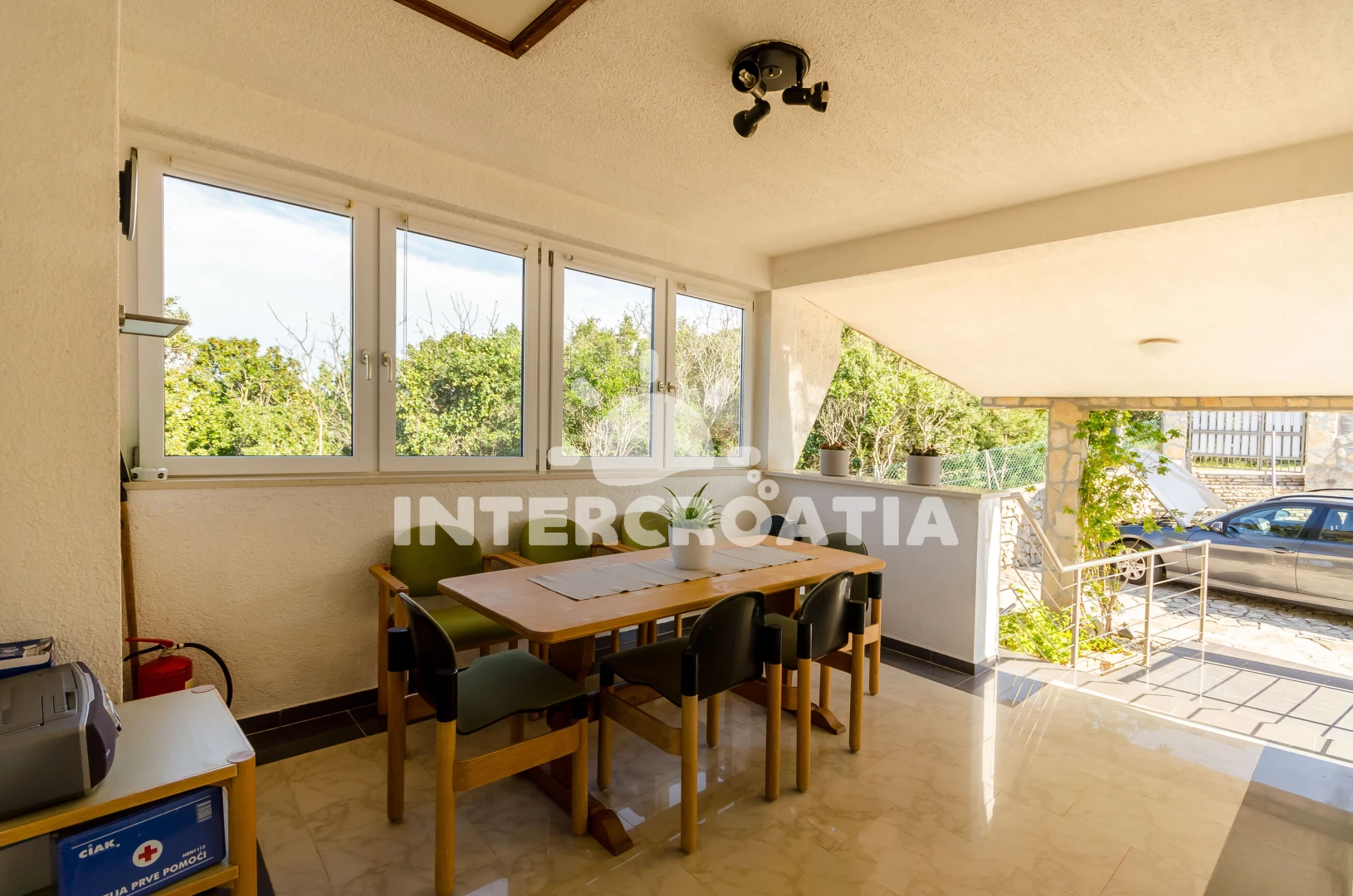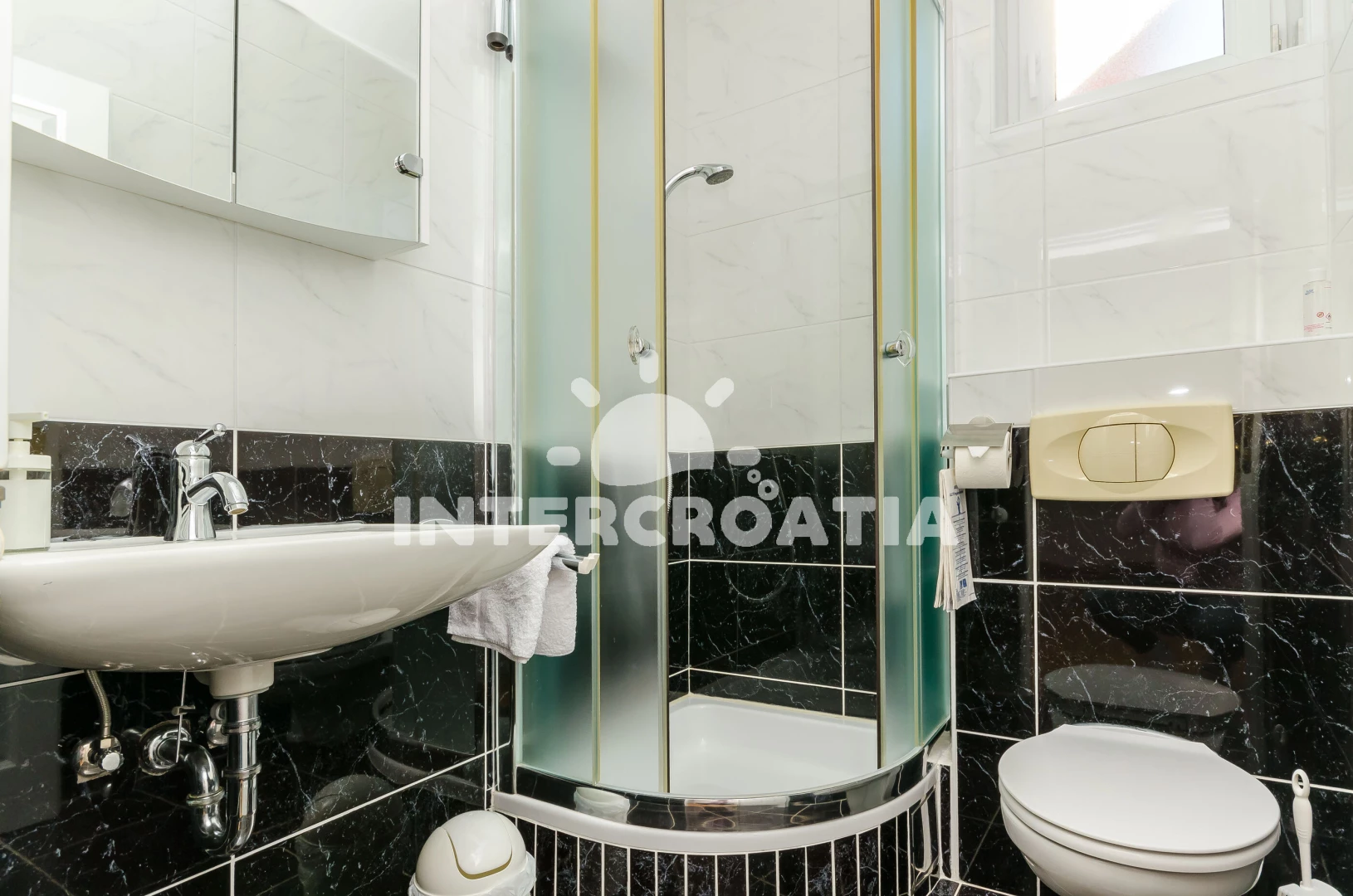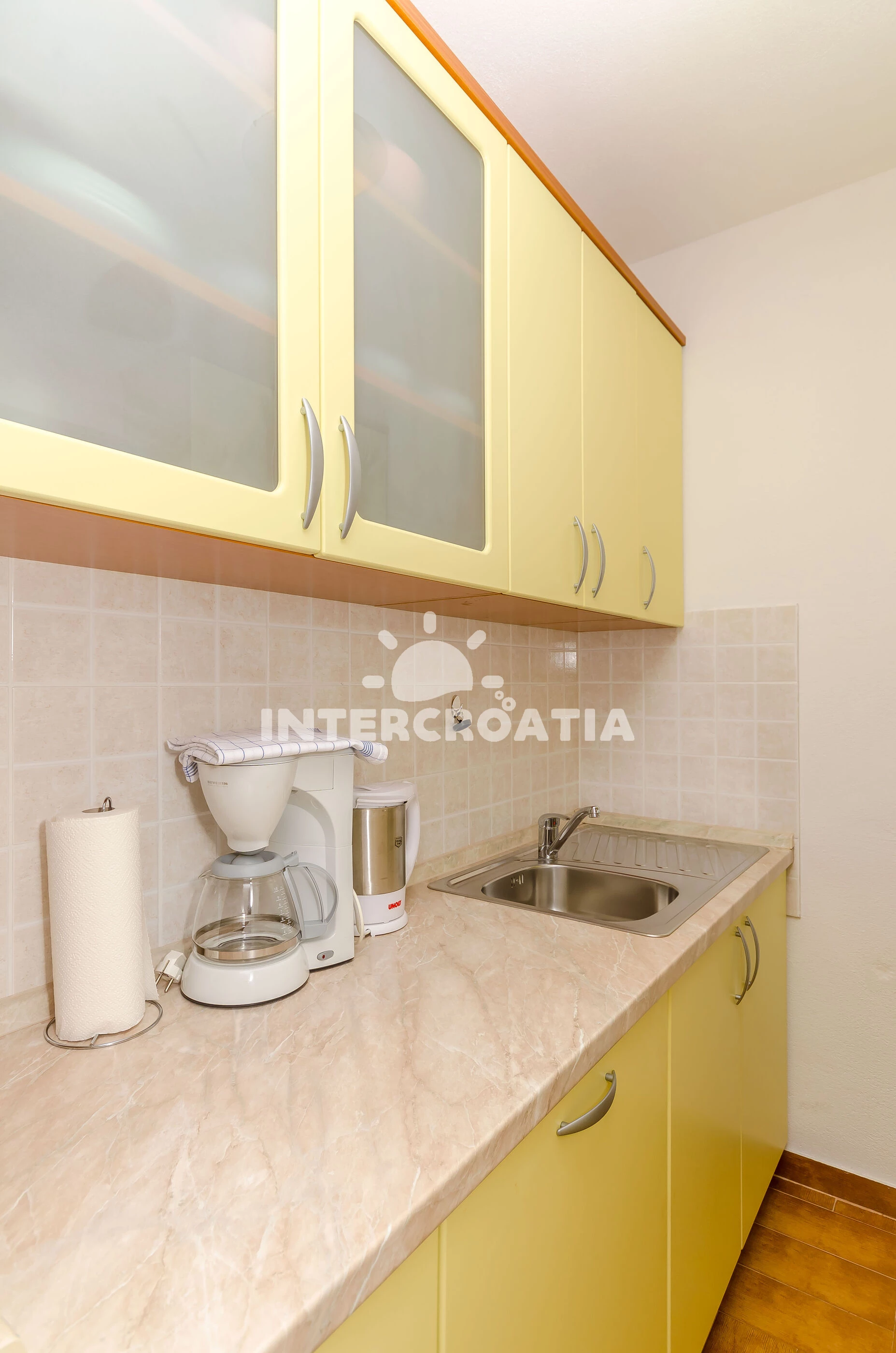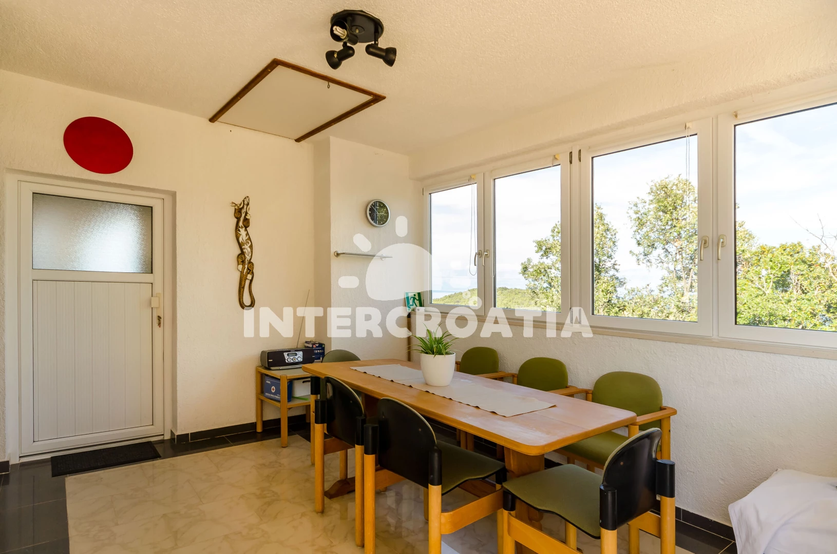 Apartmán se nachází 500 m od moře a pláže. Pláž je skalnatá, oblázková, větší kamení a betonové desky. U objektu je k dispozici společná zahrada s posezením a grilem. Parkování je před domem.