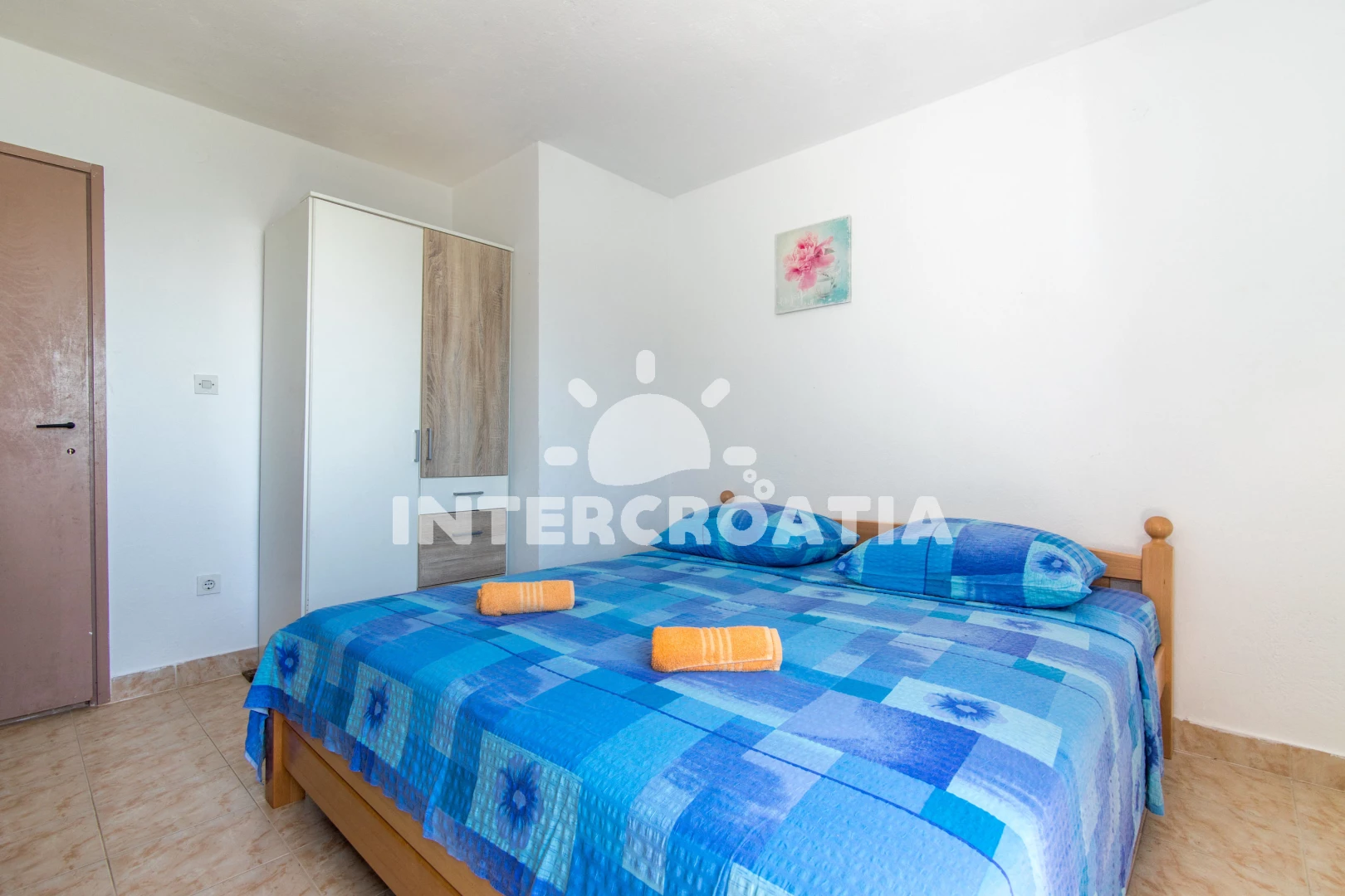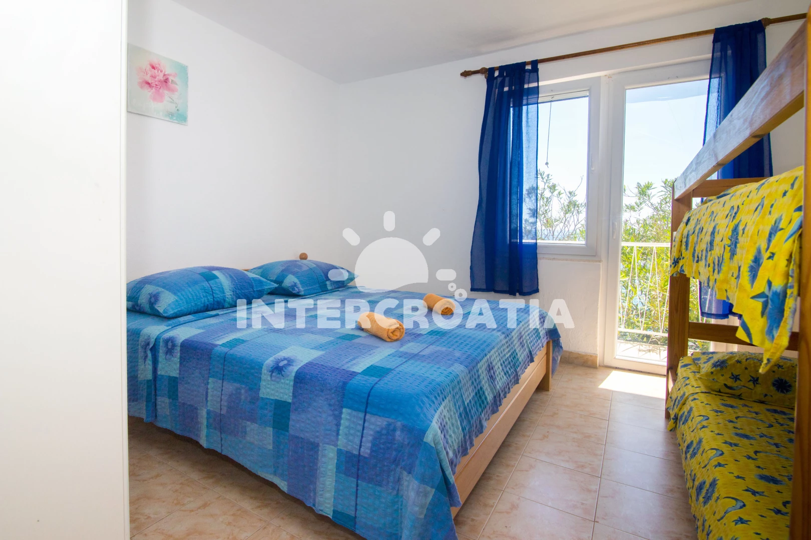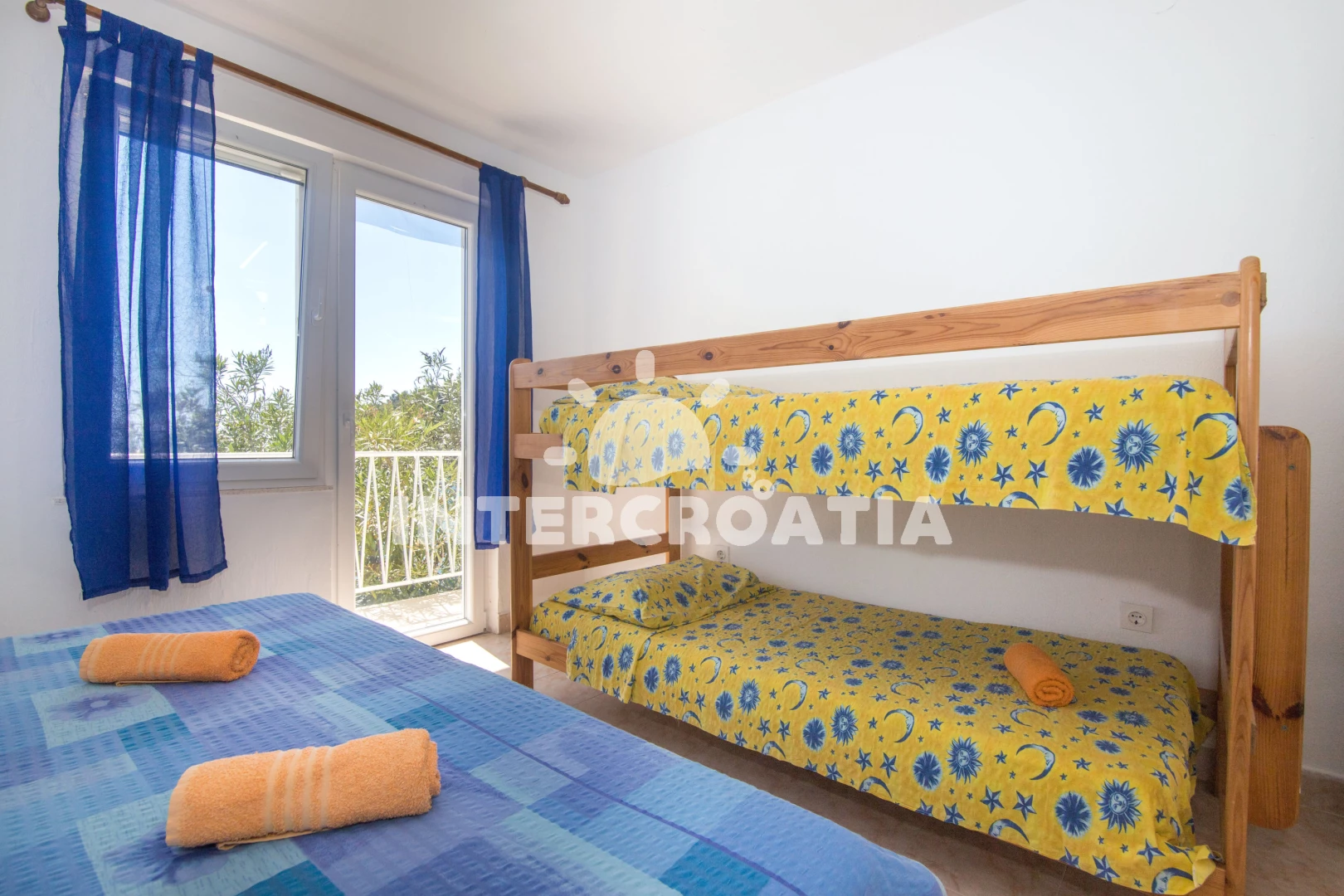 Apartmán (43 m2) s terasou, s balkonem, a výhledem na moře. Nachází se v 1. patře objektu. Apartmán má 2 ložnice a je vhodný pro až 4 osoby. Kuchyňská linka je vybavena varnou deskou, troubou, nádobím, lednicí, mrazákem. První ložnice s dvoulůžkem. Druhá ložnice s dvoulůžkem. Koupelna se sprchovým koutem, umyvadlem, WC.