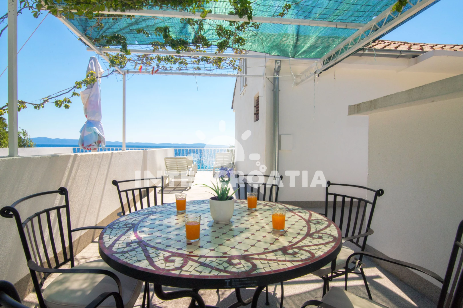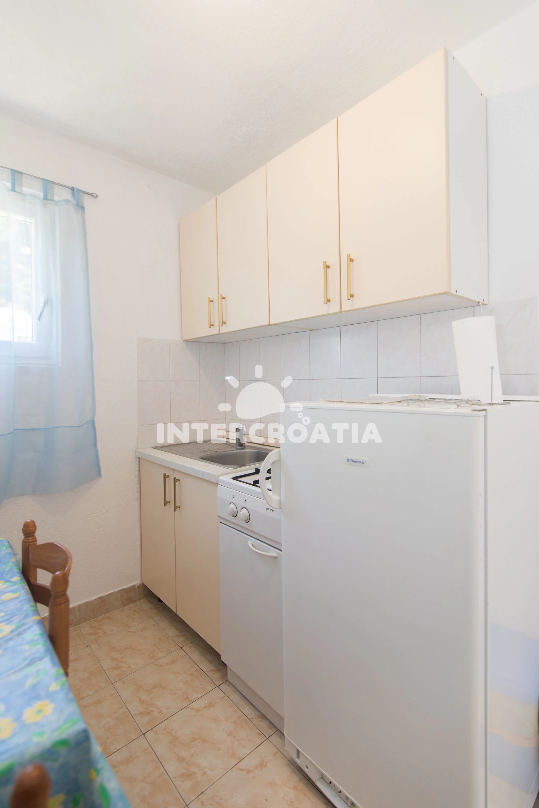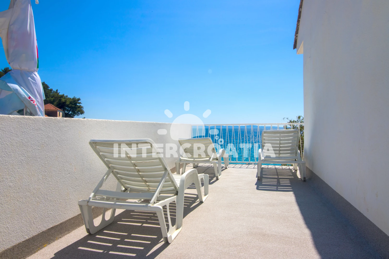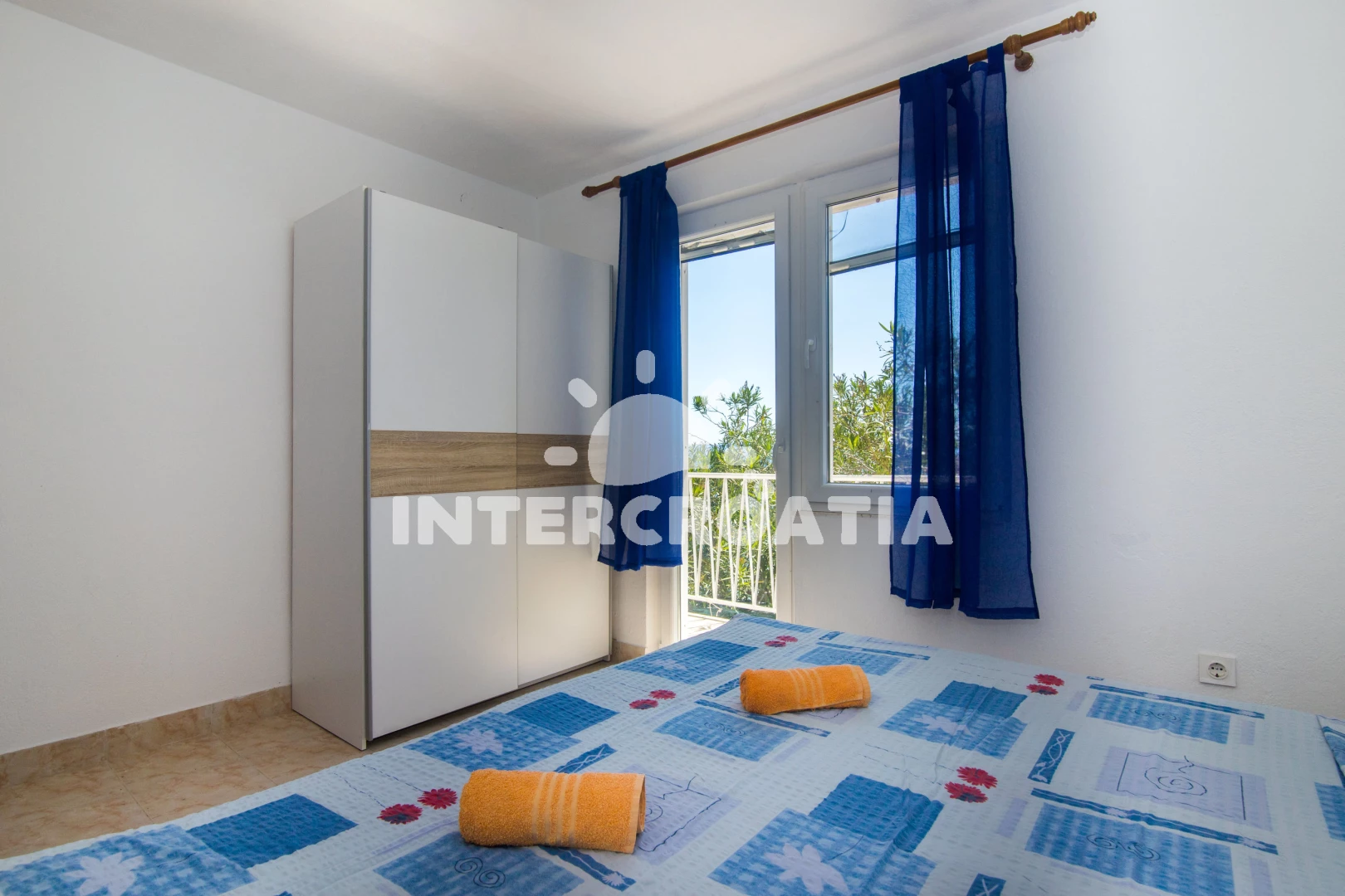 Apartmán (43 m2) s terasou, s balkonem, a výhledem na moře. Nachází se v 1. patře objektu. Apartmán má 2 ložnice a je vhodný pro až 4 osoby. Kuchyňská linka je vybavena varnou deskou, troubou, nádobím, lednicí, mrazákem. První ložnice s dvoulůžkem. Druhá ložnice s dvoulůžkem. Koupelna se sprchovým koutem, umyvadlem, WC.