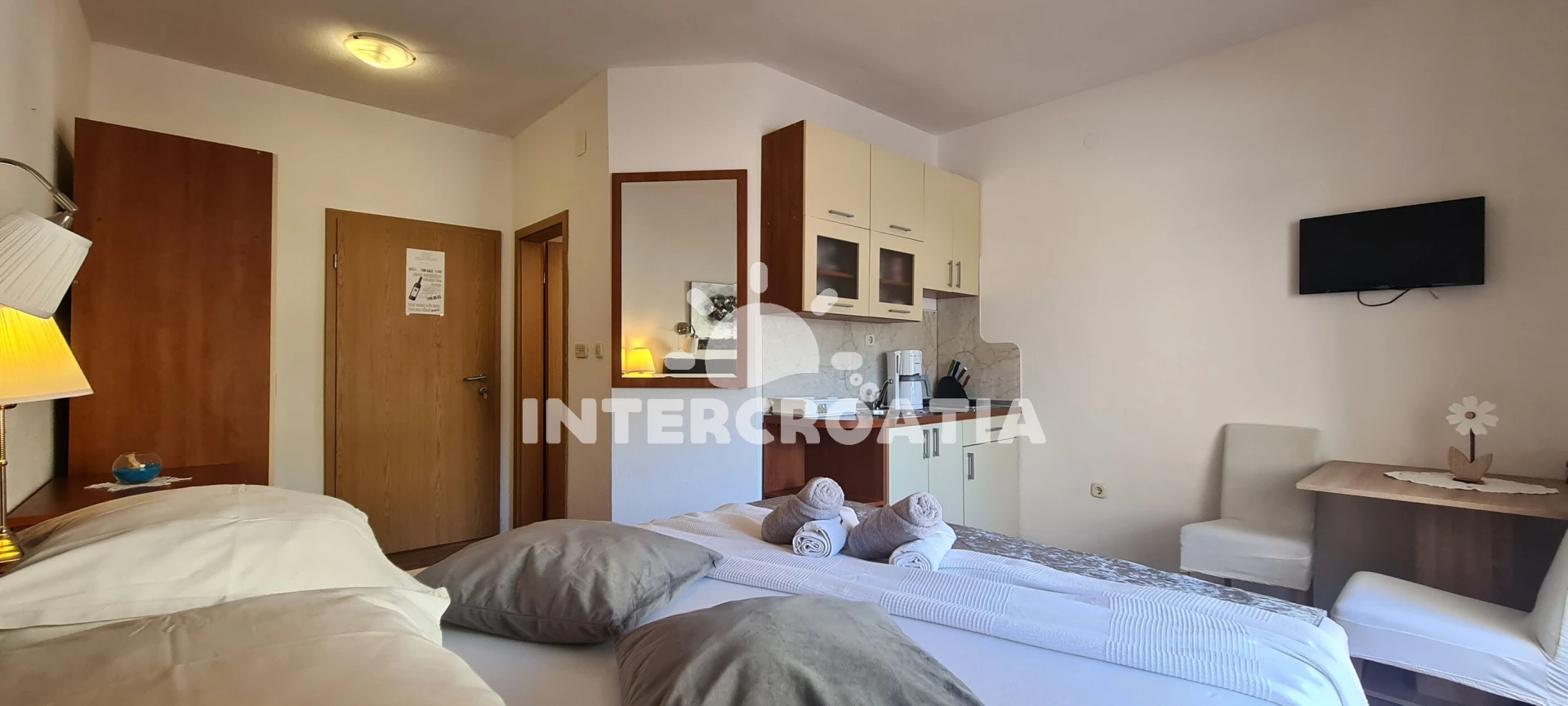 Apartmán typu studio (20 m2) s balkonem. Nachází se v 1. patře objektu. Kuchyňská linka je vybavena varnou deskou, kávovarem, rychlovarnou konvicí, nádobím, lednicí, mrazákem. K dispozici dvoulůžko,…