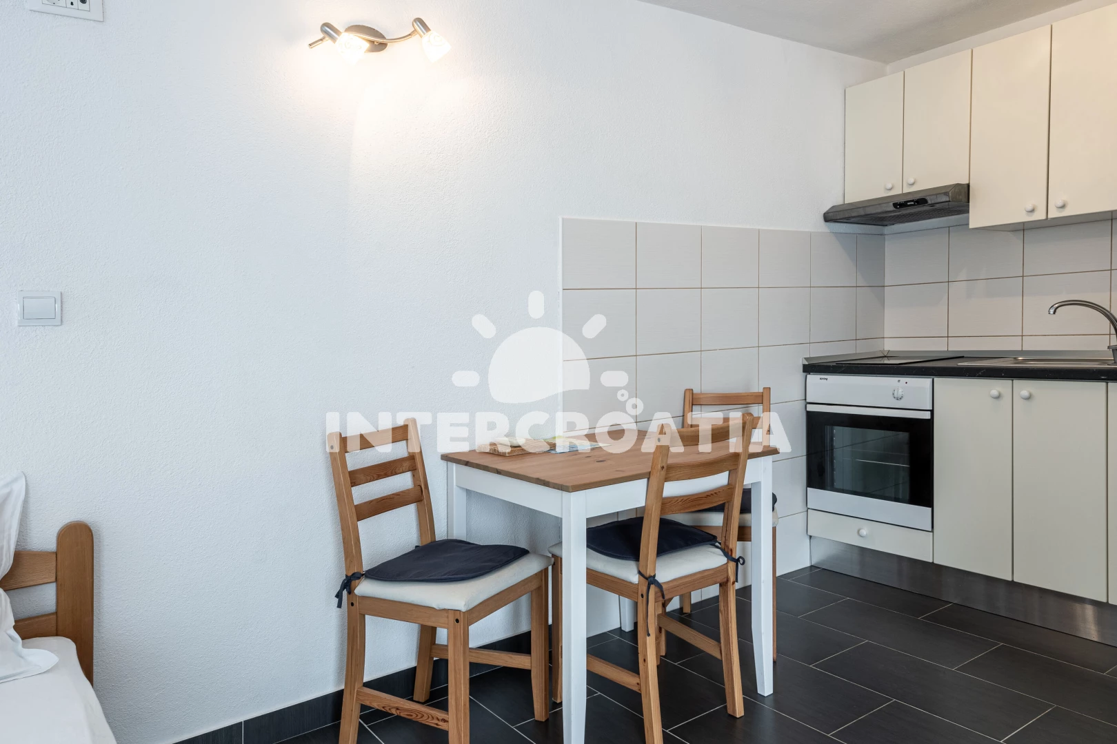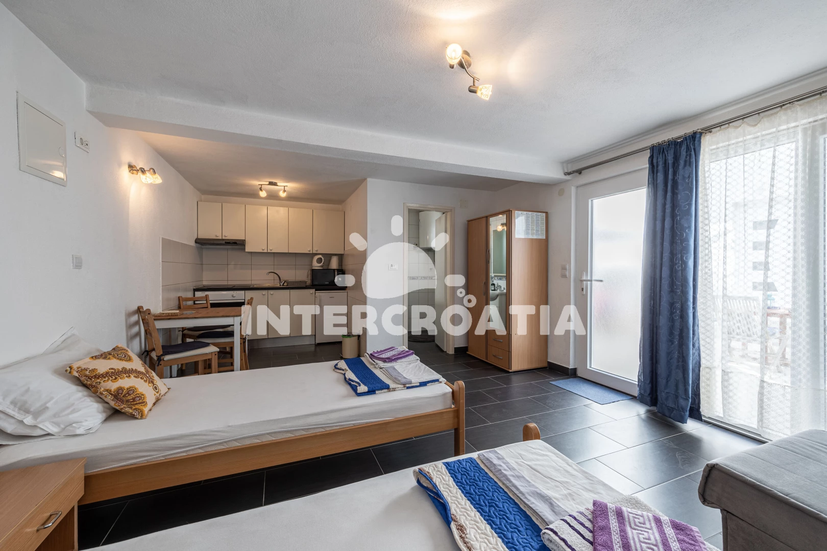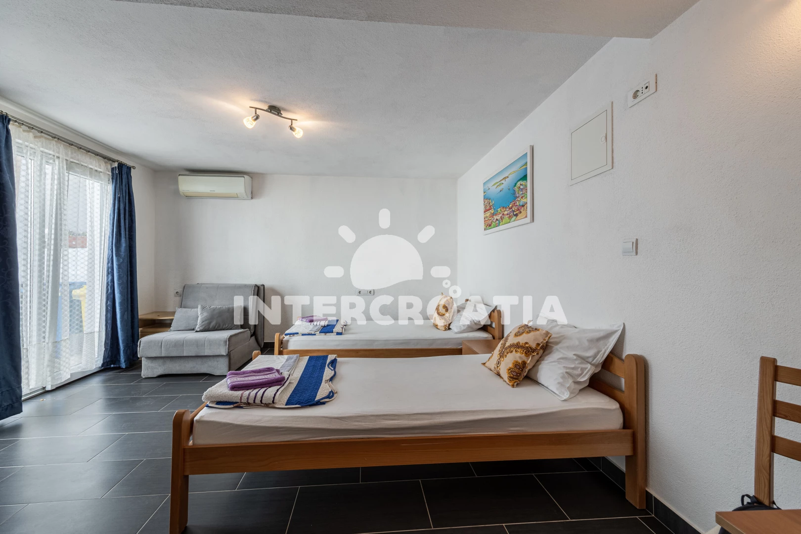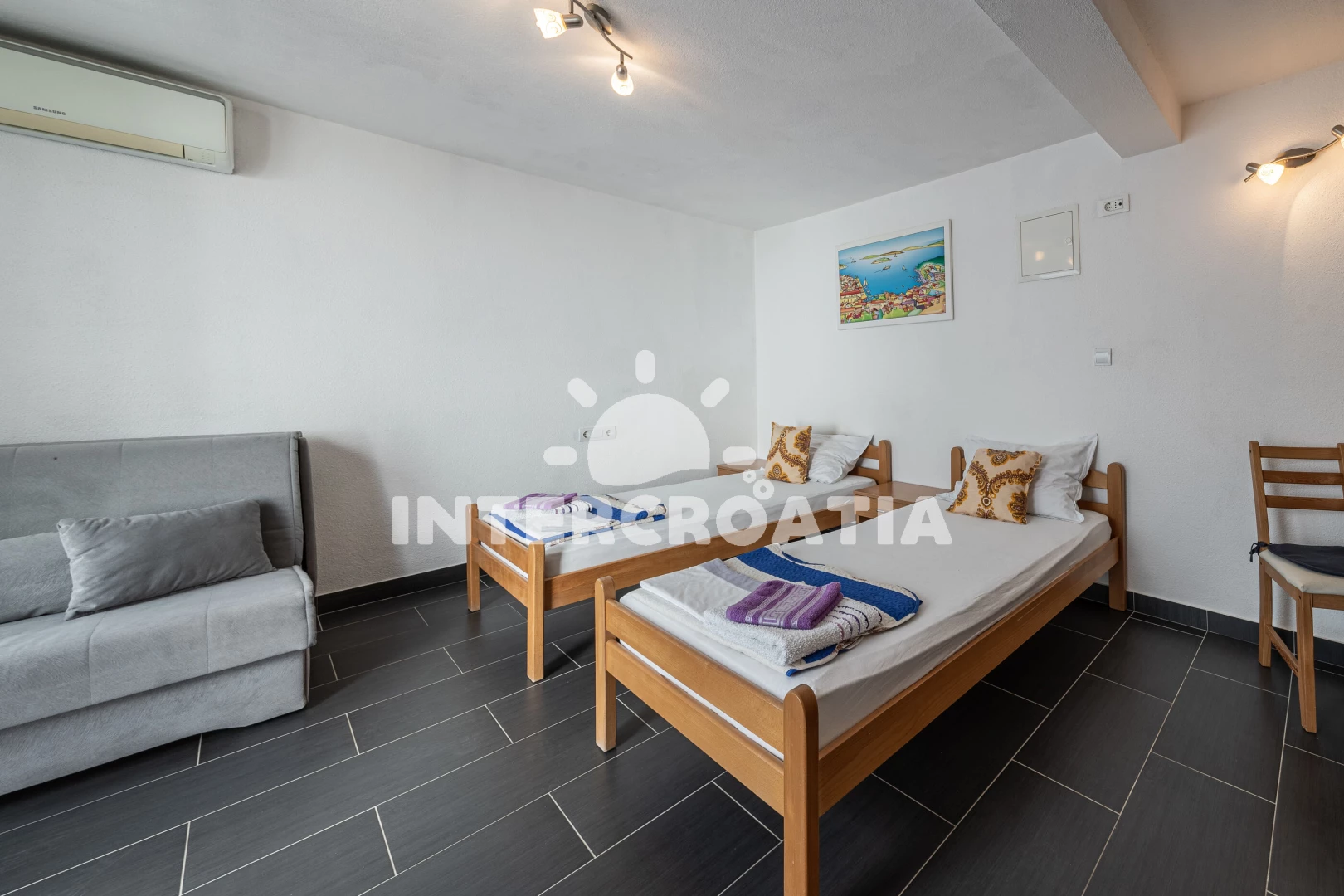 Apartmán se nachází 650 m od moře a pláže. Pláž je skalnatá, oblázková, větší kamení a betonové desky. Parkování je před domem.