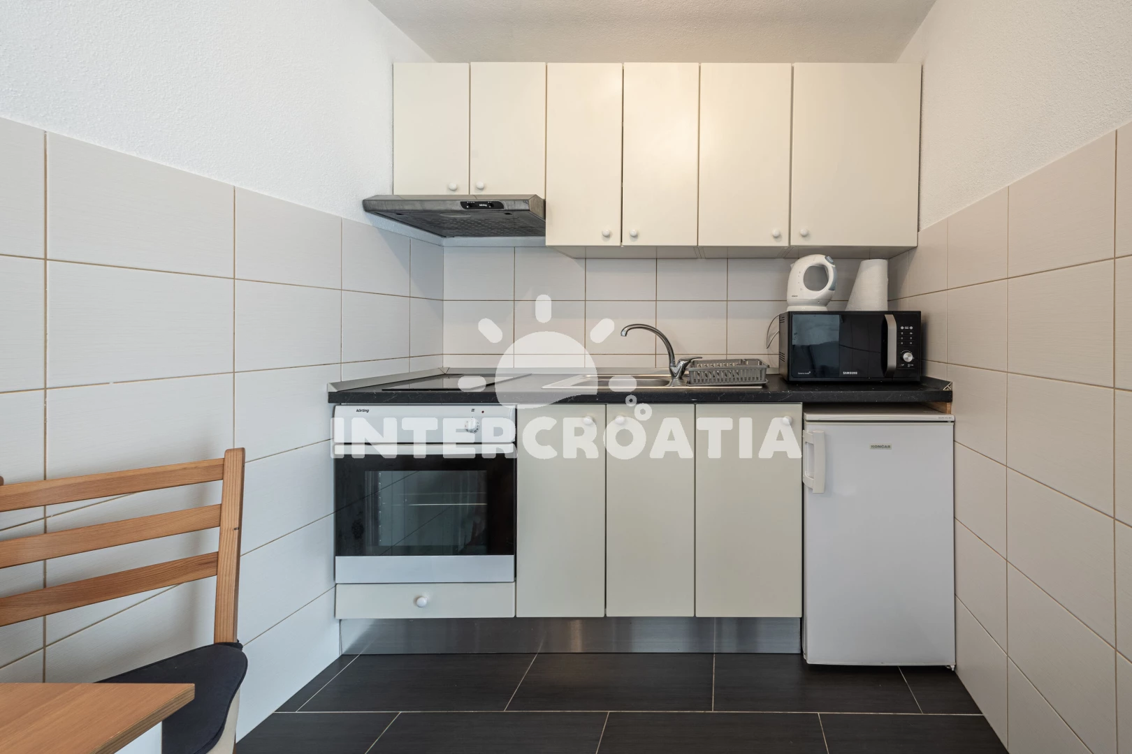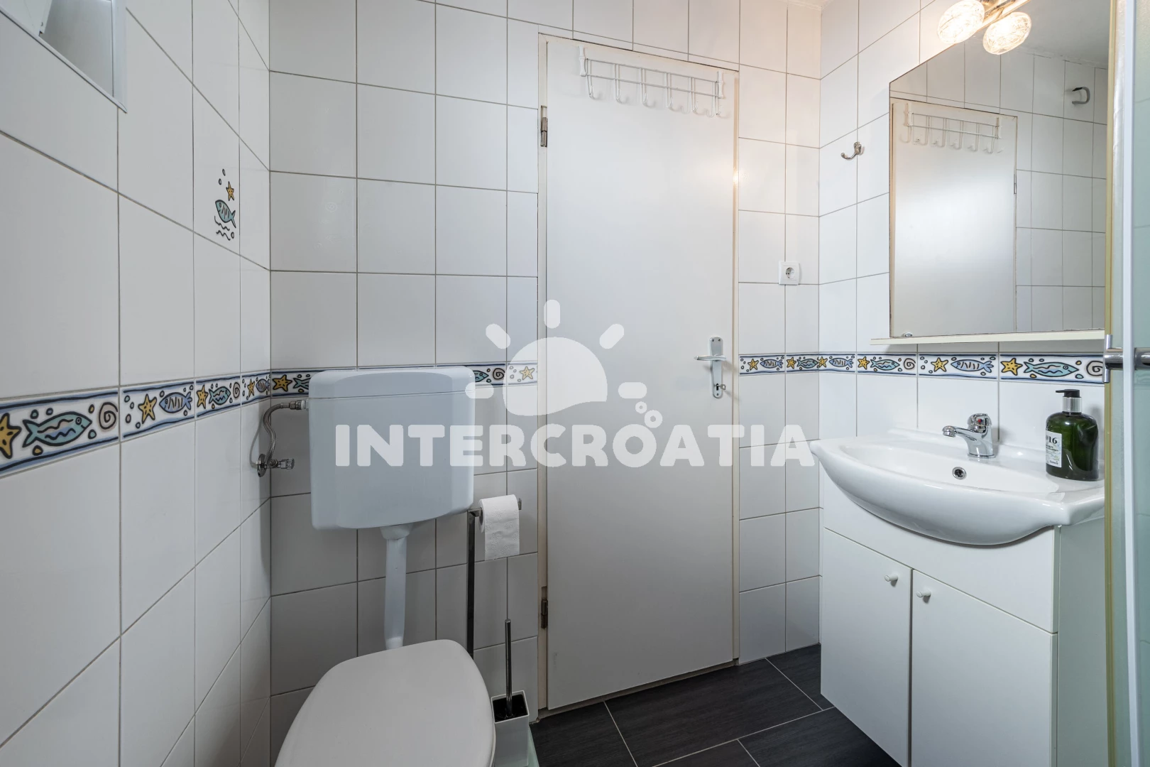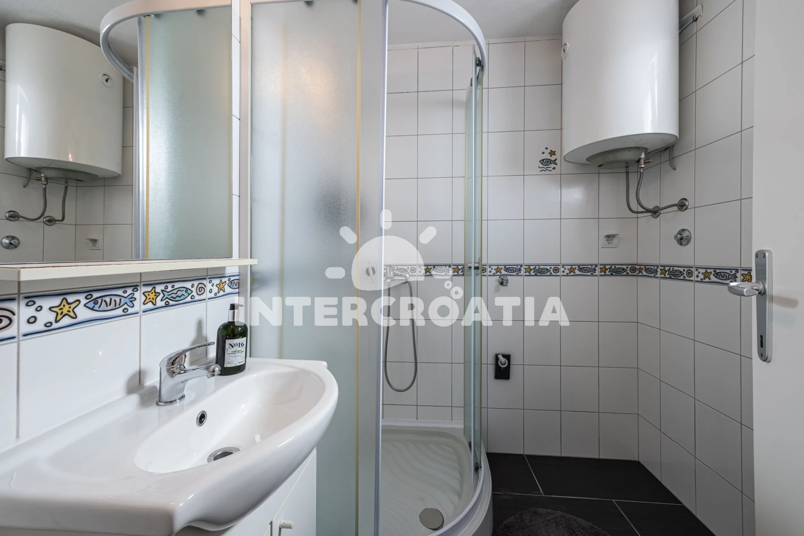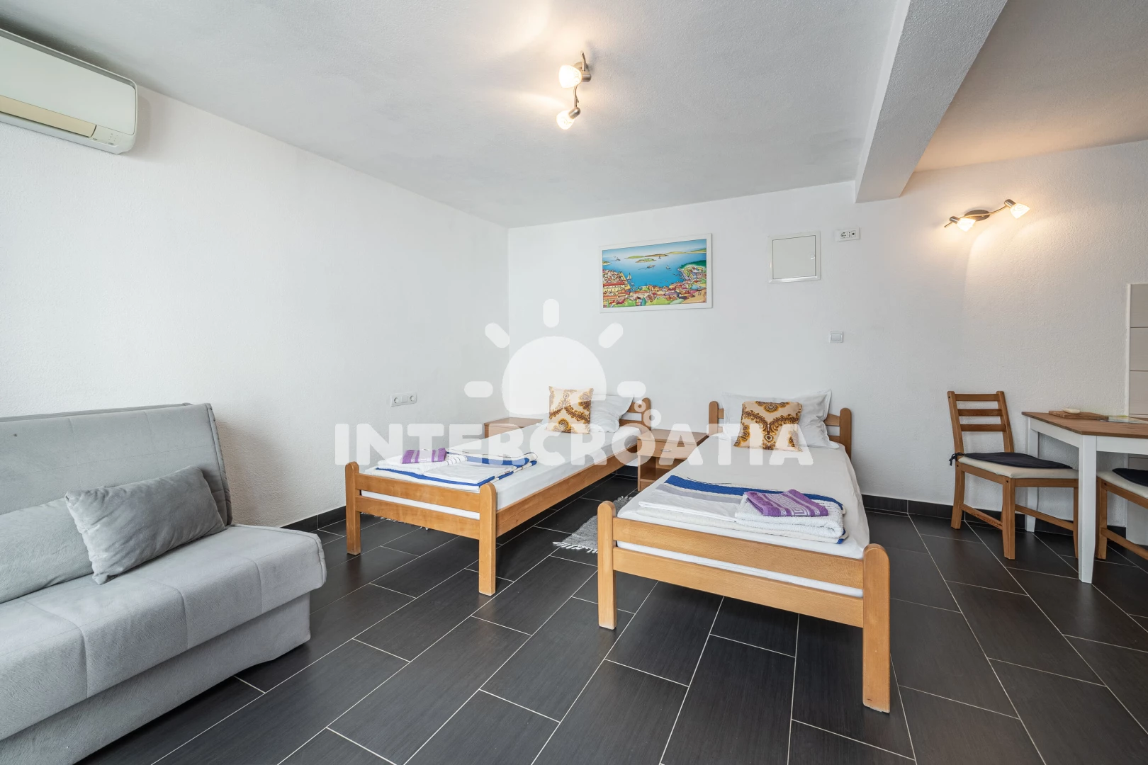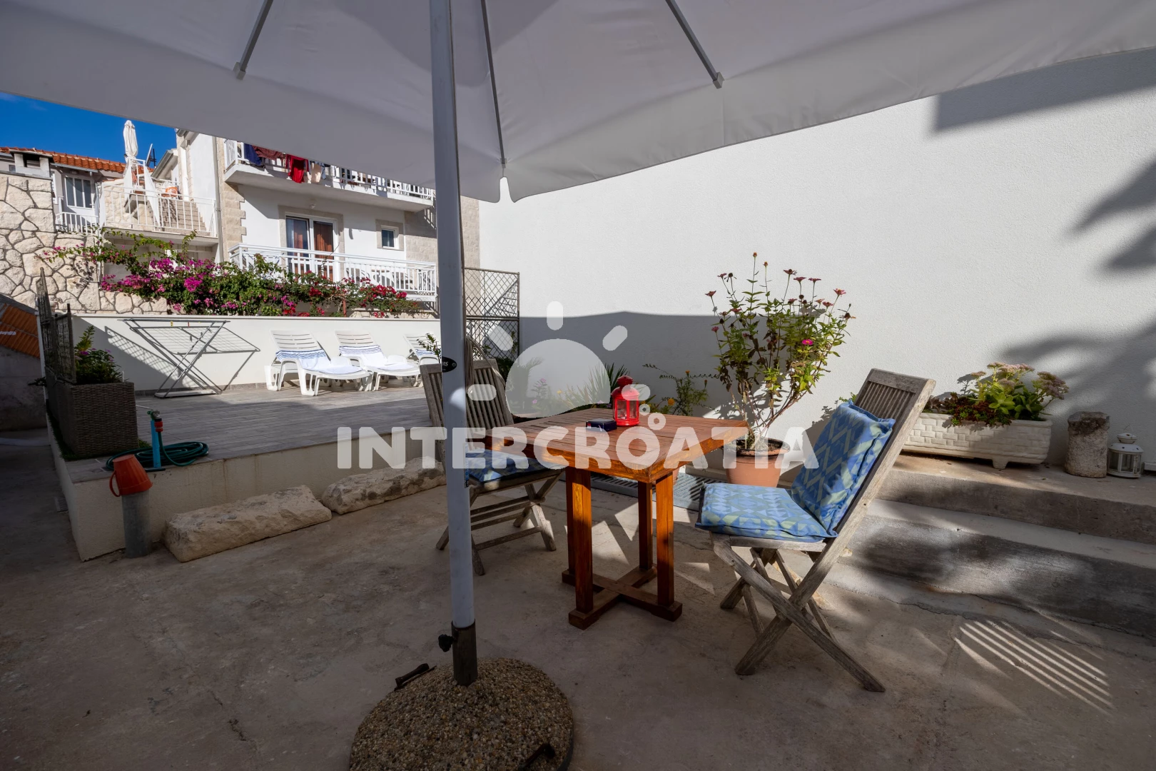 Apartmán se nachází 650 m od moře a pláže. Pláž je skalnatá, oblázková, větší kamení a betonové desky. Parkování je před domem.