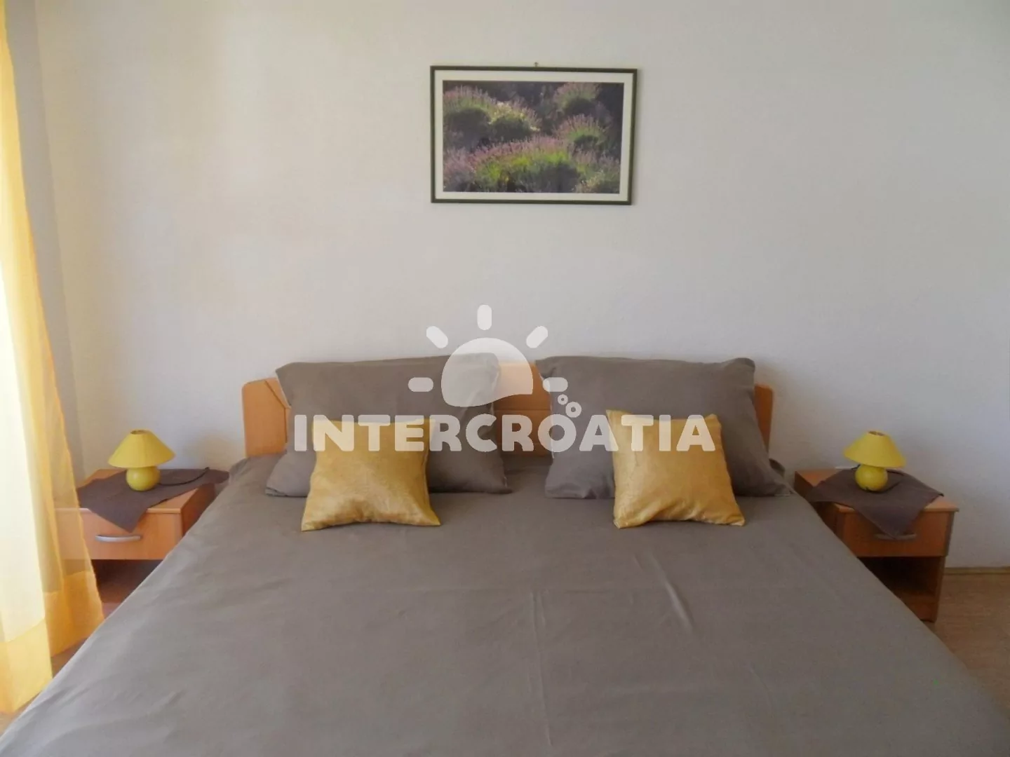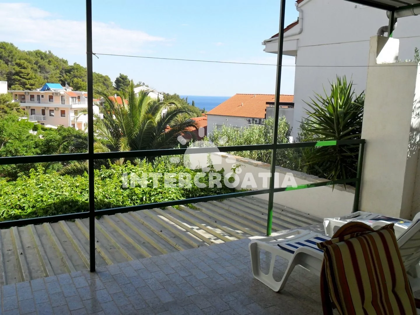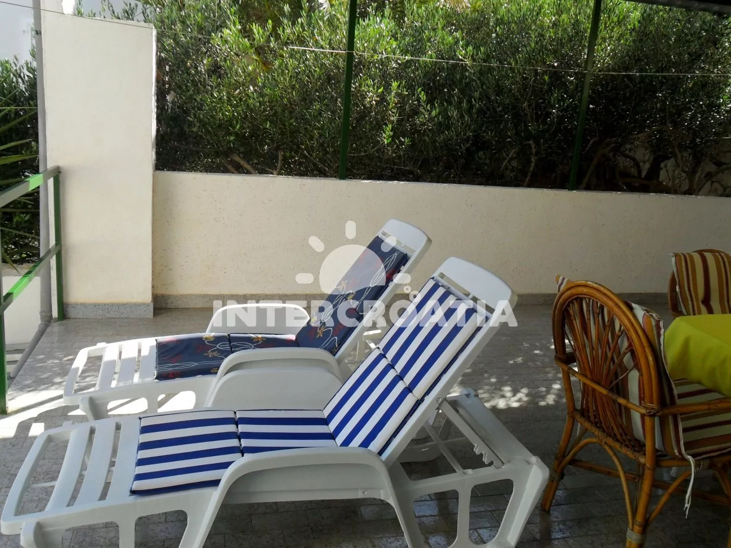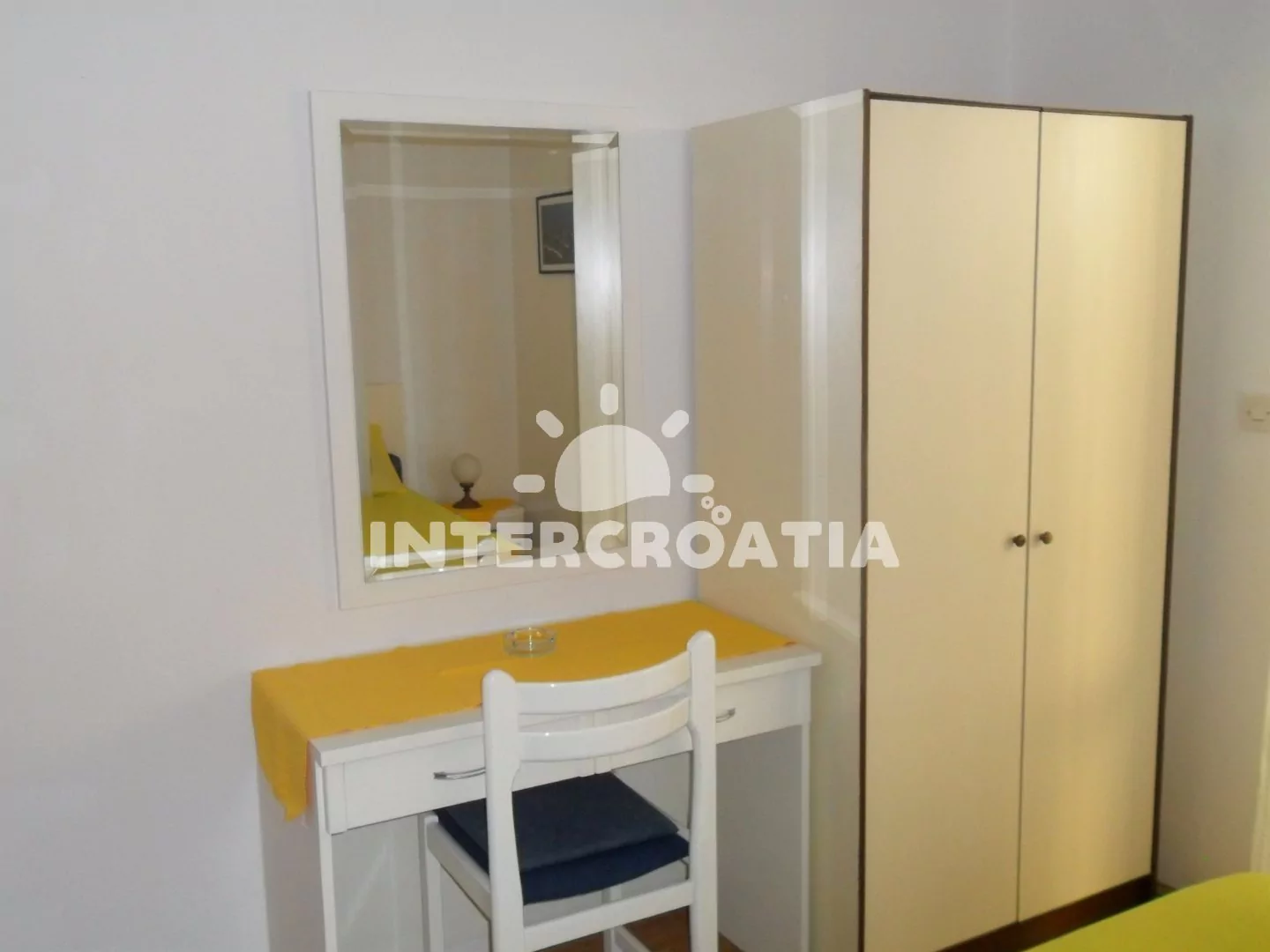 Apartmán s výhledem na moře a venkovním posezením. Nachází se v prvním patře vily a je vhodný pro 4 osoby. Kuchyň s jídelním stolem pro 4 osoby, kuchyňskou linkou se sporákem, troubou, rychlovarnou konvicí, mikrovlnnou troubou, kávovarem, toustovačem, nádobím a lednicí s mrazákem. První ložnice s jedním dvoulůžkem, televizí se satelitním programem a vstupem na balkon. Druhá ložnice s jedním dvoulůžkem. Dvě koupelny, každá je vybavena vanou se sprchovou zástěnou, umyvadlem a wc. Hostům je k dispozici u apartmánu terasa a balkon s posezením.