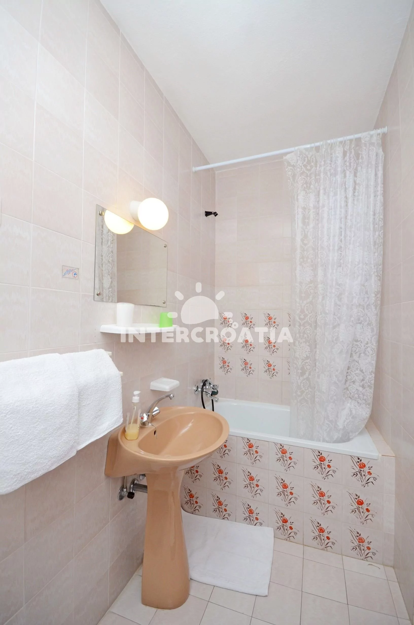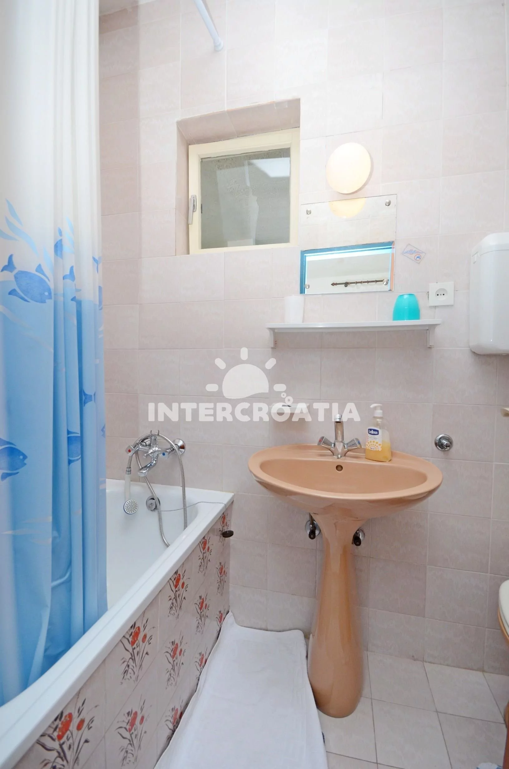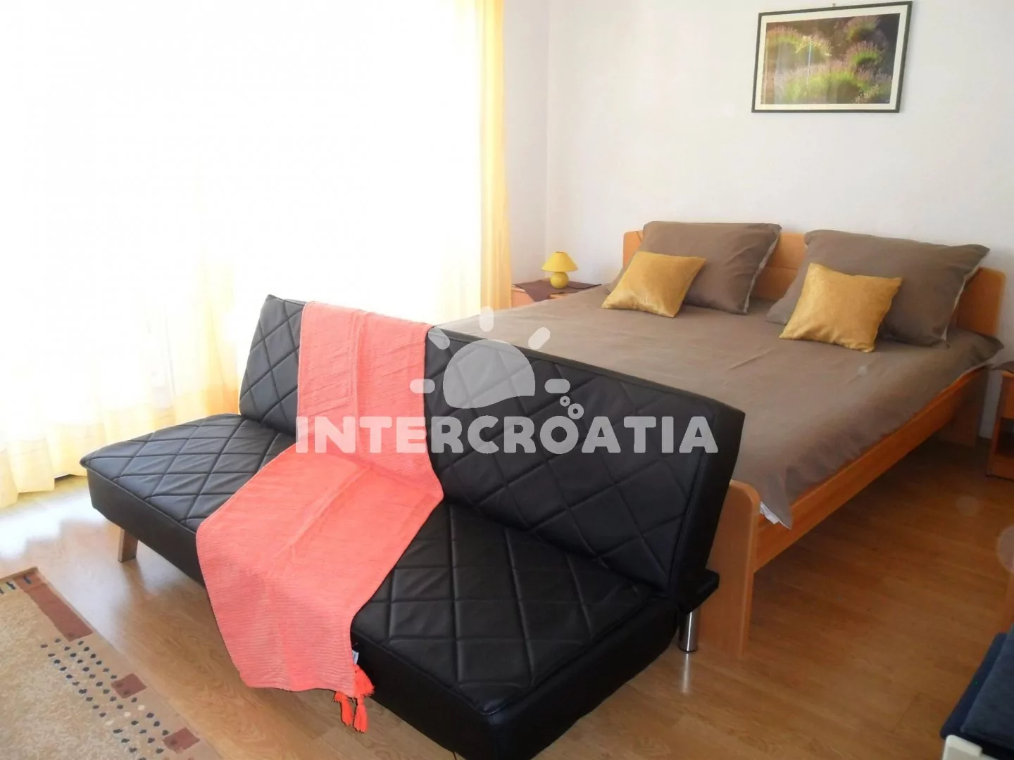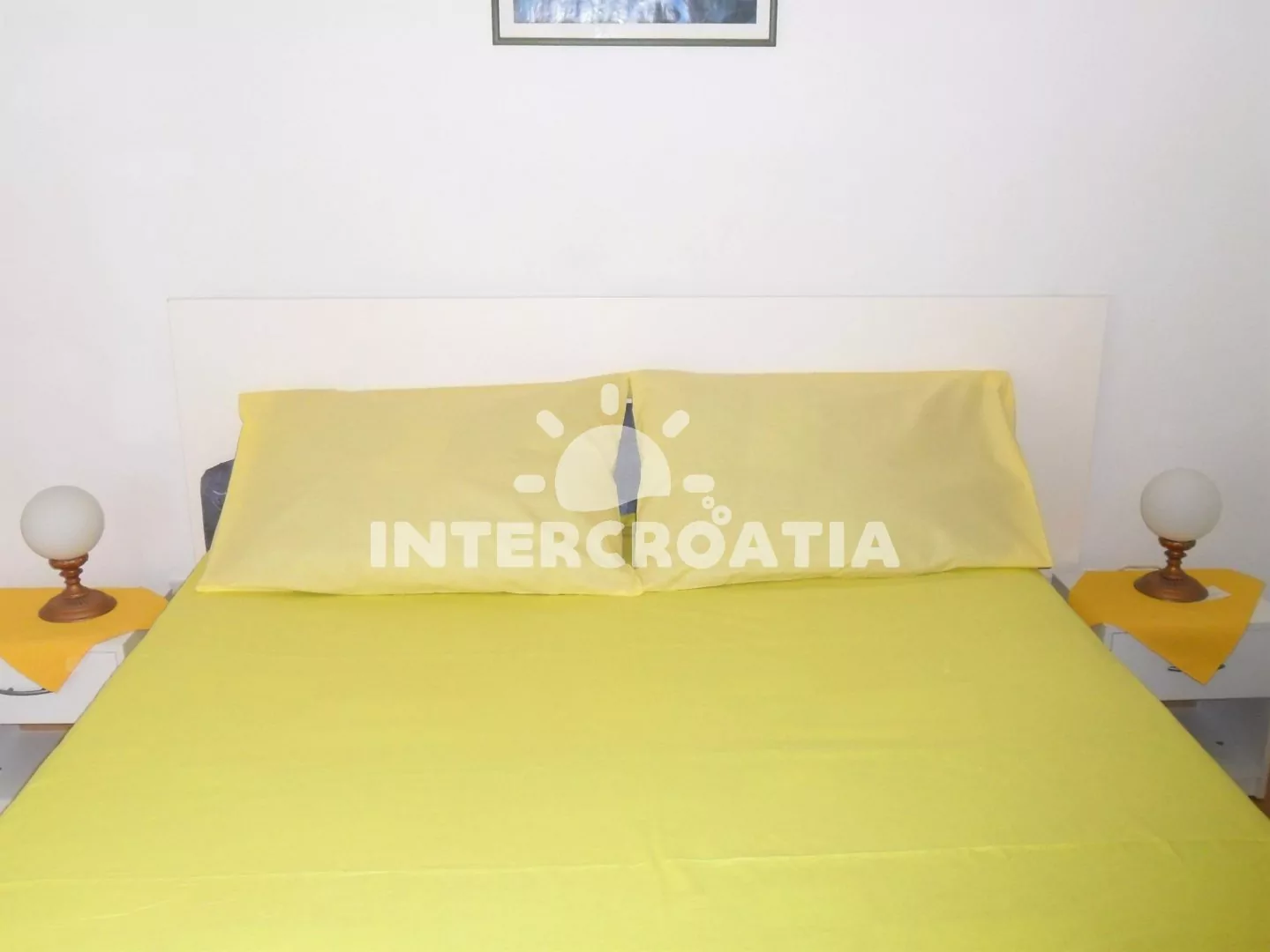 Apartmán s výhledem na moře a venkovním posezením. Nachází se v prvním patře vily a je vhodný pro 4 osoby. Kuchyň s jídelním stolem pro 4 osoby, kuchyňskou linkou se sporákem, troubou, rychlovarnou konvicí, mikrovlnnou troubou, kávovarem, toustovačem, nádobím a lednicí s mrazákem. První ložnice s jedním dvoulůžkem, televizí se satelitním programem a vstupem na balkon. Druhá ložnice s jedním dvoulůžkem. Dvě koupelny, každá je vybavena vanou se sprchovou zástěnou, umyvadlem a wc. Hostům je k dispozici u apartmánu terasa a balkon s posezením.