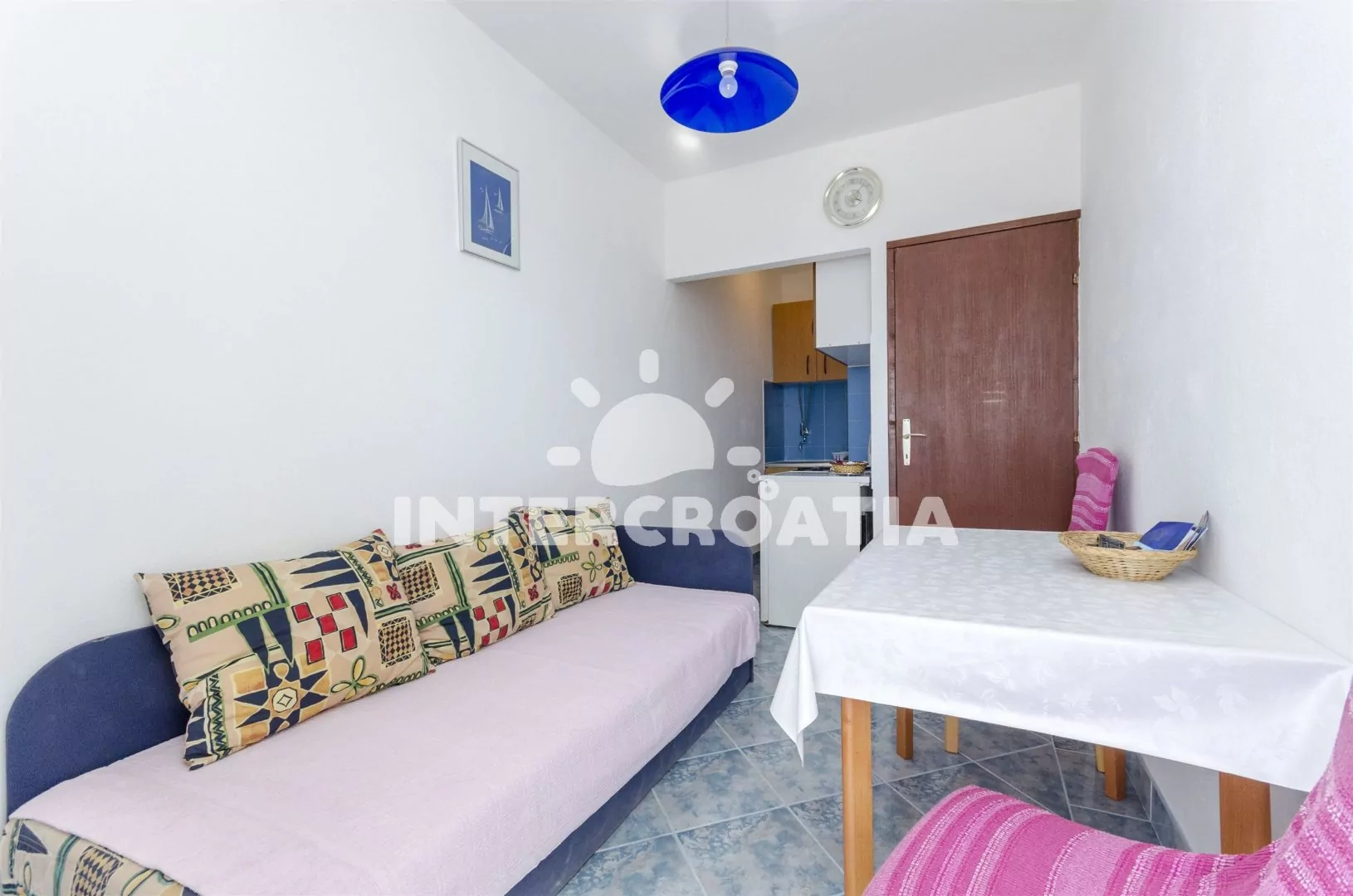 Apartmán s výhledem na moře a balkonem se nachází v druhém patře domu a je vhodný pro 2 až 3 osoby. Obývací pokoj je spojený s kuchyní. Kuchyňská linka je vybavena dvouplotýnkovým sporákem, nádobím a…