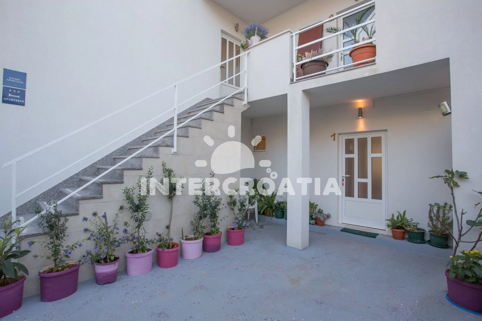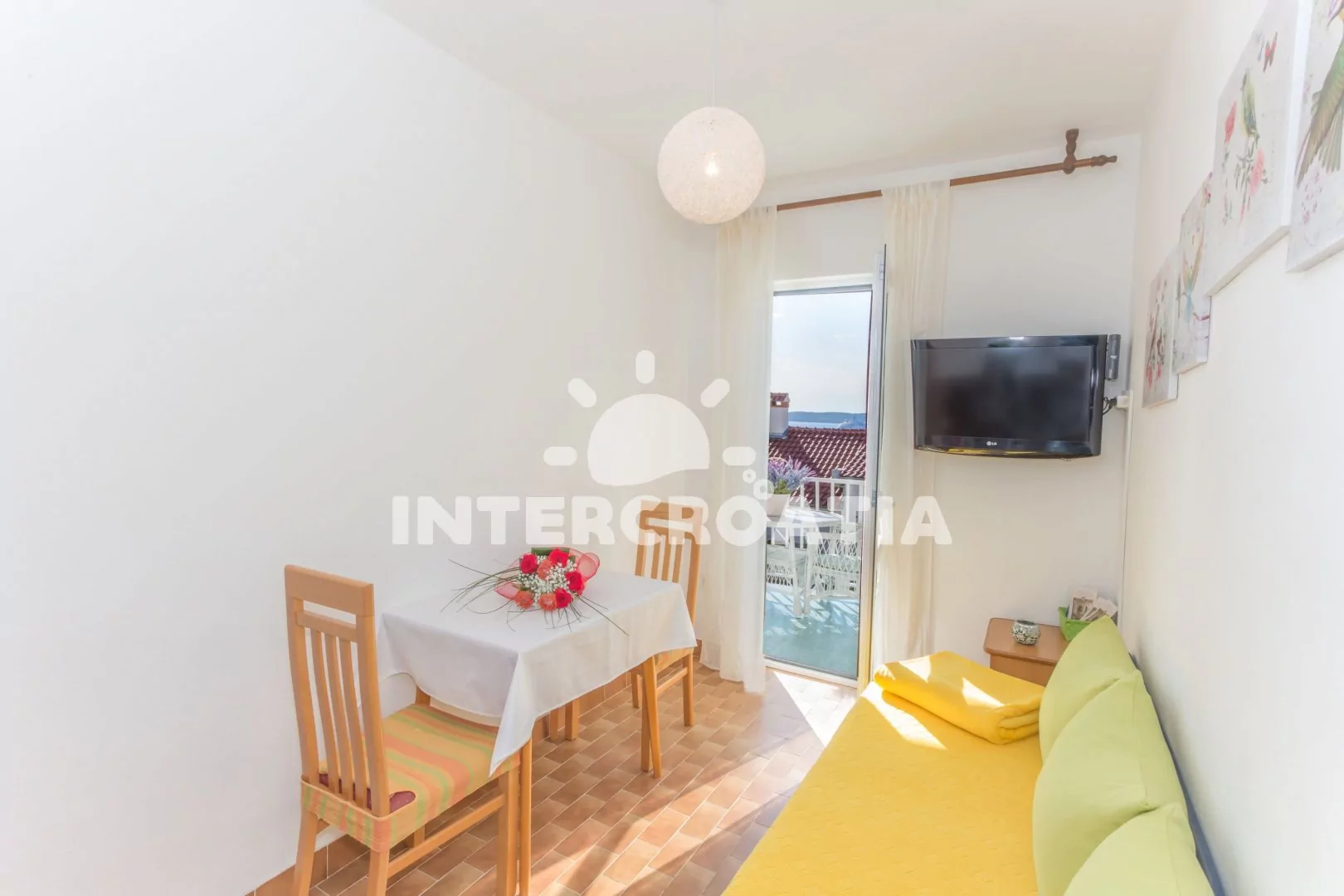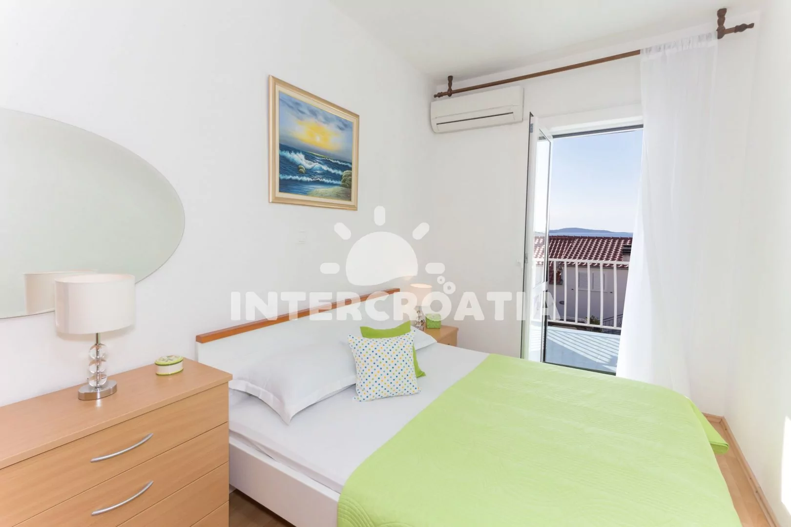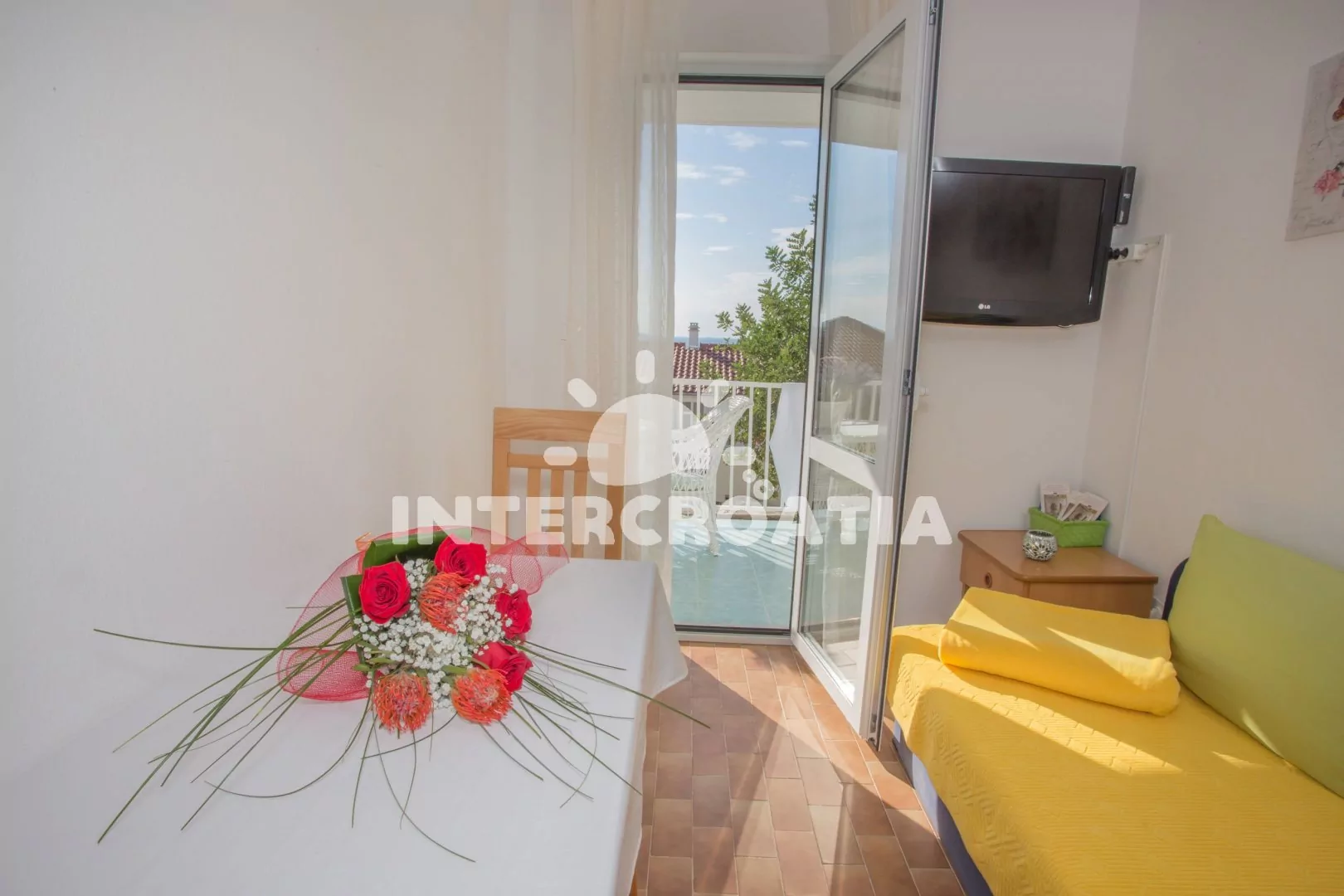 Apartmán s výhledem na moře a balkonem se nachází v prvním patře domu a je vhodný pro 2 až 3 osoby. Obývací pokoj je spojený s kuchyní. Kuchyňská linka je vybavena dvouplotýnkovým sporákem, nádobím a lednicí s mrazákem. Obývací pokoj s jídelním stolem, pohovkou (rozložitelná na extra lůžko pro 1 osobu), televizí se satelitním programem a vstupem na balkon. Ložnice s jedním dvoulůžkem, klimatizací a vstupem na balkon. Koupelna se sprchovým koutem, umyvadlem, fénem a wc. Hostům je k dispozici parkování u objektu zdarma.
