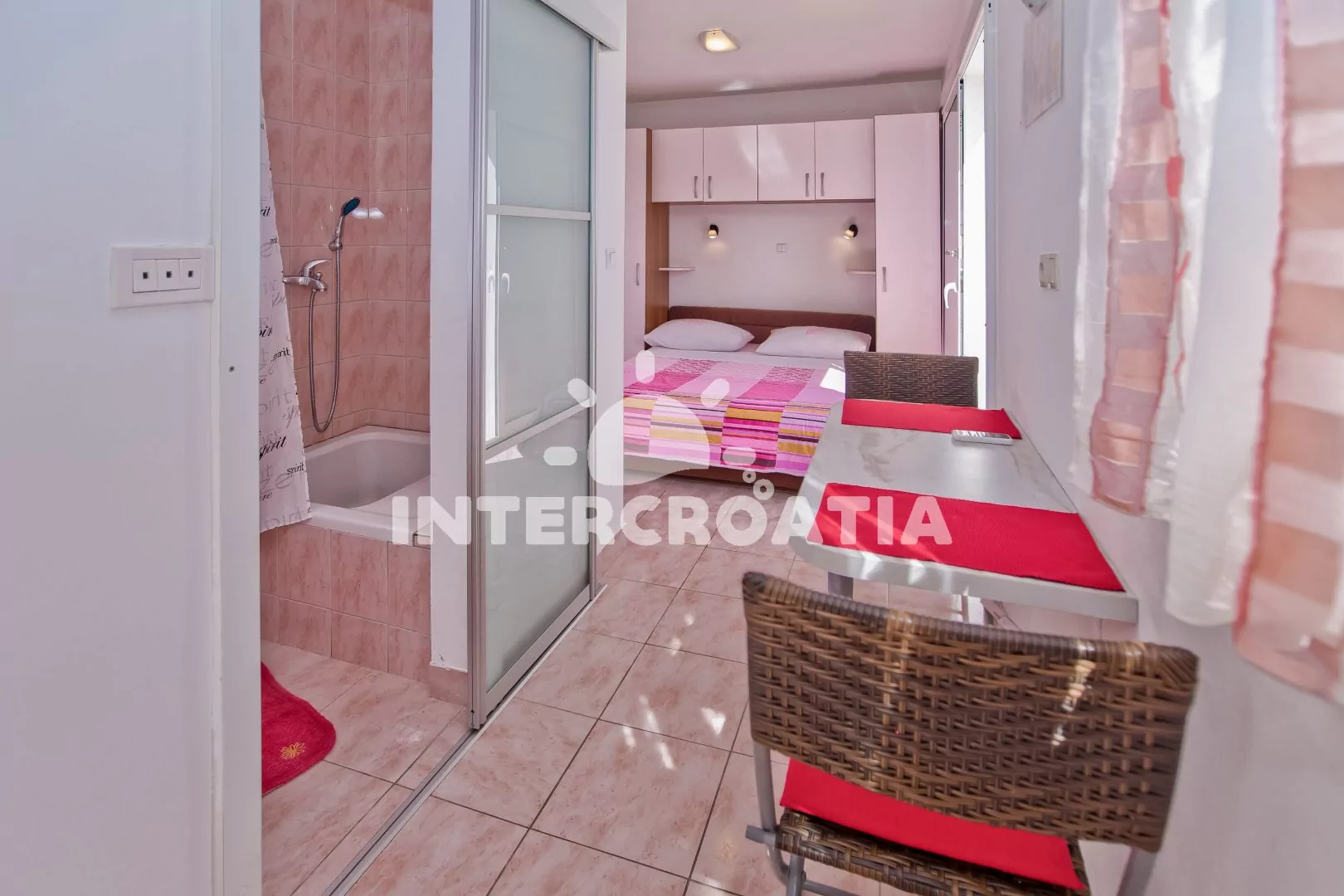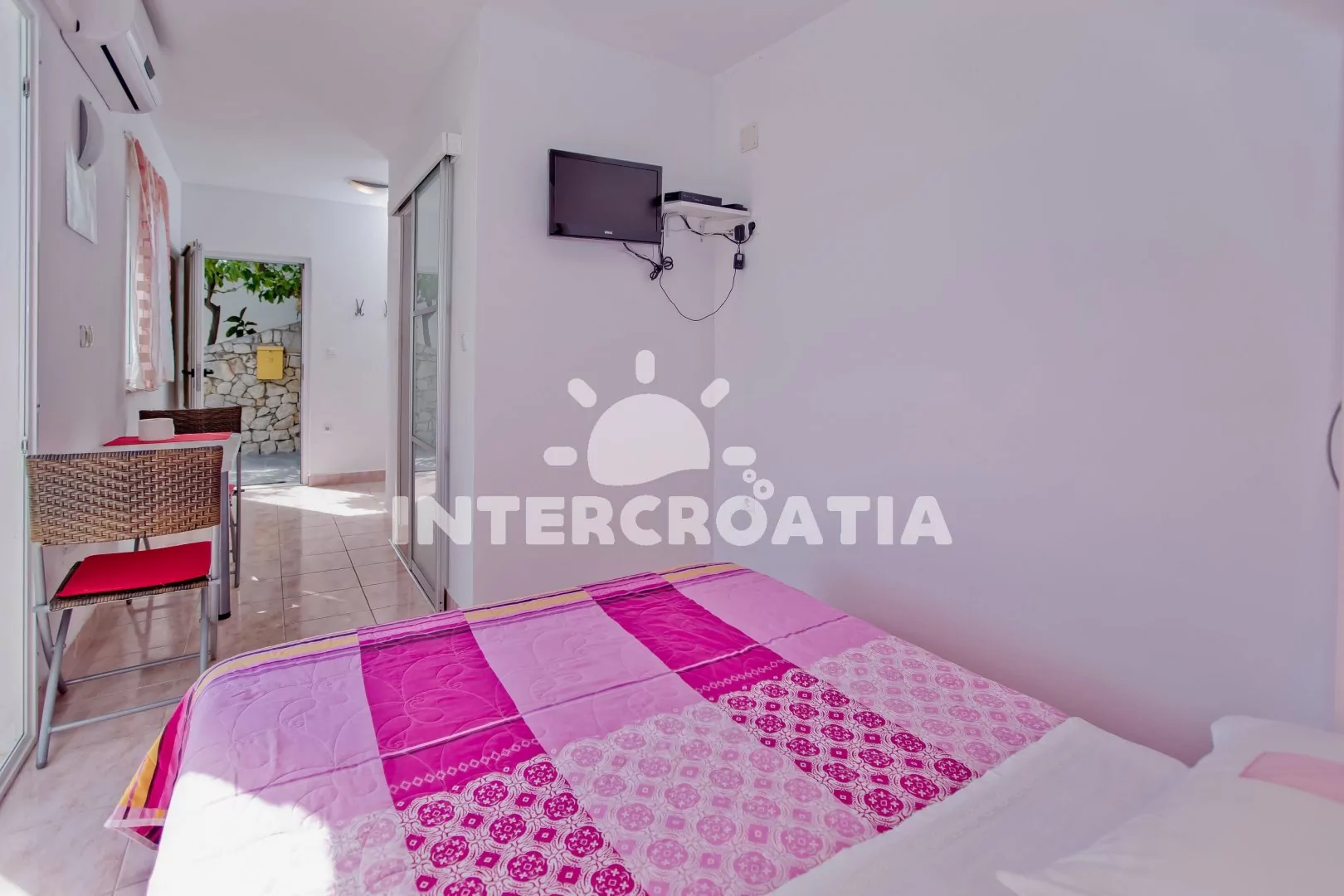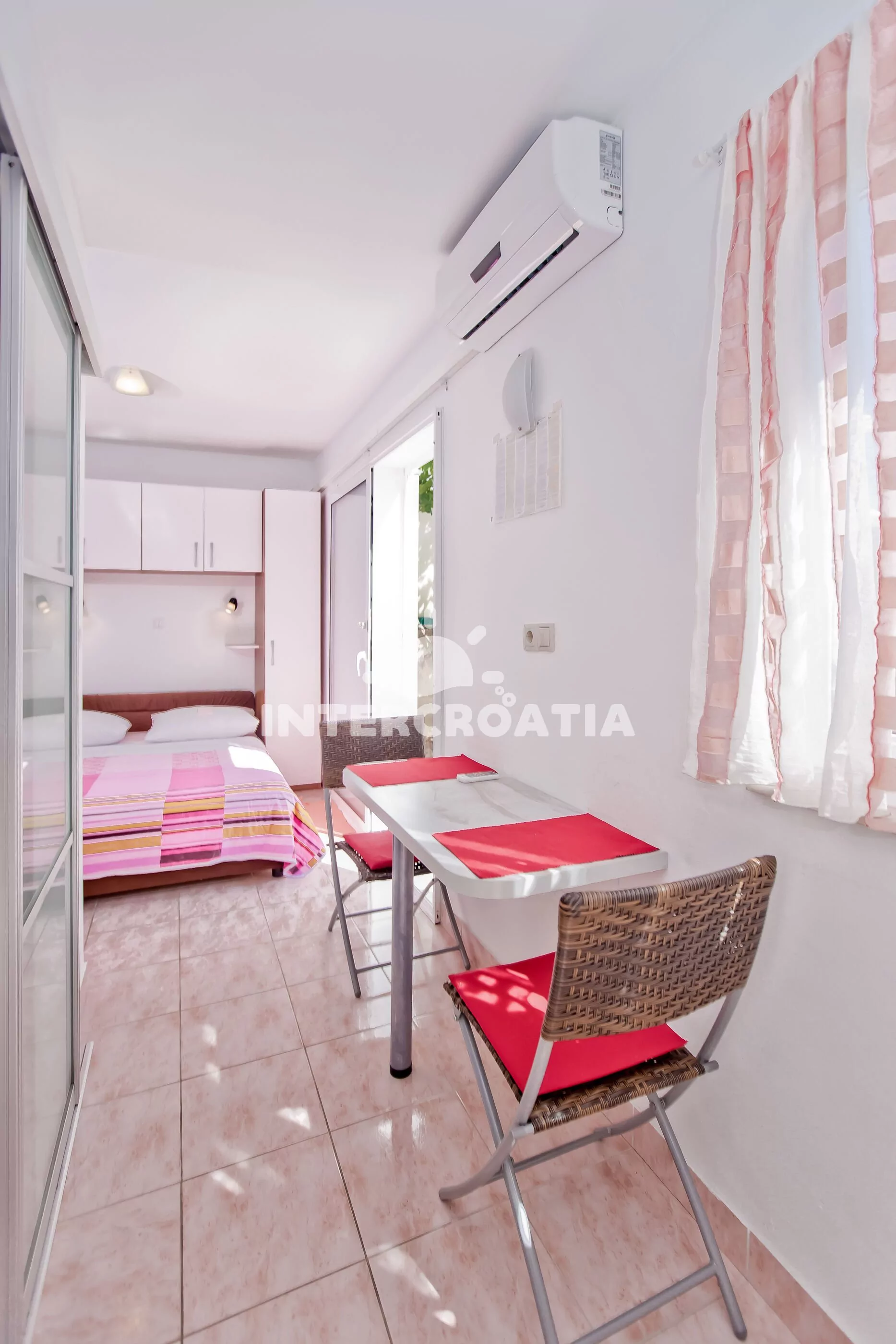 Apartmán typu studio s terasou a venkovním posezením se nachází v přízemí domu. Obývací místnost je spojena s kuchyní. Kuchyňská linka je vybavena dvouplotýnkovým vařičem, kávovarem, nádobím a lednicí s mrazákem. Obývací místnost s jídelním stolem pro 2 osoby, dvoulůžkem, televizí a klimatizací. Koupelna se sprchovým koutem, umyvadlem, fénem a wc. Hostům je k dispozici parkování u objektu zdarma.