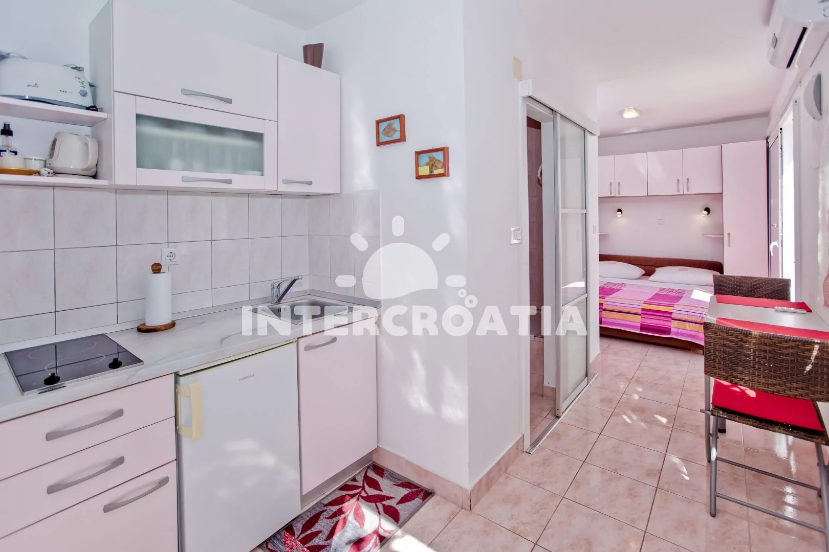 Apartmán typu studio s terasou a venkovním posezením se nachází v přízemí domu. Obývací místnost je spojena s kuchyní. Kuchyňská linka je vybavena dvouplotýnkovým vařičem, kávovarem, nádobím a…