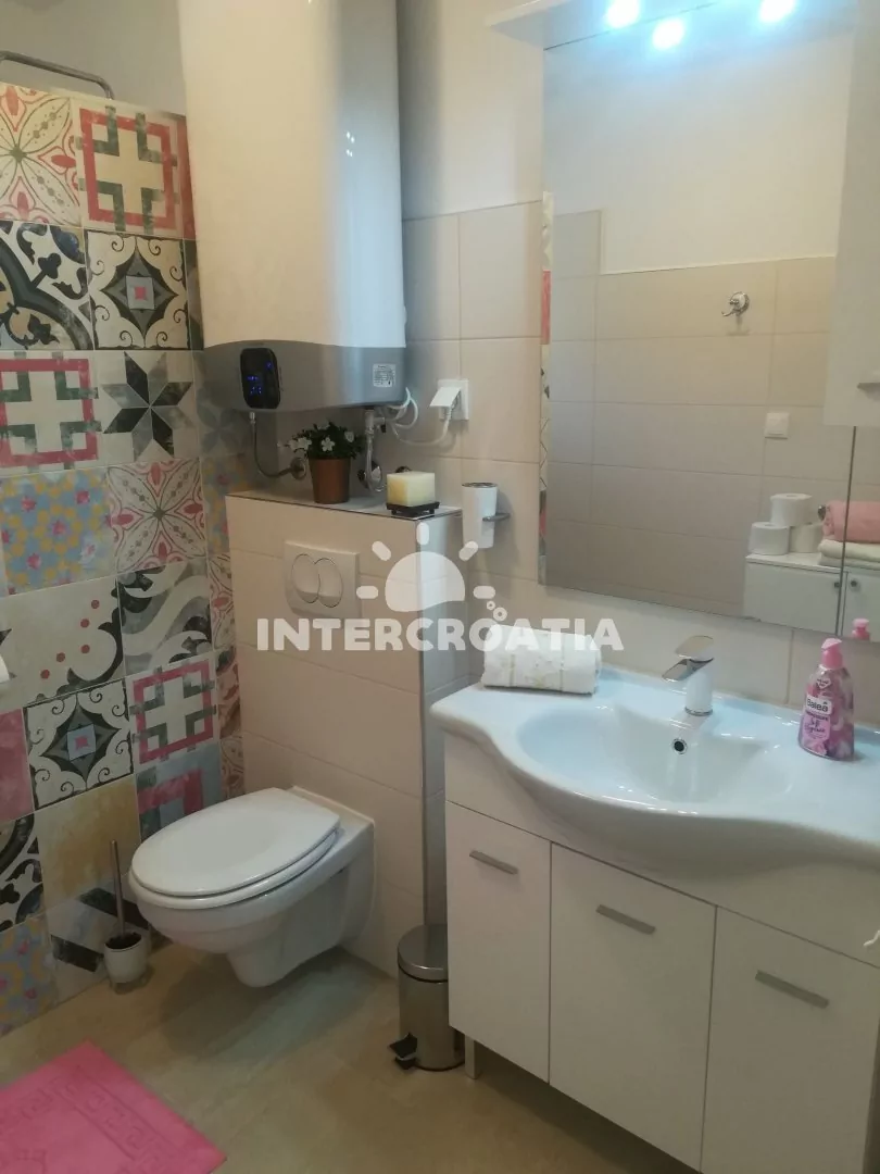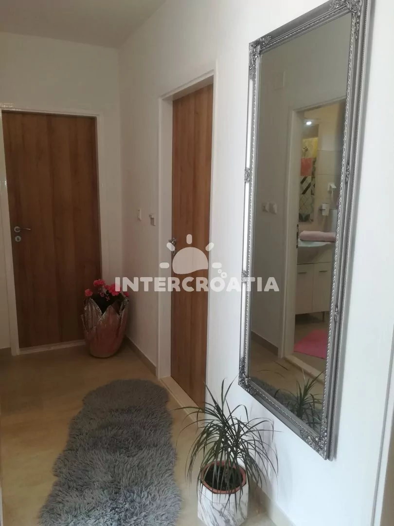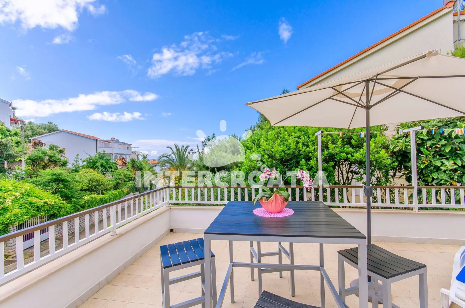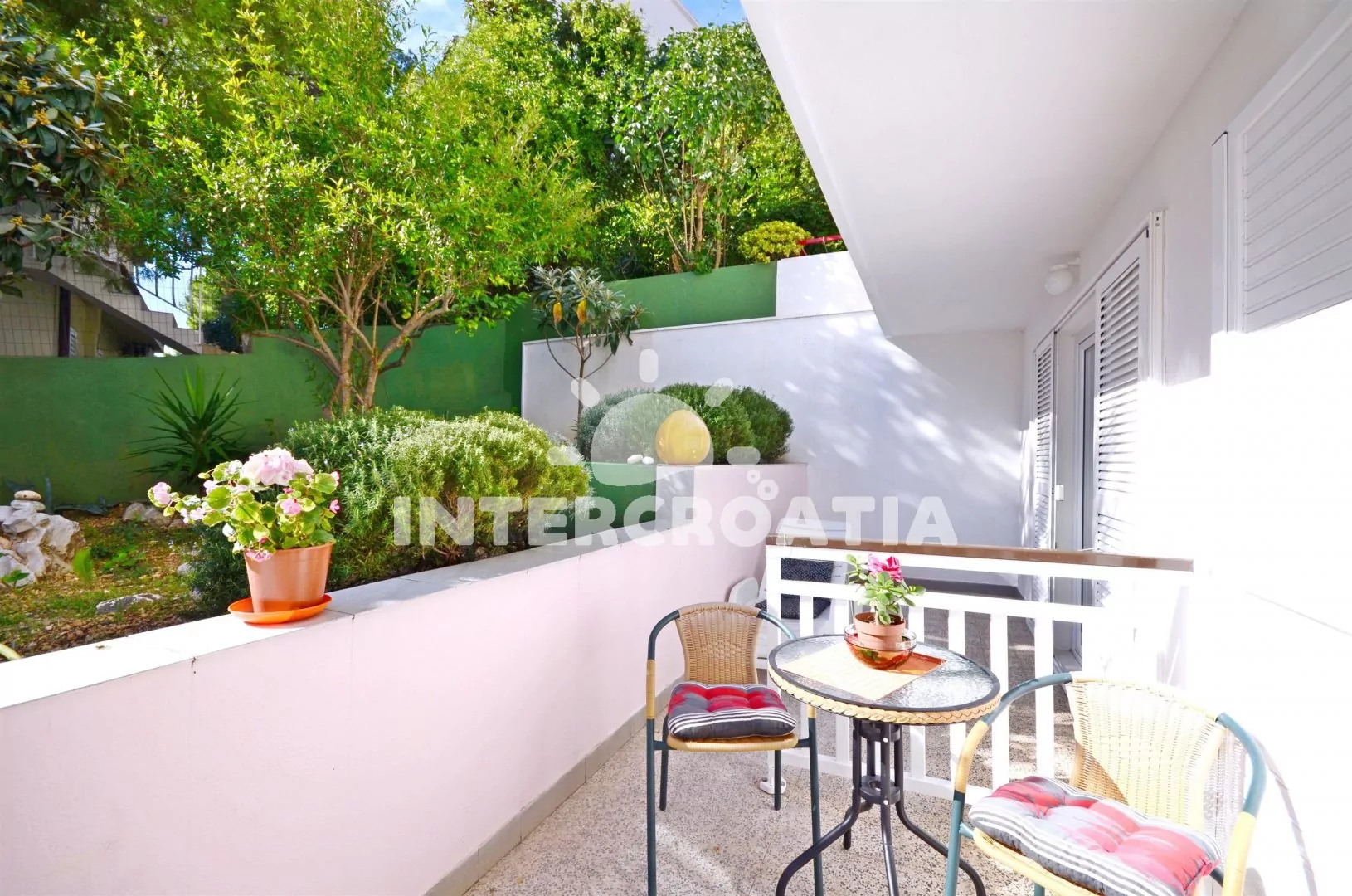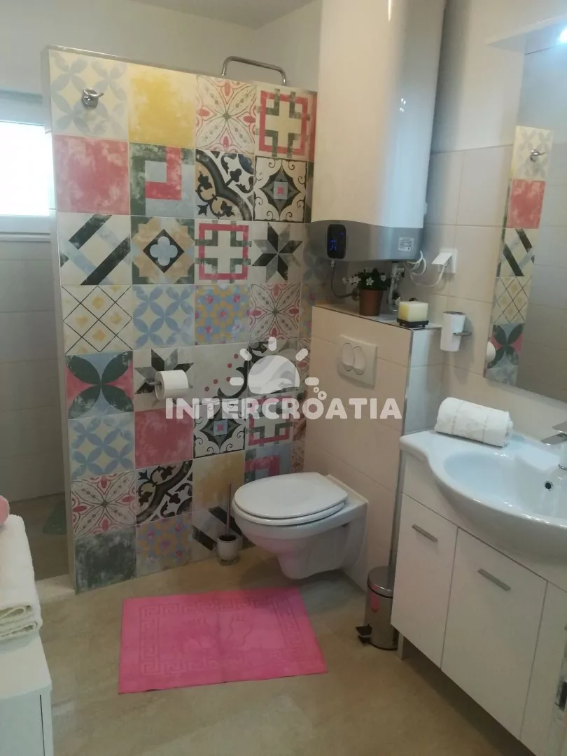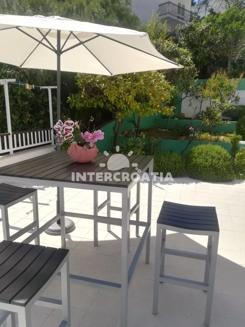 Apartmán (110 m2) se třemi ložnicemi, velkou terasou (50 m2) a venkovním posezením se nachází v přízemí domu. Apartmán je vhodný pro 6 osob. Obývací pokoj je spojený s kuchyní. Kuchyňská linka je vybavena varnou deskou, vestavěnou troubou, rychlovarnou konvicí, mikrovlnnou troubou, kávovarem, nádobím a lednicí s mrazákem. Obývací pokoj s jídelním stolem pro 6 osob, pohovkou, televizí se satelitním programem, radiem a klimatizací. Tři samostatné ložnice vybaveny vždy s jedním dvoulůžkem a vstupem na terasu. První i druhá koupelna je vybavena sprchovým koutem, umyvadlem a wc. Dále je apartmán vybaven fénem a žehličkou. Hostům je k dispozici parkování u objektu zdarma.
