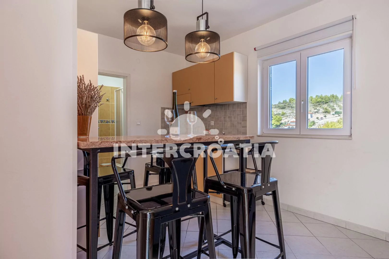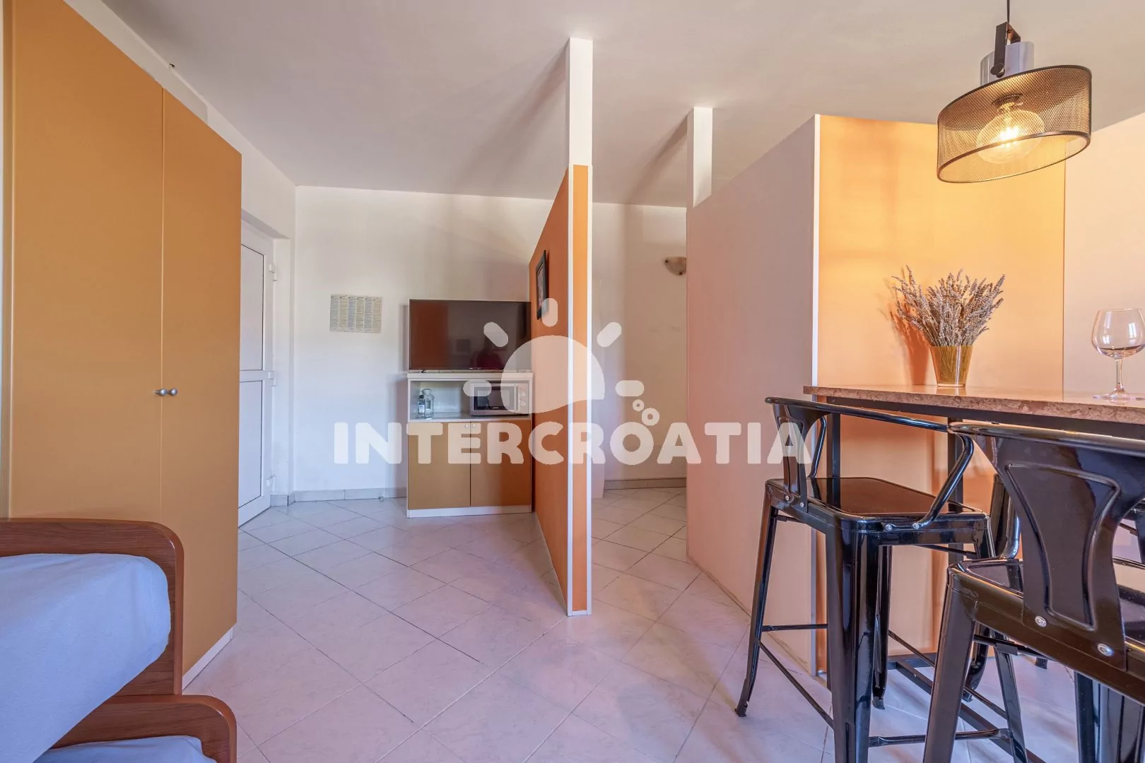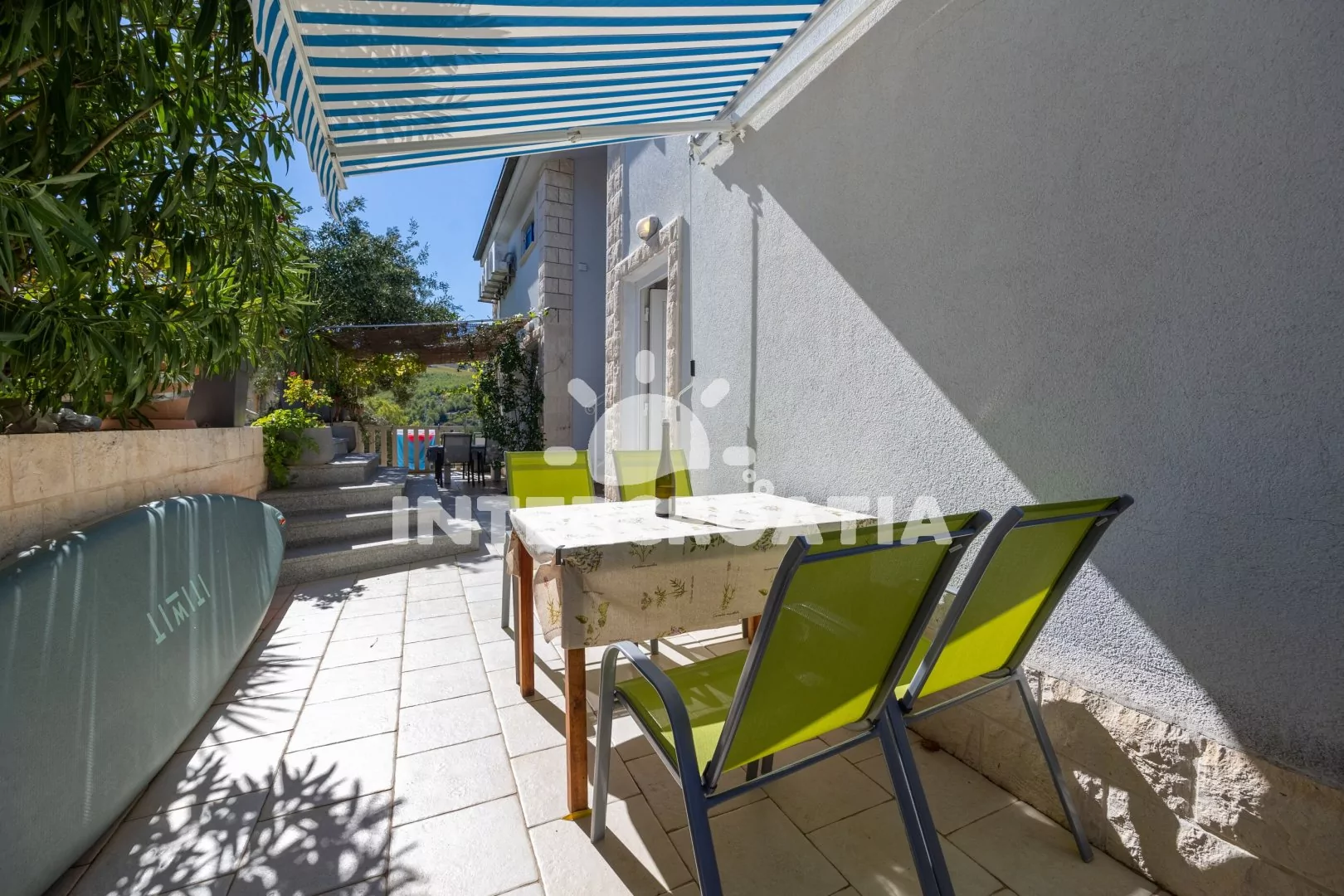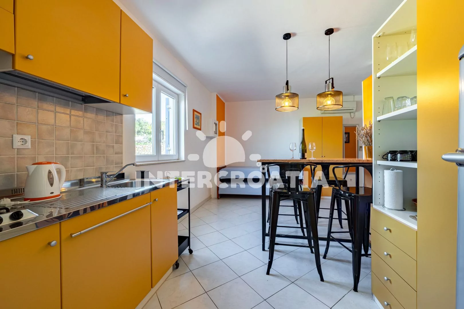 Apartmán (36 m2) typu studio s terasou, posezením a výhledem na moře se nachází v 1. patře domu. Obývací místnost je spojena s kuchyní. Kuchyňská linka je vybavena varnou deskou, digestoří, myčkou na nádobí, rychlovarnou konvicí, kávovarem, nádobím a lednicí s mrazákem. Obývací místnost s jídelním stolem, televizí se satelitním programem, dvoulůžkem, klimatizací a vstupem na terasu. Koupelna se sprchovým koutem, umyvadlem, fénem a wc. Hostům je k dispozici parkování u objektu zdarma.