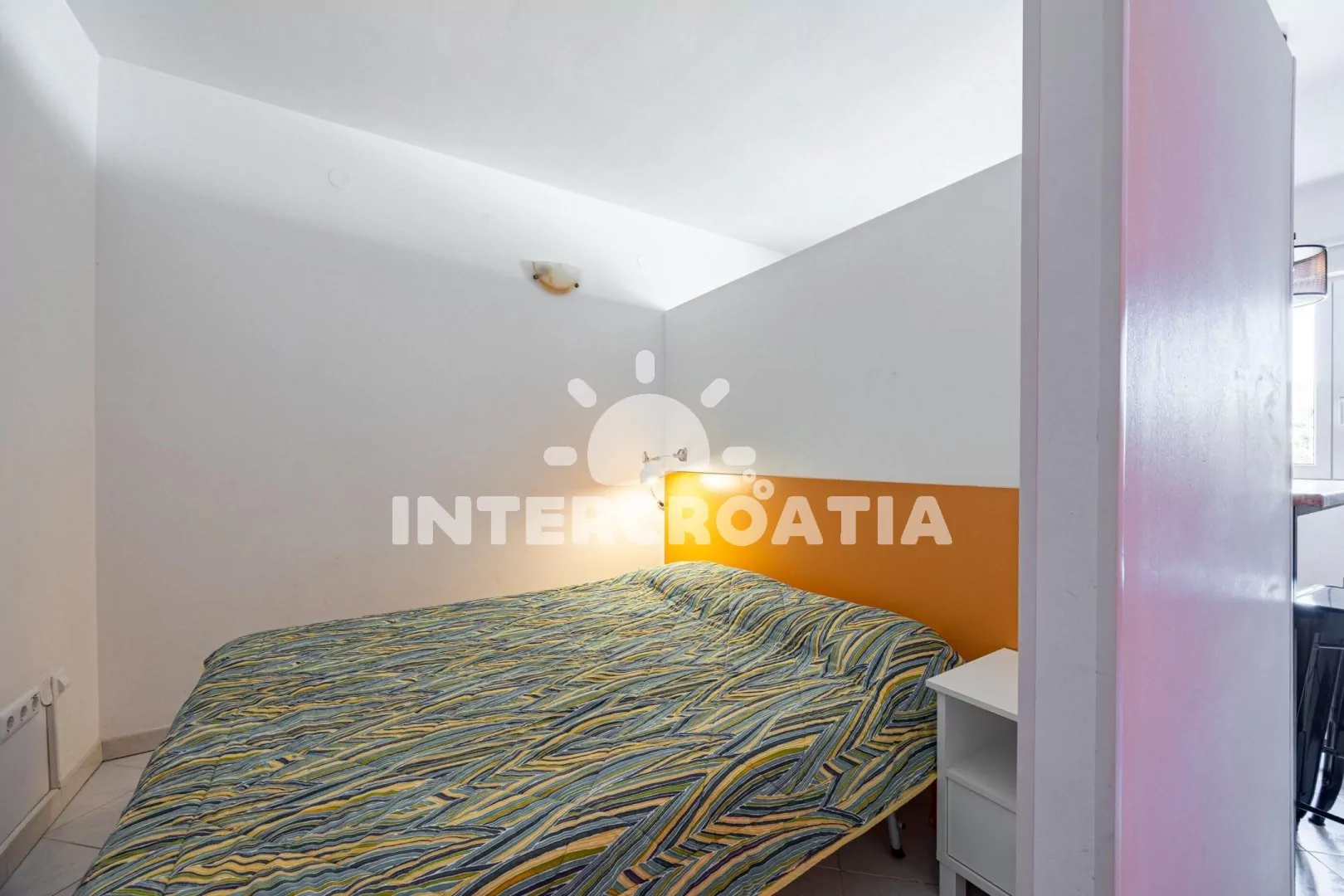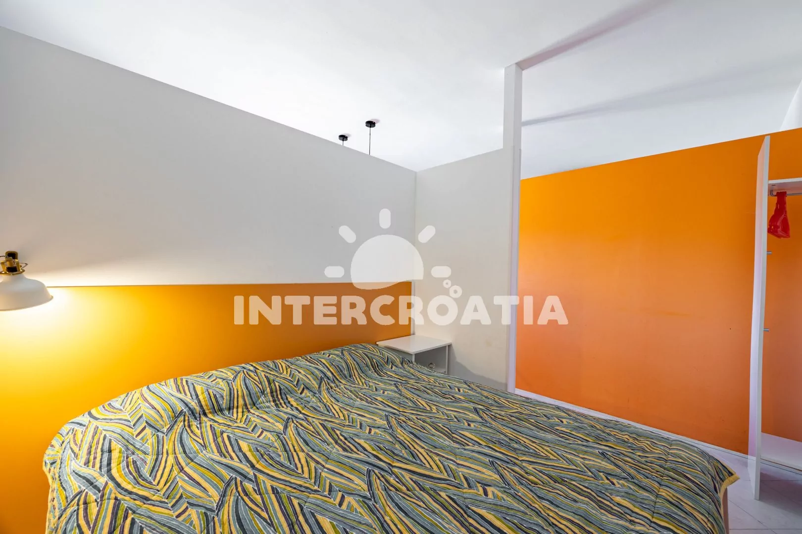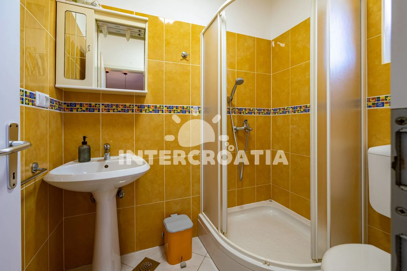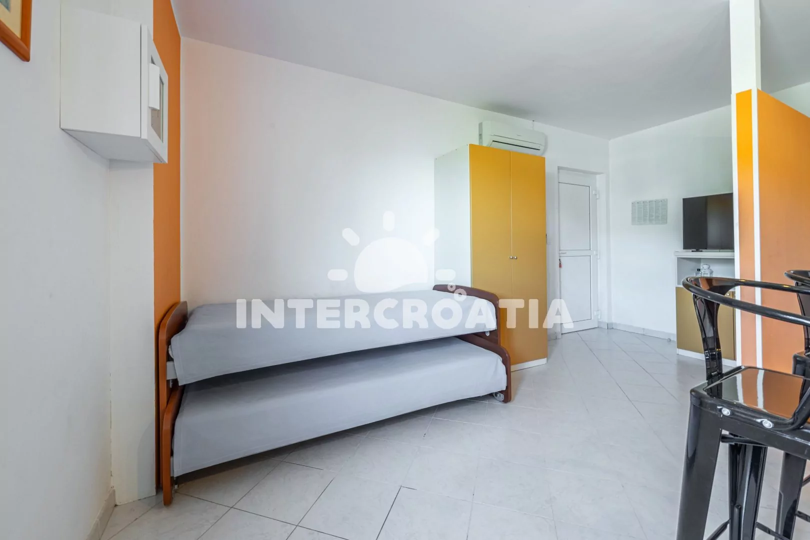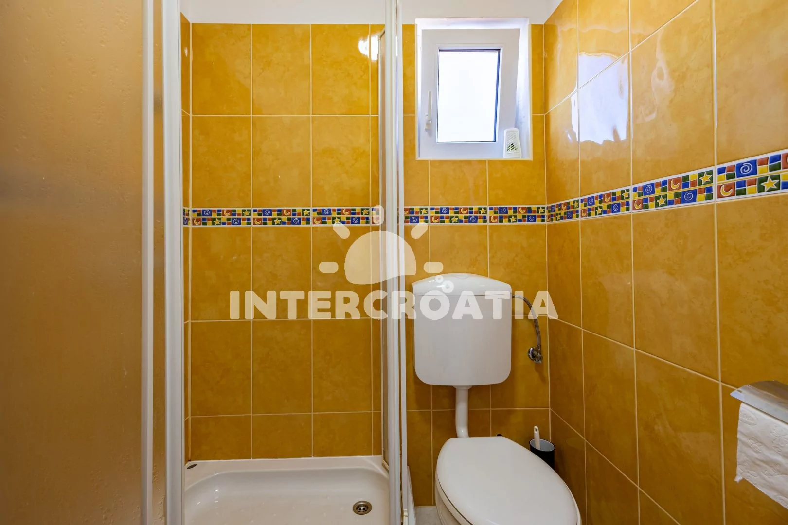 Apartmán (36 m2) typu studio s terasou, posezením a výhledem na moře se nachází v 1. patře domu. Obývací místnost je spojena s kuchyní. Kuchyňská linka je vybavena varnou deskou, digestoří, myčkou na nádobí, rychlovarnou konvicí, kávovarem, nádobím a lednicí s mrazákem. Obývací místnost s jídelním stolem, televizí se satelitním programem, dvoulůžkem, klimatizací a vstupem na terasu. Koupelna se sprchovým koutem, umyvadlem, fénem a wc. Hostům je k dispozici parkování u objektu zdarma.
