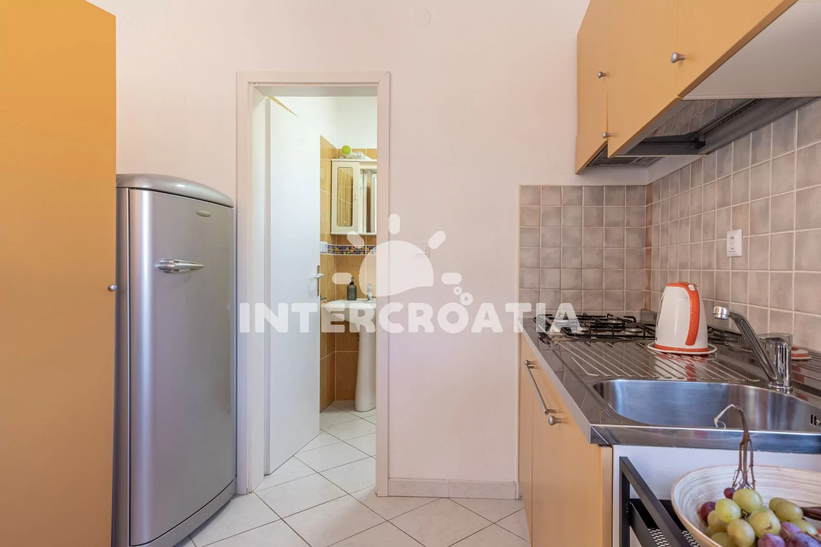 Apartmán (36 m2) typu studio s terasou, posezením a výhledem na moře se nachází v 1. patře domu. Obývací místnost je spojena s kuchyní. Kuchyňská linka je vybavena varnou deskou, digestoří, myčkou na…