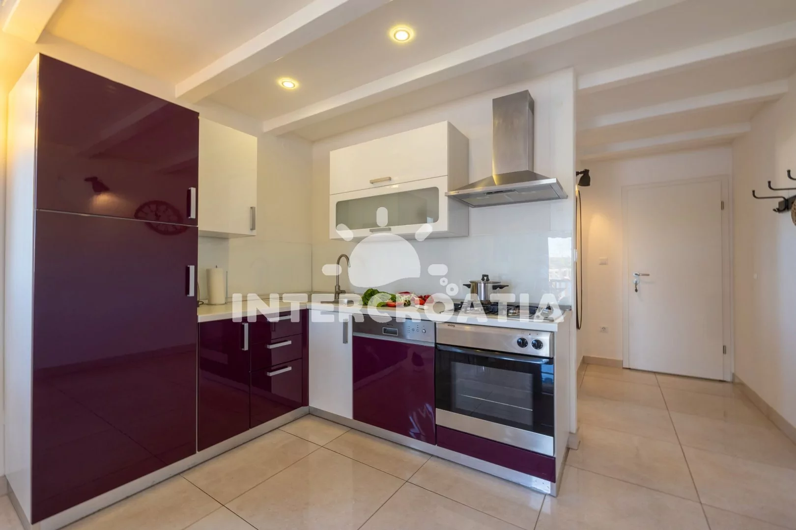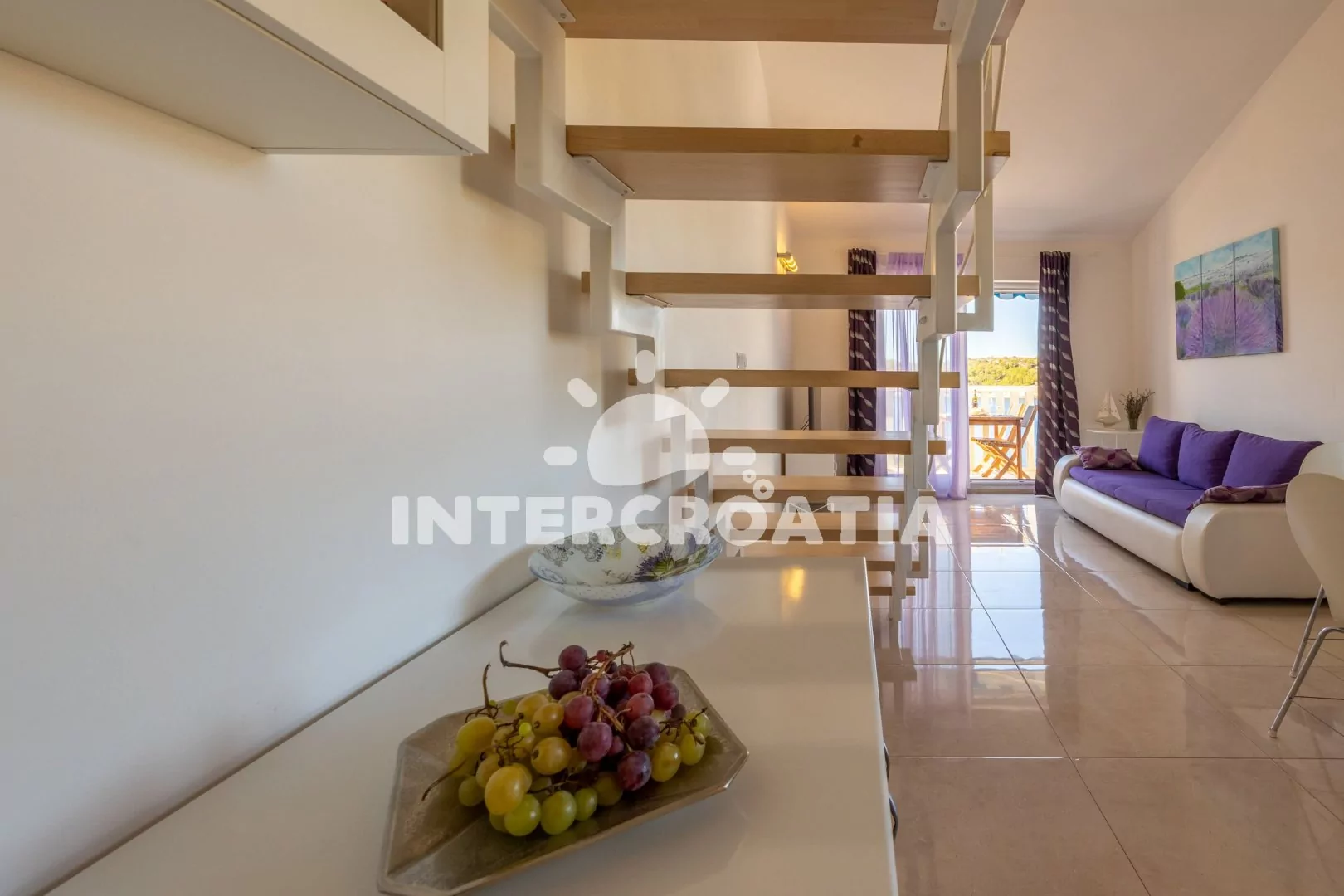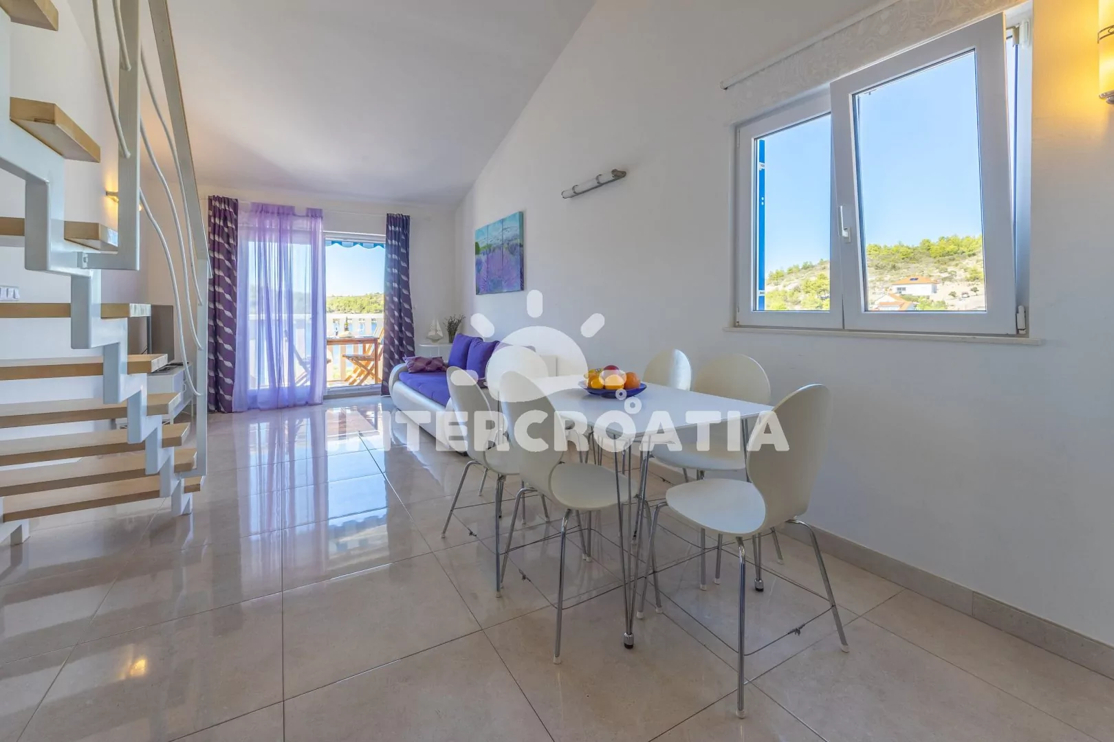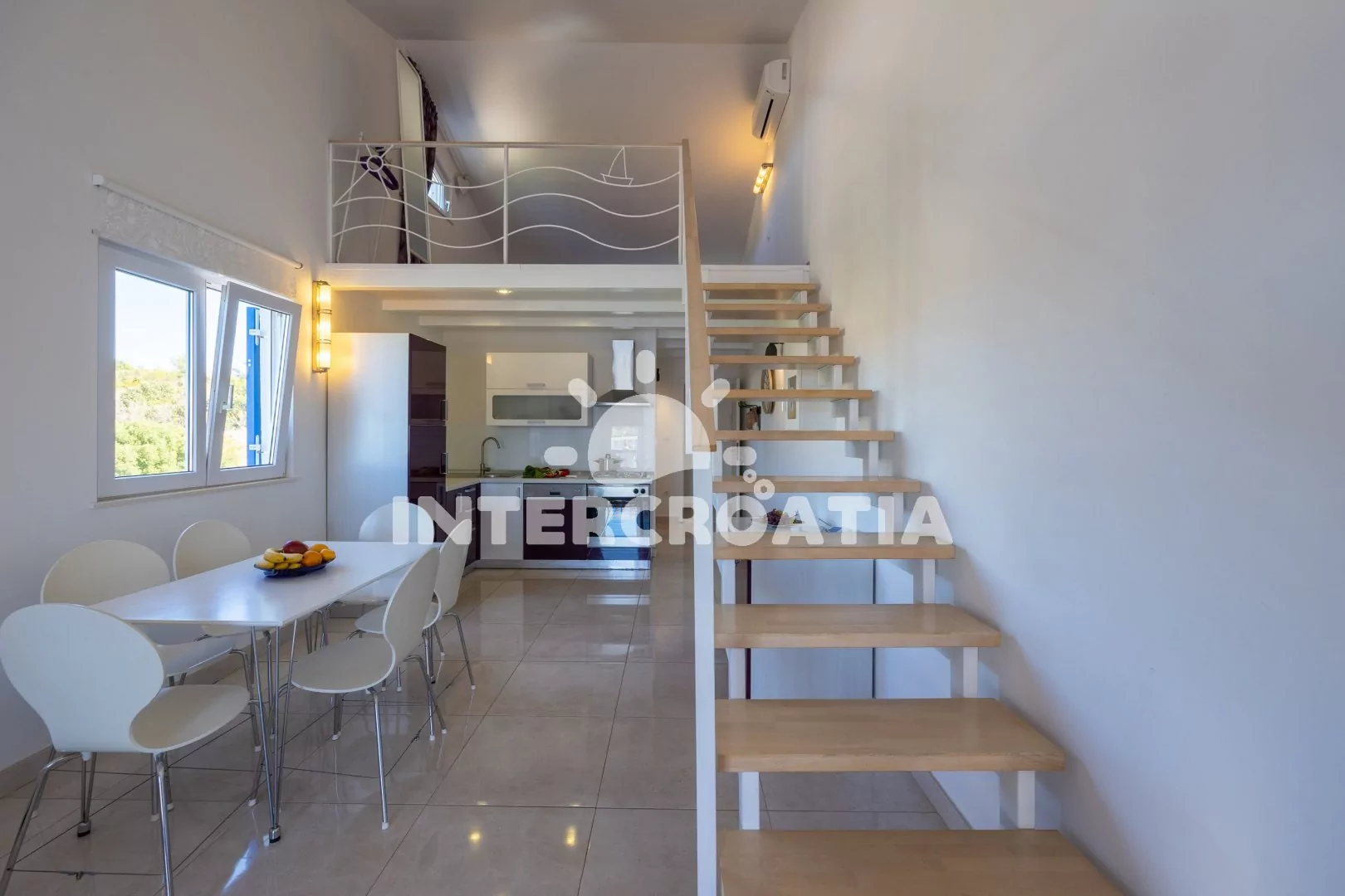 Patrový apartmán (56 m2) typu studio s terasou, posezením a výhledem na moře se nachází ve 2. patře domu. Obývací místnost je spojena s kuchyní. Kuchyňská linka je vybavena varnou deskou, digestoří,…