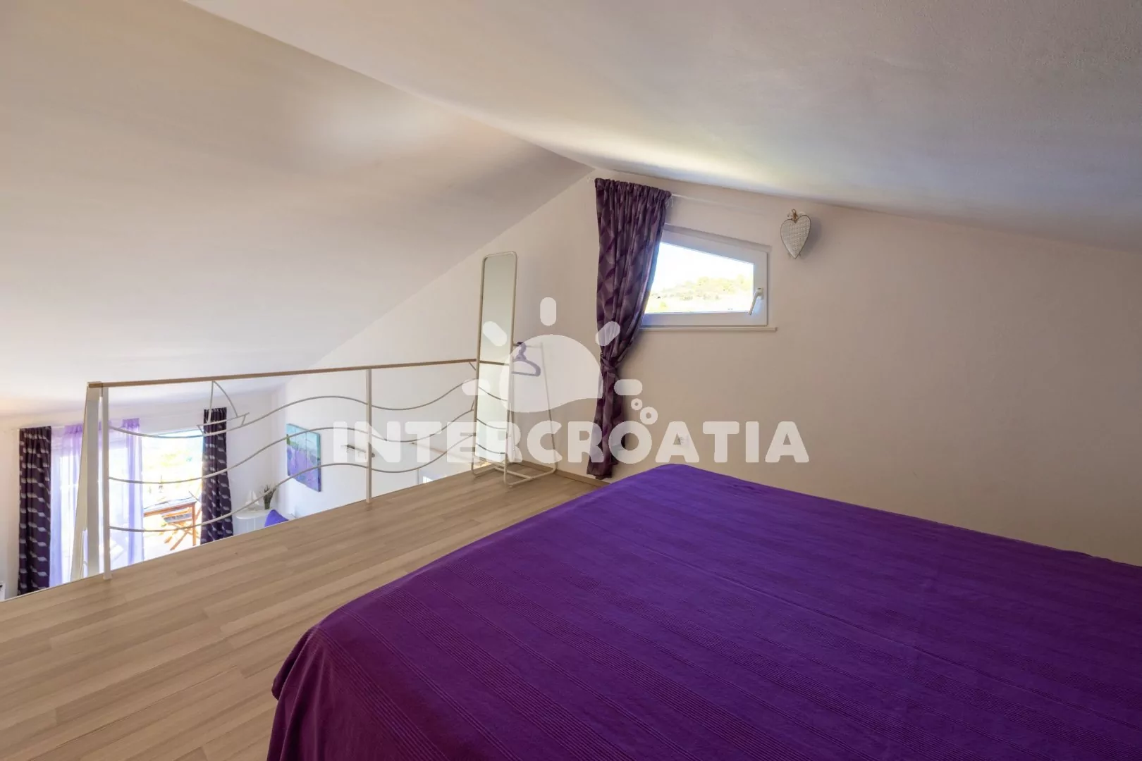 Patrový apartmán (56 m2) typu studio s terasou, posezením a výhledem na moře se nachází ve 2. patře domu. Obývací místnost je spojena s kuchyní. Kuchyňská linka je vybavena varnou deskou, digestoří, vestavěnou troubou, myčkou na nádobí, rychlovarnou konvicí, kávovarem, nádobím a lednicí s mrazákem. Obývací místnost s jídelním stolem, pohovkou, televizí se satelitním programem, klimatizací, vstupem na terasu a v patře s jedním dvoulůžkem. Koupelna se sprchovým koutem, umyvadlem, fénem, bidetem a wc. Hostům je k dispozici parkování u objektu zdarma.