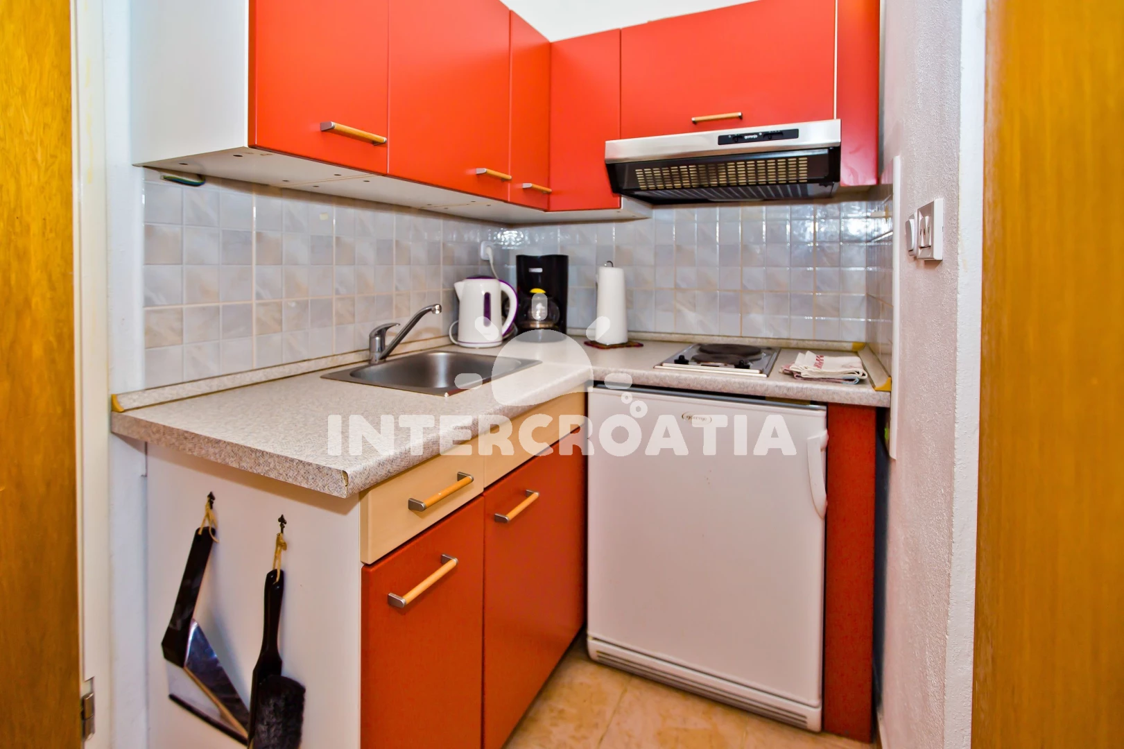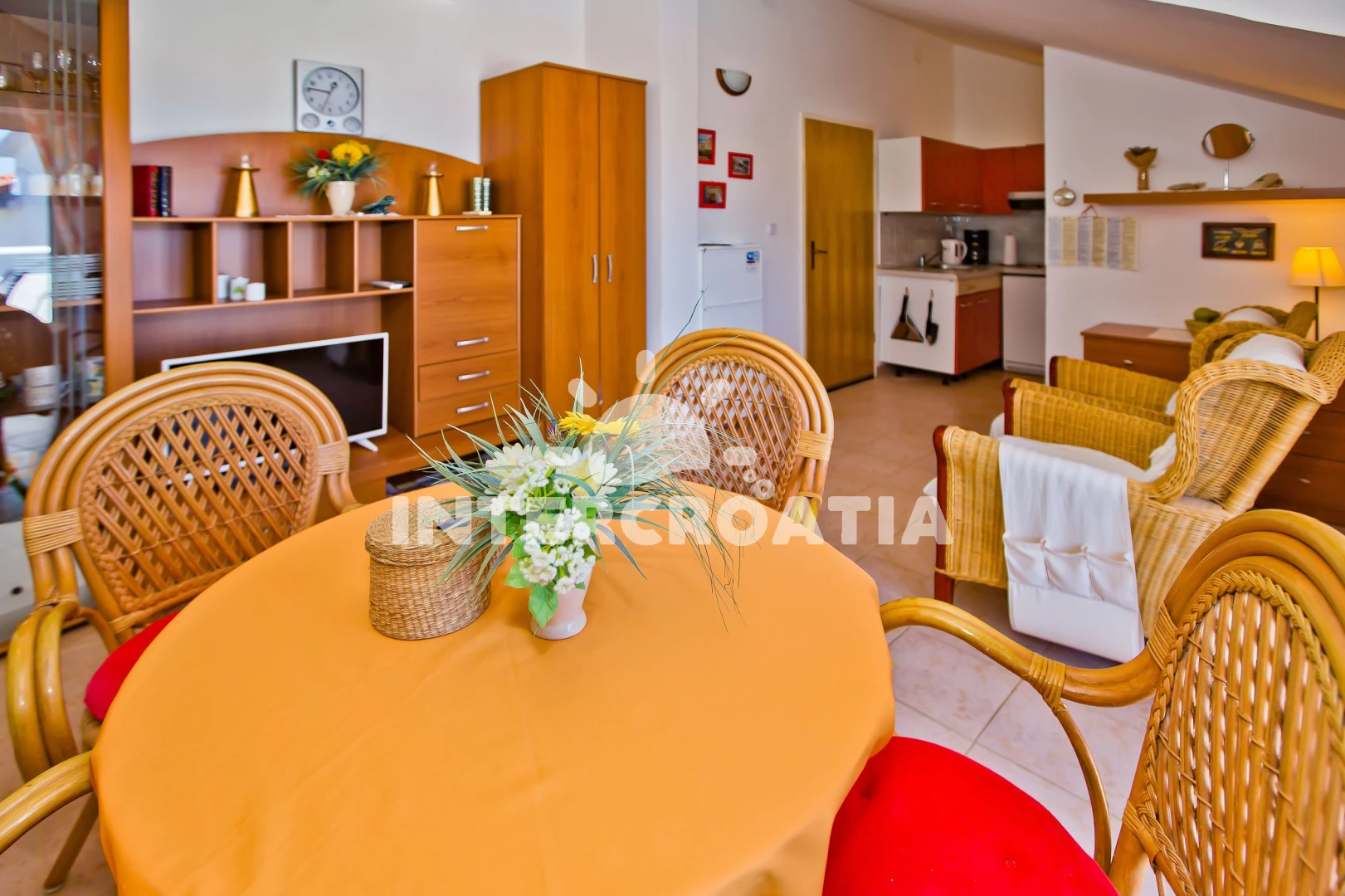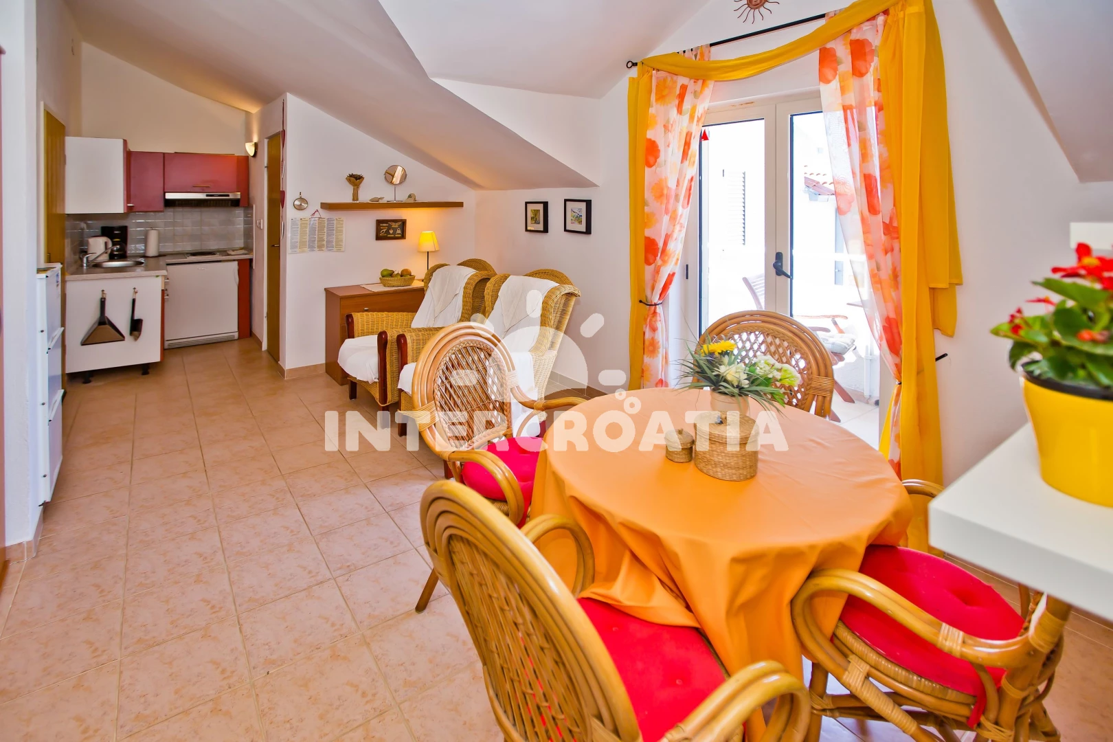 Apartmán (35 m2) s balkonem, a výhledem na moře. Nachází se v podkroví objektu. Apartmán má 1 ložnici a je vhodný pro až 2 osoby. Kuchyňská linka je vybavena varnou deskou, kávovarem, mikrovlnnou…