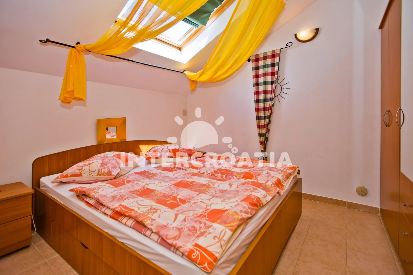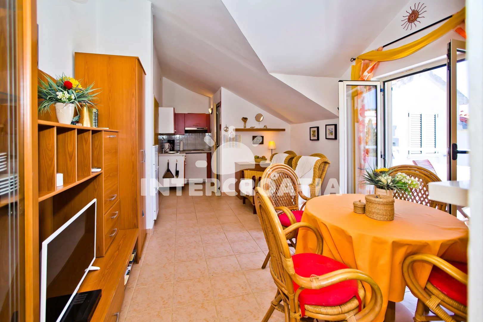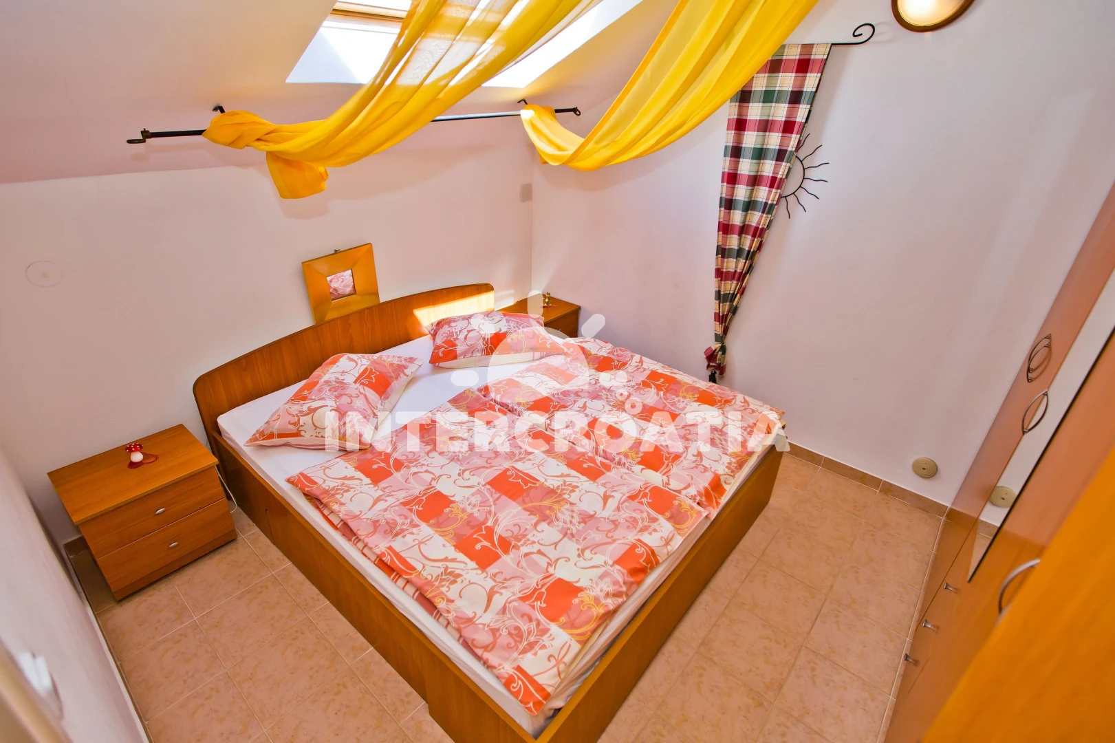 Apartmán (35 m2) s balkonem, a výhledem na moře. Nachází se v podkroví objektu. Apartmán má 1 ložnici a je vhodný pro až 2 osoby. Kuchyňská linka je vybavena varnou deskou, kávovarem, mikrovlnnou troubou, rychlovarnou konvicí, nádobím, lednicí, mrazákem. K dispozici televize se satelitním programem. Ložnice s dvoulůžkem. Koupelna se sprchovým koutem, umyvadlem, fénem a WC. Hostům je k dispozici parkování u objektu zdarma.