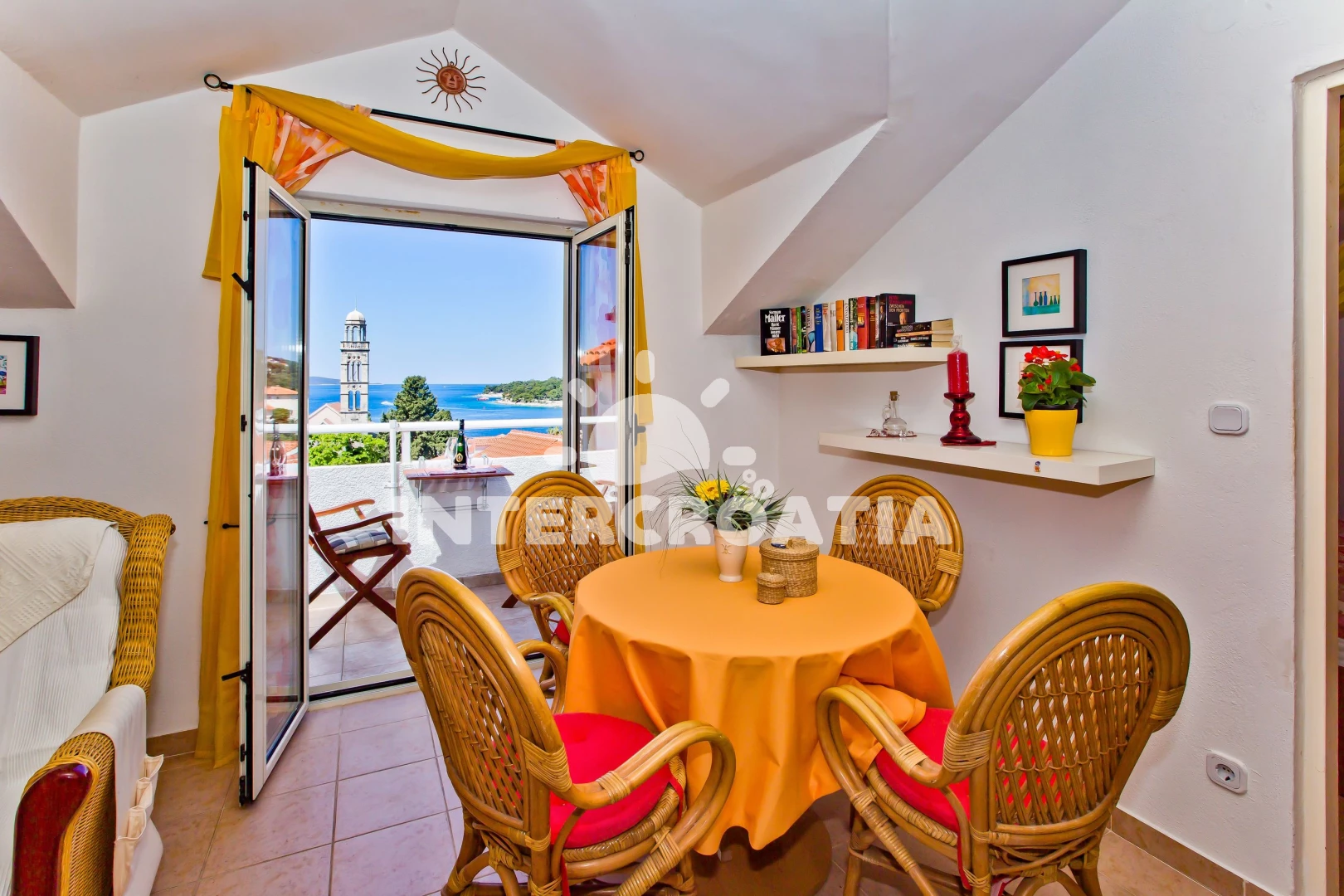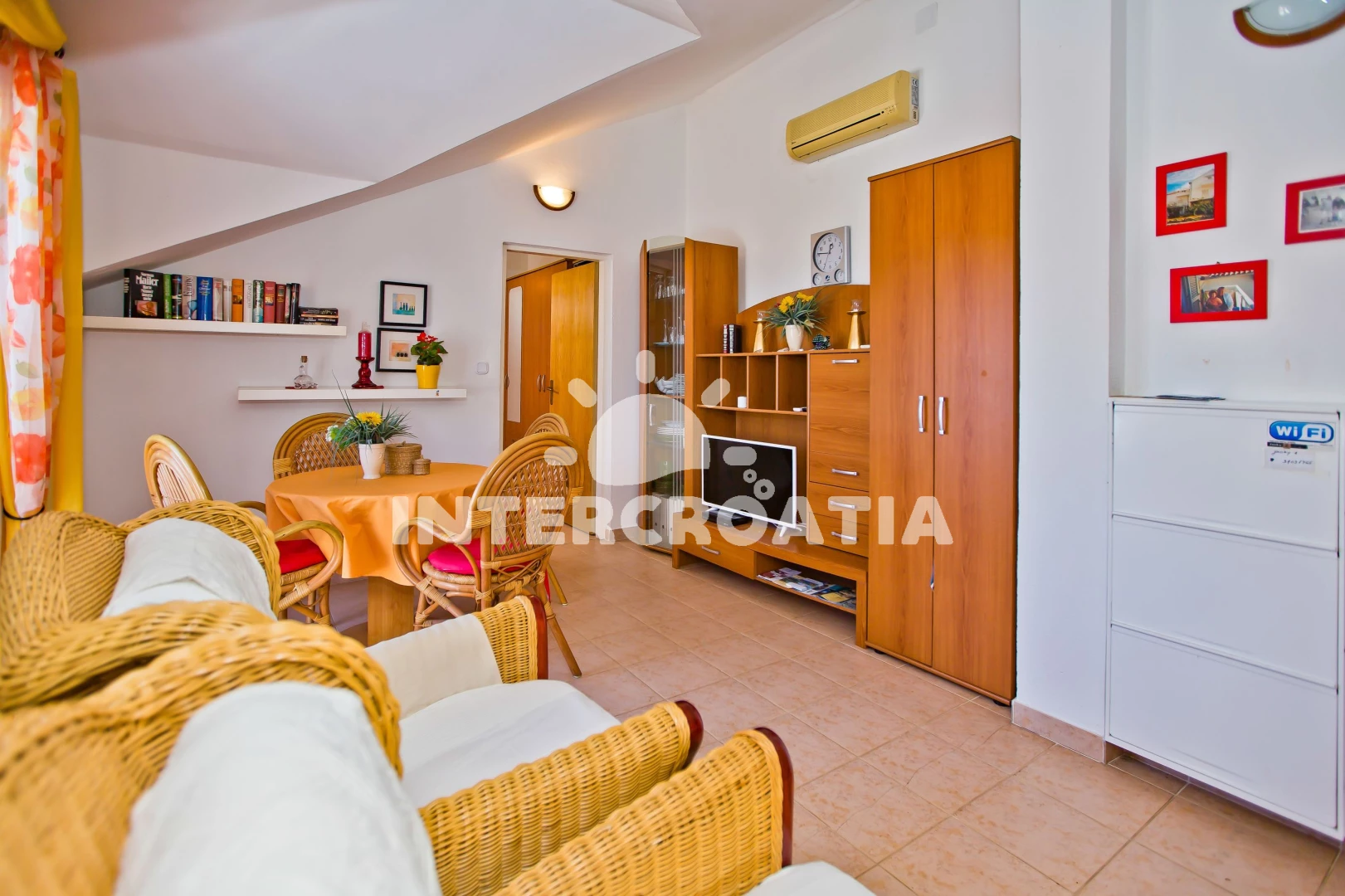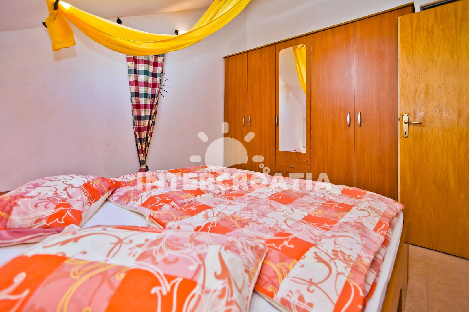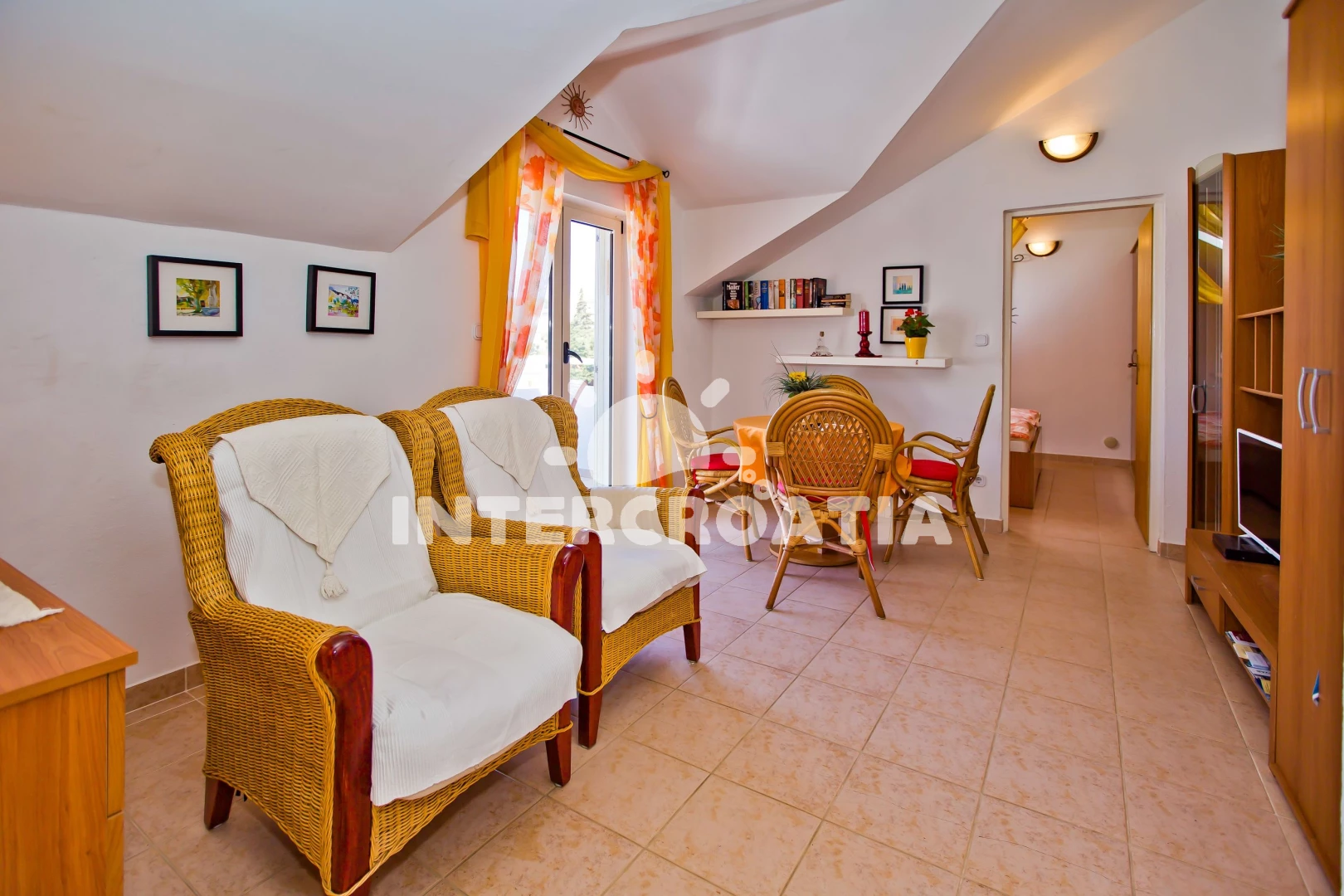 Apartmán (35 m2) s balkonem, a výhledem na moře. Nachází se v podkroví objektu. Apartmán má 1 ložnici a je vhodný pro až 2 osoby. Kuchyňská linka je vybavena varnou deskou, kávovarem, mikrovlnnou troubou, rychlovarnou konvicí, nádobím, lednicí, mrazákem. K dispozici televize se satelitním programem. Ložnice s dvoulůžkem. Koupelna se sprchovým koutem, umyvadlem, fénem a WC. Hostům je k dispozici parkování u objektu zdarma.