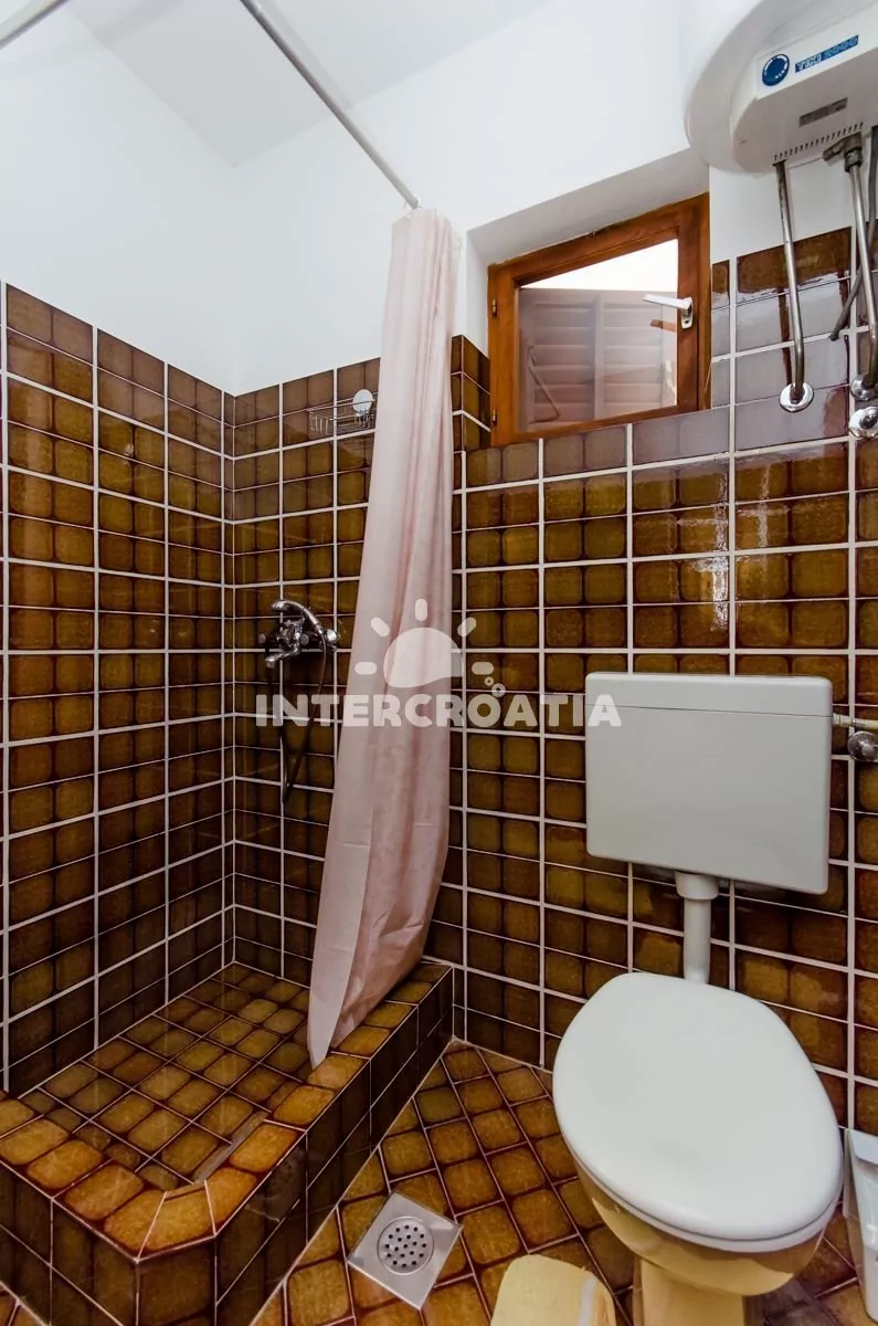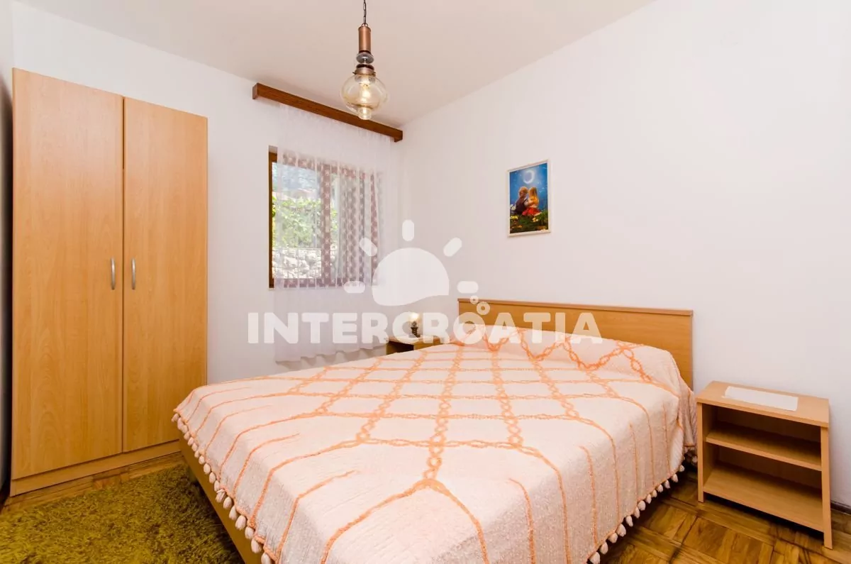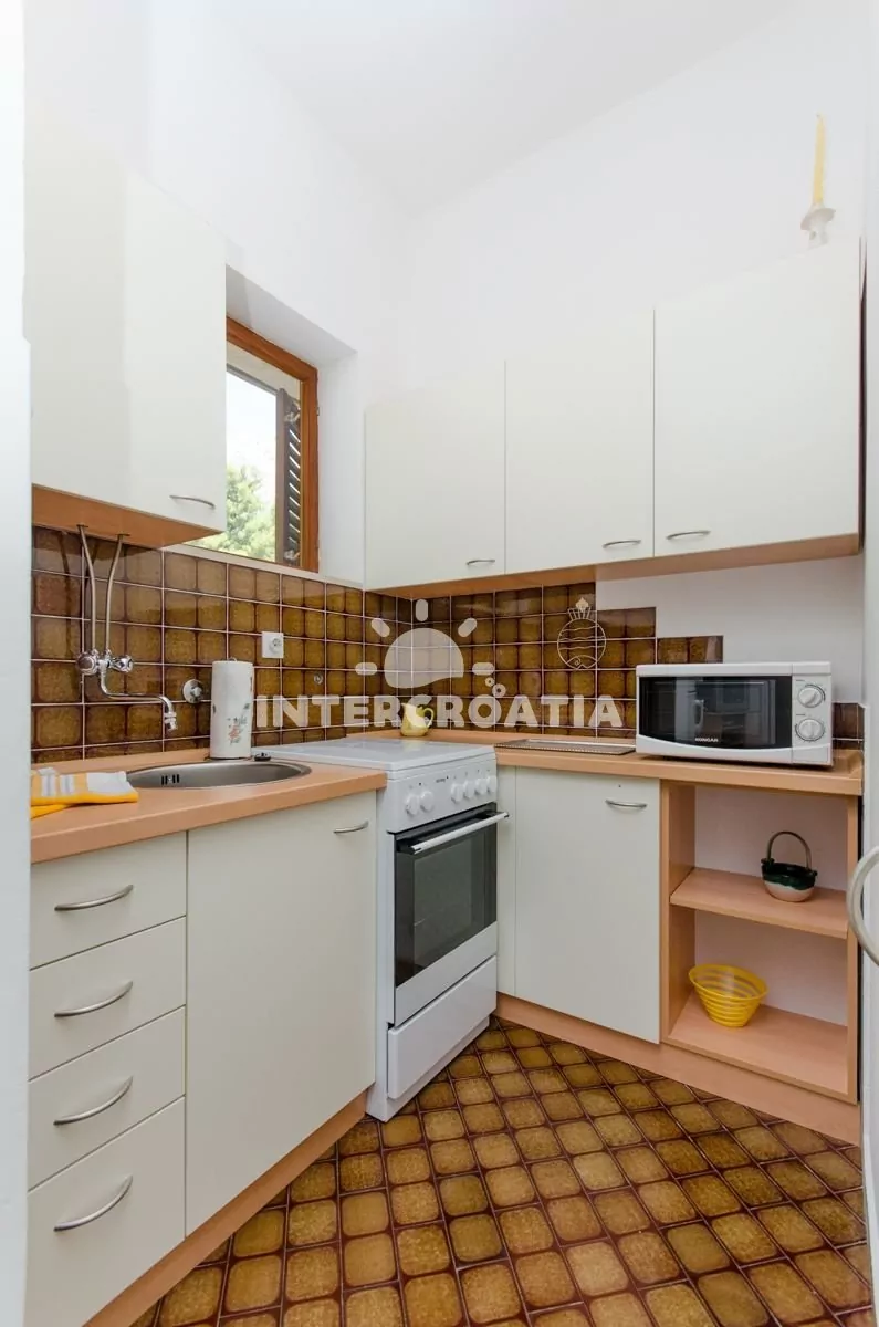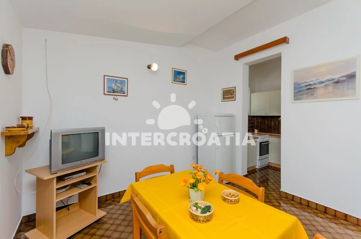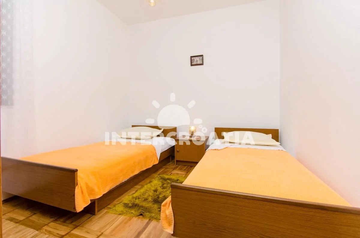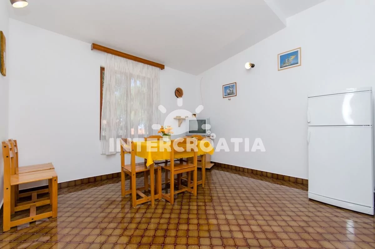 Apartmán (50 m2) s terasou, posezením a částečným výhledem na moře se nachází v přízemí domu. Apartmán má 2 ložnice a je vhodný pro 4 osoby. Obývací místnost je spojena s kuchyní. Kuchyňská linka je vybavena sporákem s troubou, mikrovlnnou troubou, nádobím a lednicí s mrazákem. Obývací místnost s jídelním stolem, televizí se satelitním programem, klimatizací a vstupem na terasu. První ložnice s dvoulůžkem. Druhá ložnice s dvěma jednolůžky. Koupelna se sprchovým koutem, umyvadlem a wc. Hostům je k dispozici parkování u objektu zdarma.