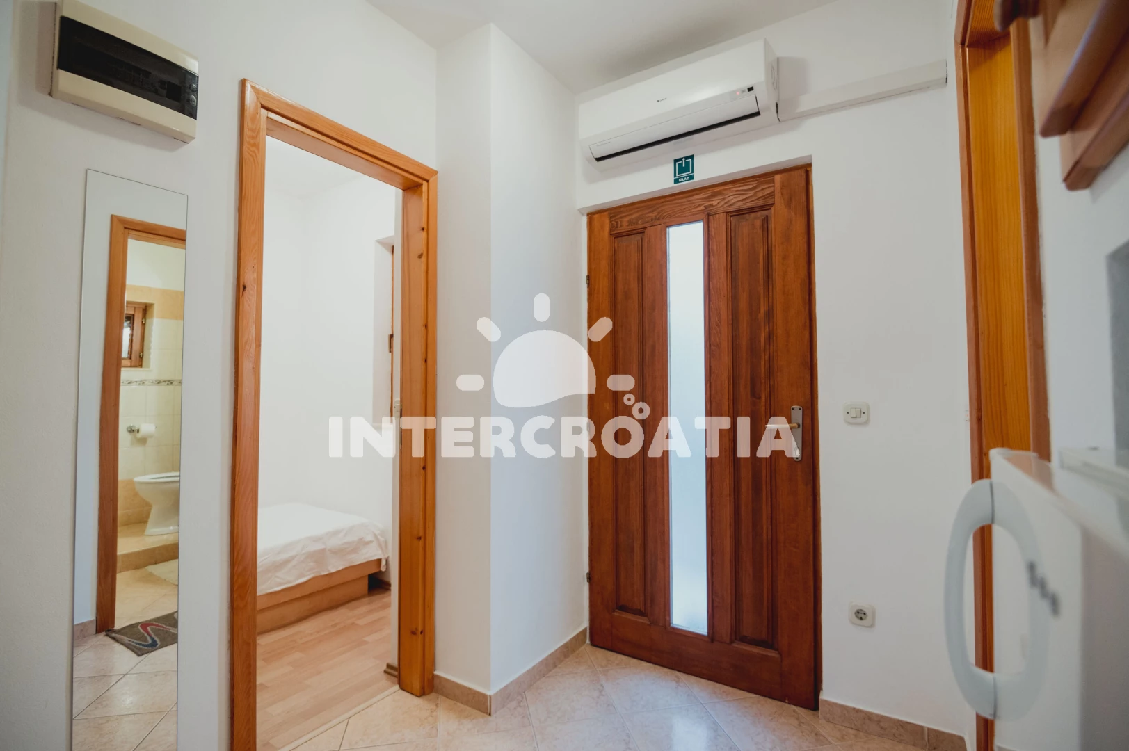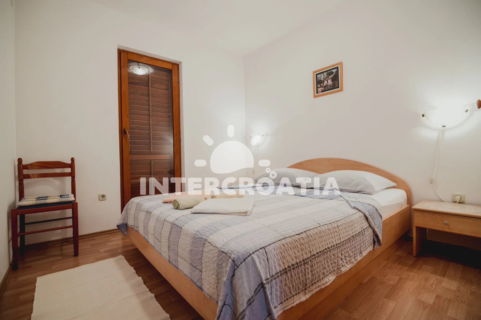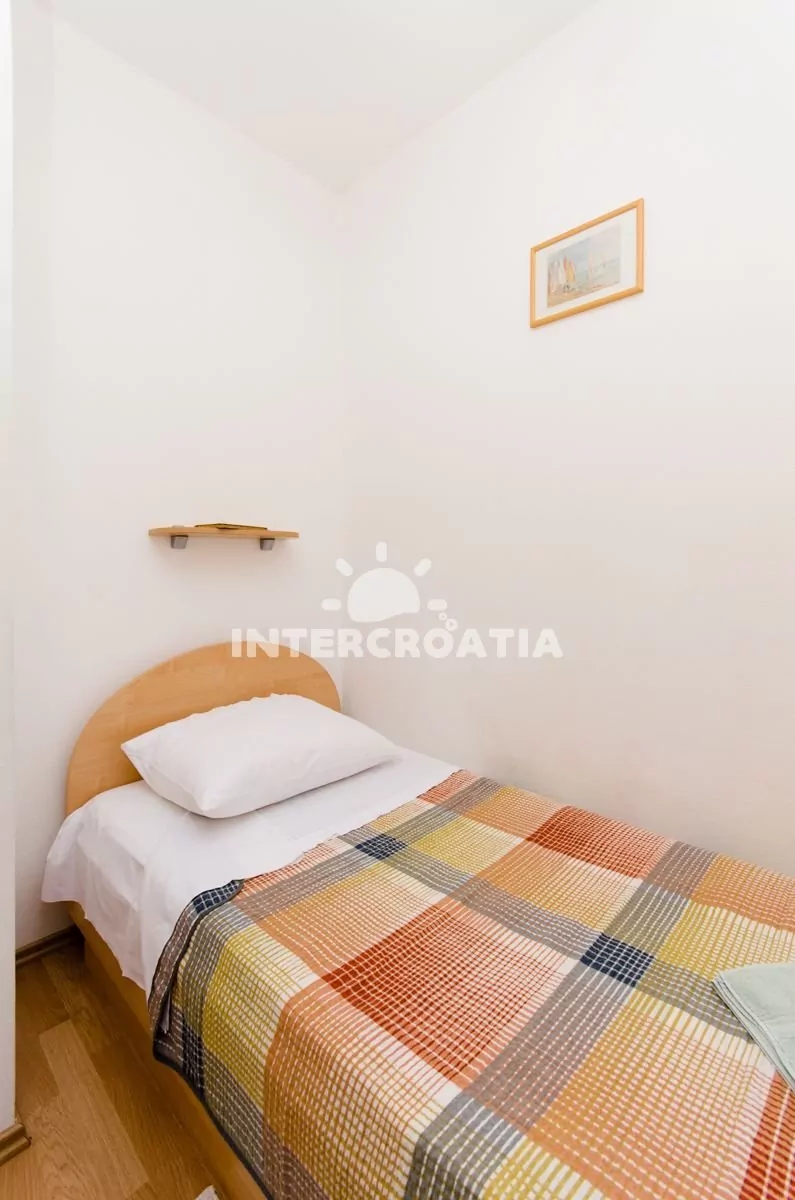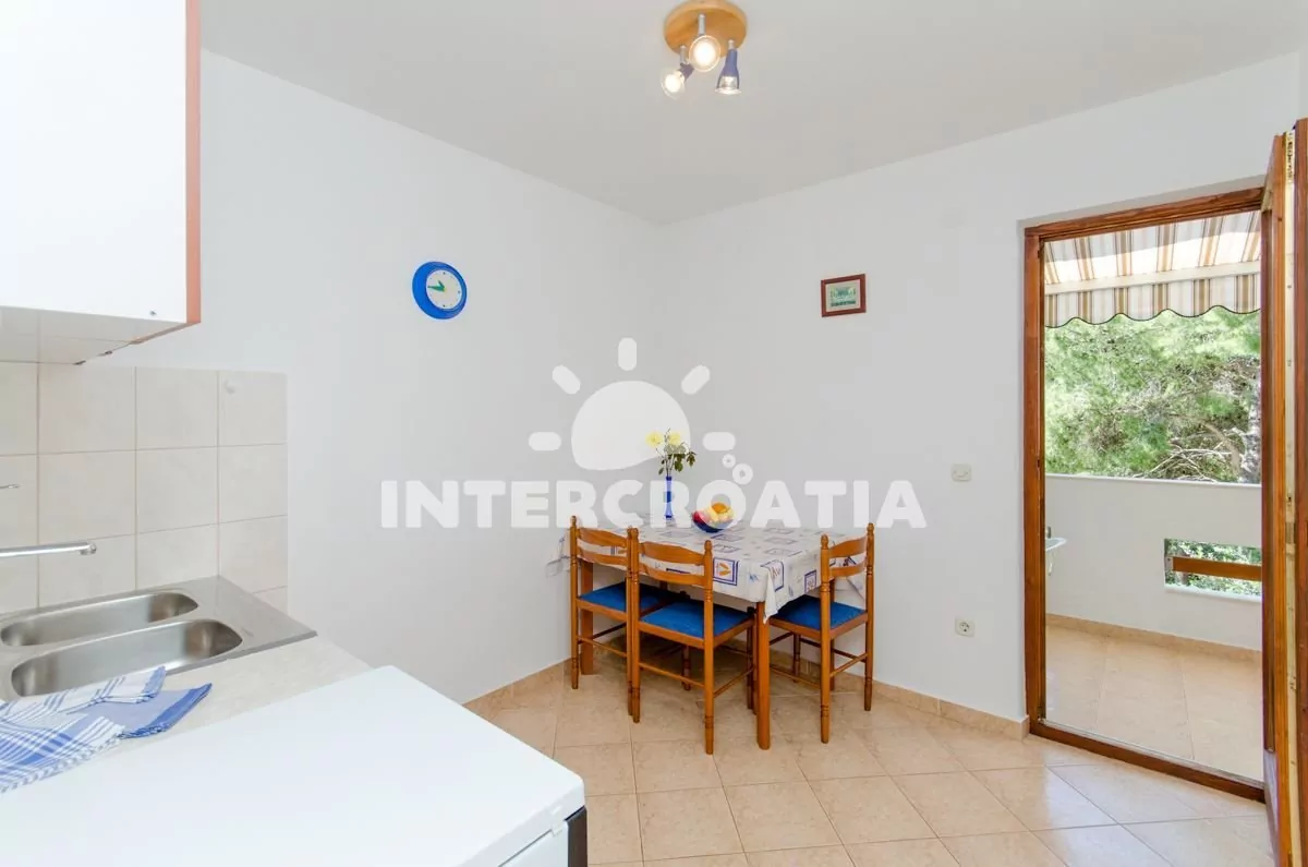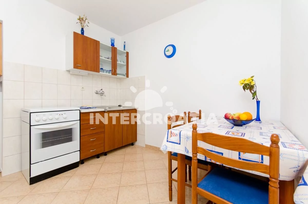 Apartmán (29 m2) s balkonem, posezením a částečným výhledem na moře se nachází v 1. patře domu. Apartmán má 2 ložnice a je vhodný pro 3 osoby. Obývací místnost je spojena s kuchyní. Kuchyňská linka je vybavena sporákem s troubou, nádobím a lednicí s mrazákem. Obývací místnost s jídelním stolem, televizí se satelitním programem, klimatizací a vstupem na balkon. První ložnice s dvoulůžkem. Druhá ložnice s dvěma jednolůžky. Koupelna se sprchovým koutem, umyvadlem a wc. Hostům je k dispozici parkování u objektu zdarma.