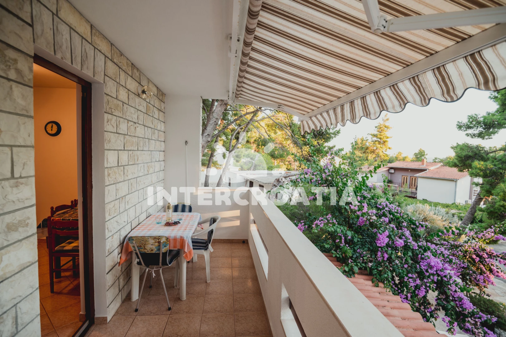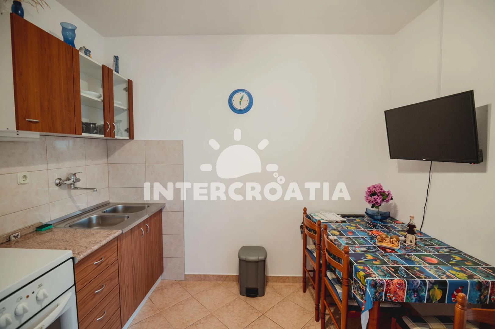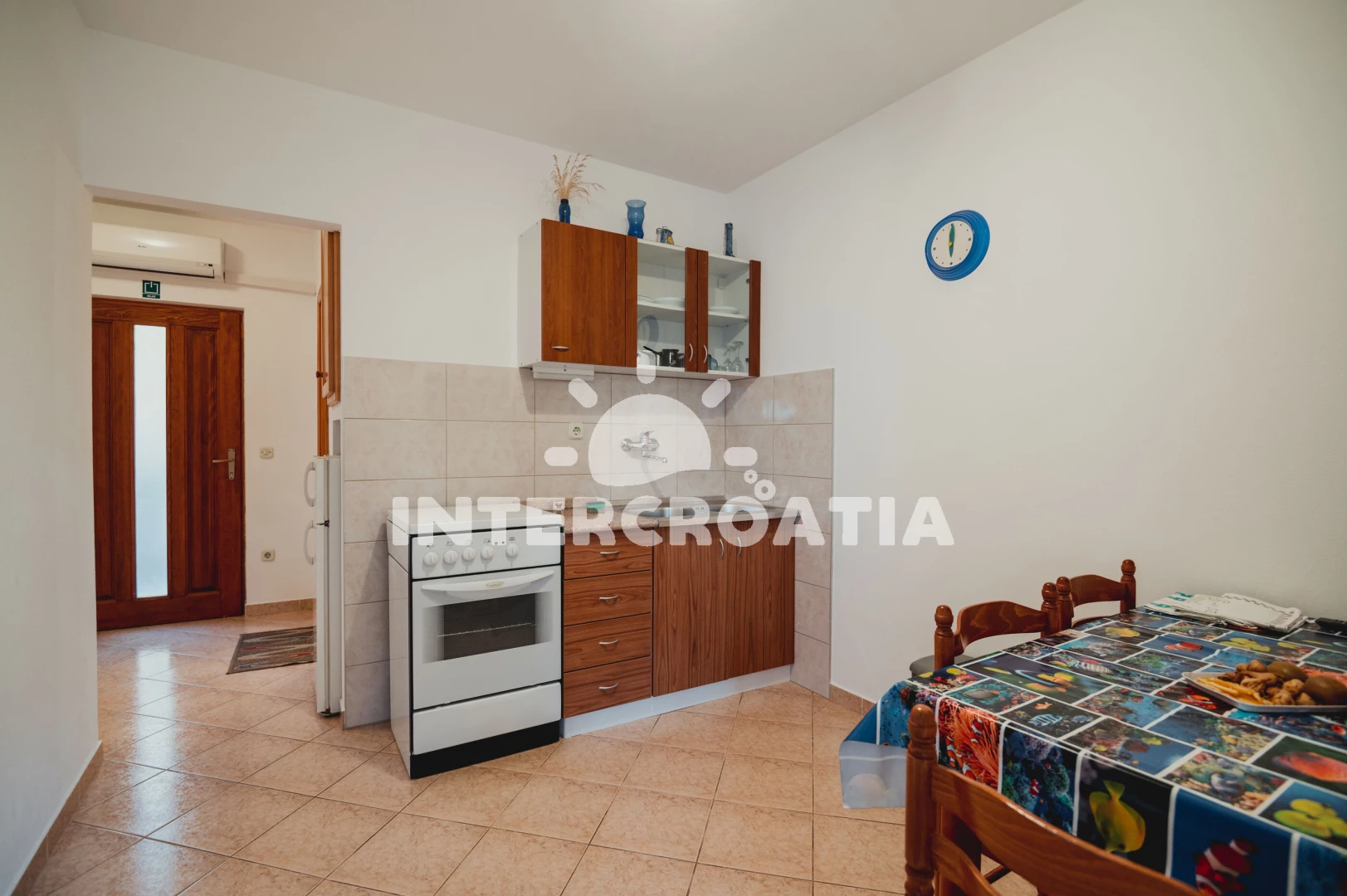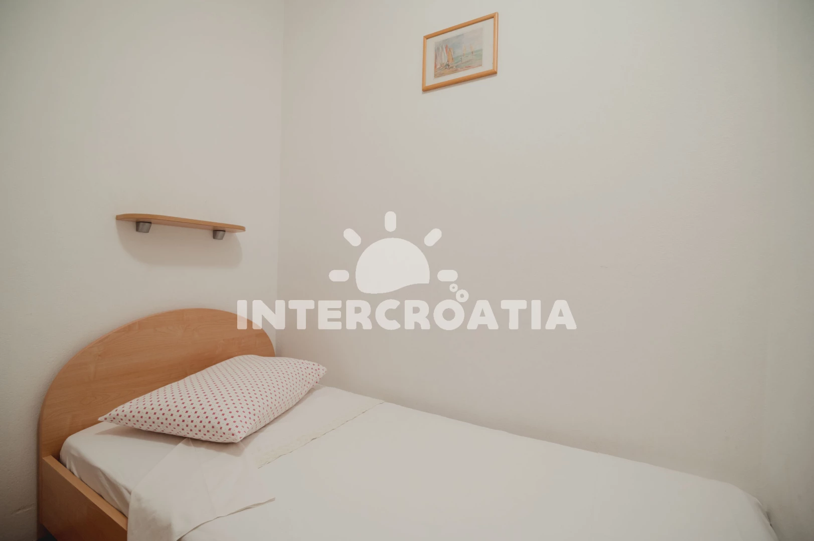 Apartmán (29 m2) s balkonem, posezením a částečným výhledem na moře se nachází v 1. patře domu. Apartmán má 2 ložnice a je vhodný pro 3 osoby. Obývací místnost je spojena s kuchyní. Kuchyňská linka je vybavena sporákem s troubou, nádobím a lednicí s mrazákem. Obývací místnost s jídelním stolem, televizí se satelitním programem, klimatizací a vstupem na balkon. První ložnice s dvoulůžkem. Druhá ložnice s dvěma jednolůžky. Koupelna se sprchovým koutem, umyvadlem a wc. Hostům je k dispozici parkování u objektu zdarma.