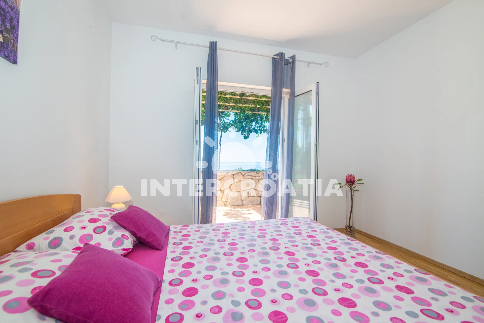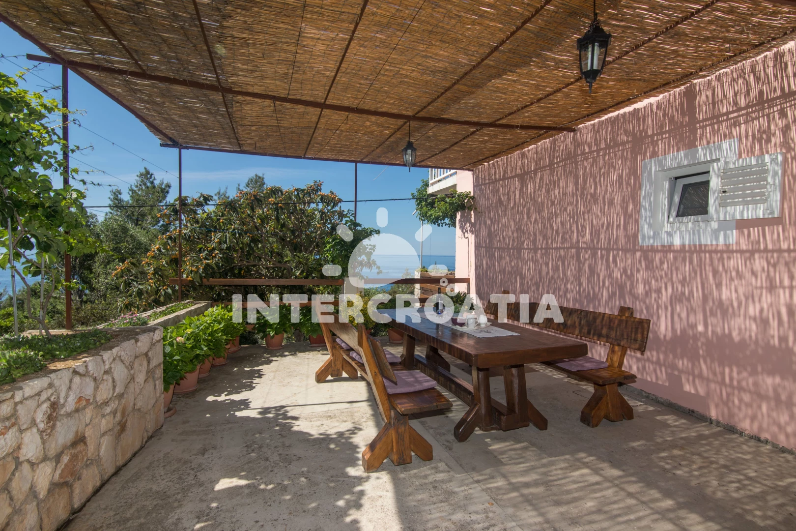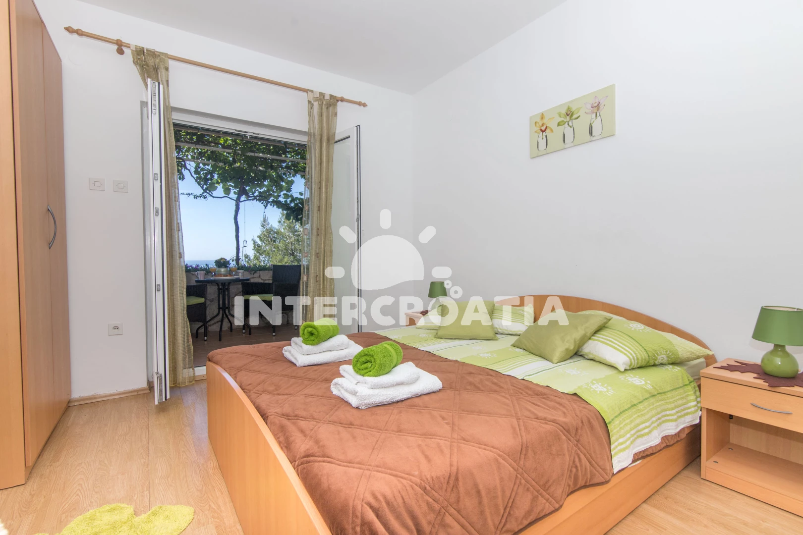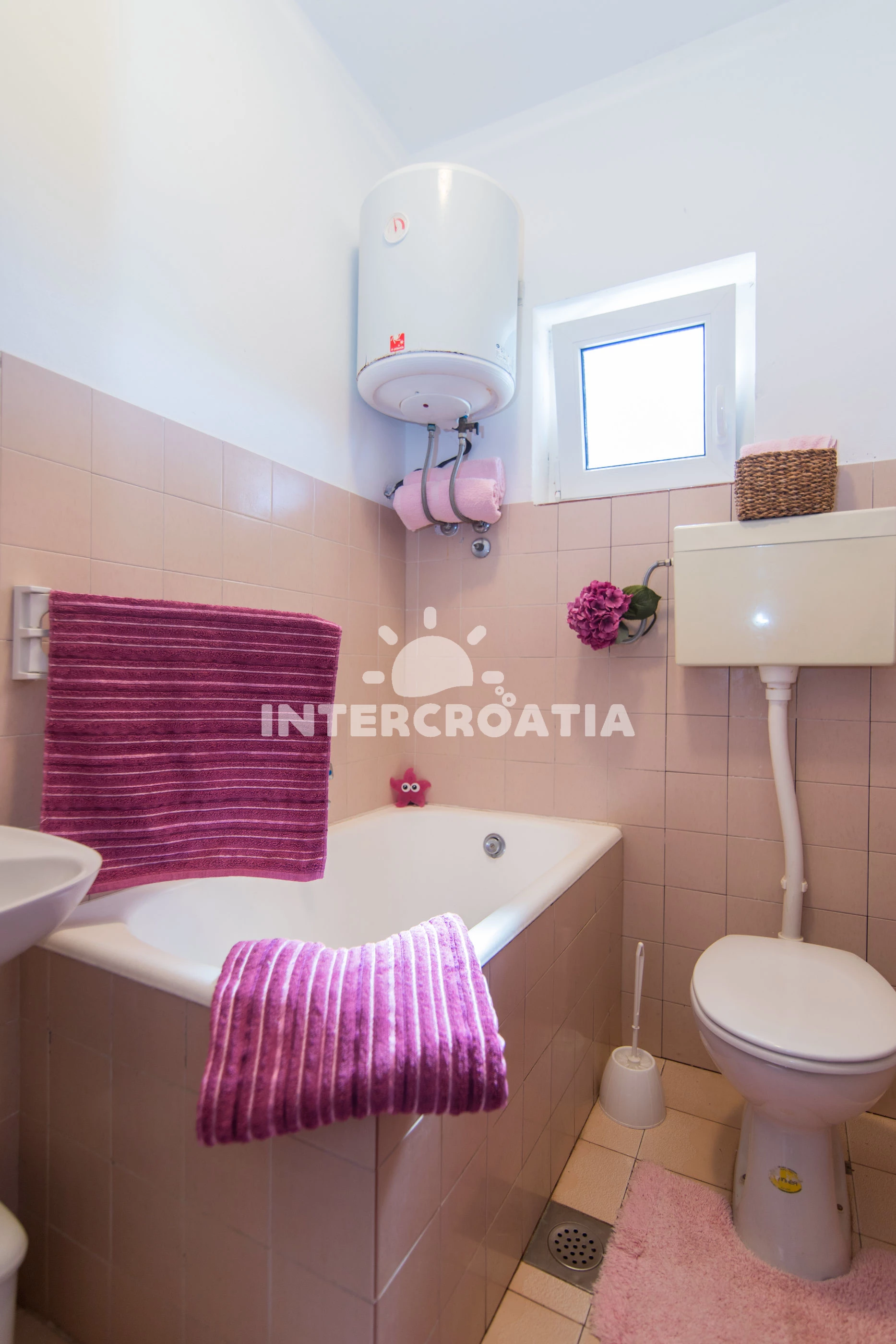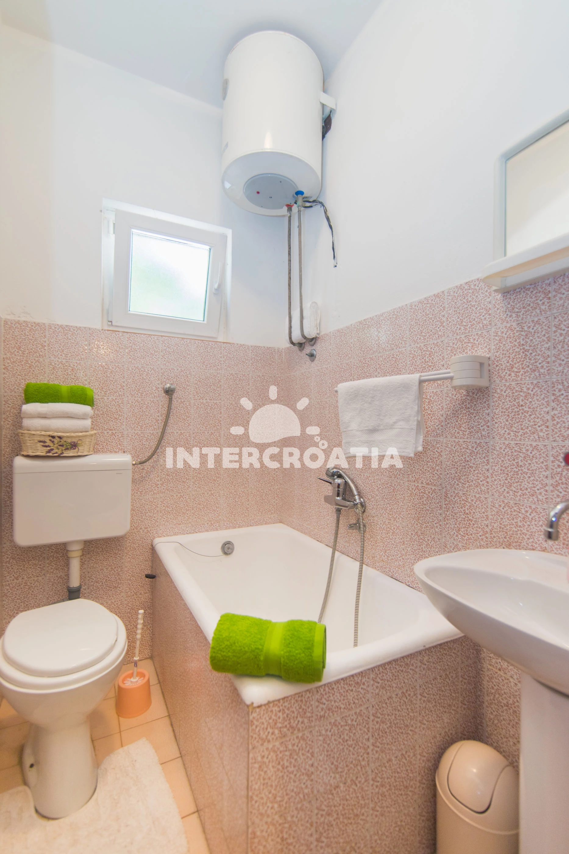 Apartmán se nachází 90 m od moře a pláže. Pláž je skalnatá, oblázková, větší kamení a betonové desky. U objektu je k dispozici společná zahrada s posezením a grilem. Parkování je před domem.