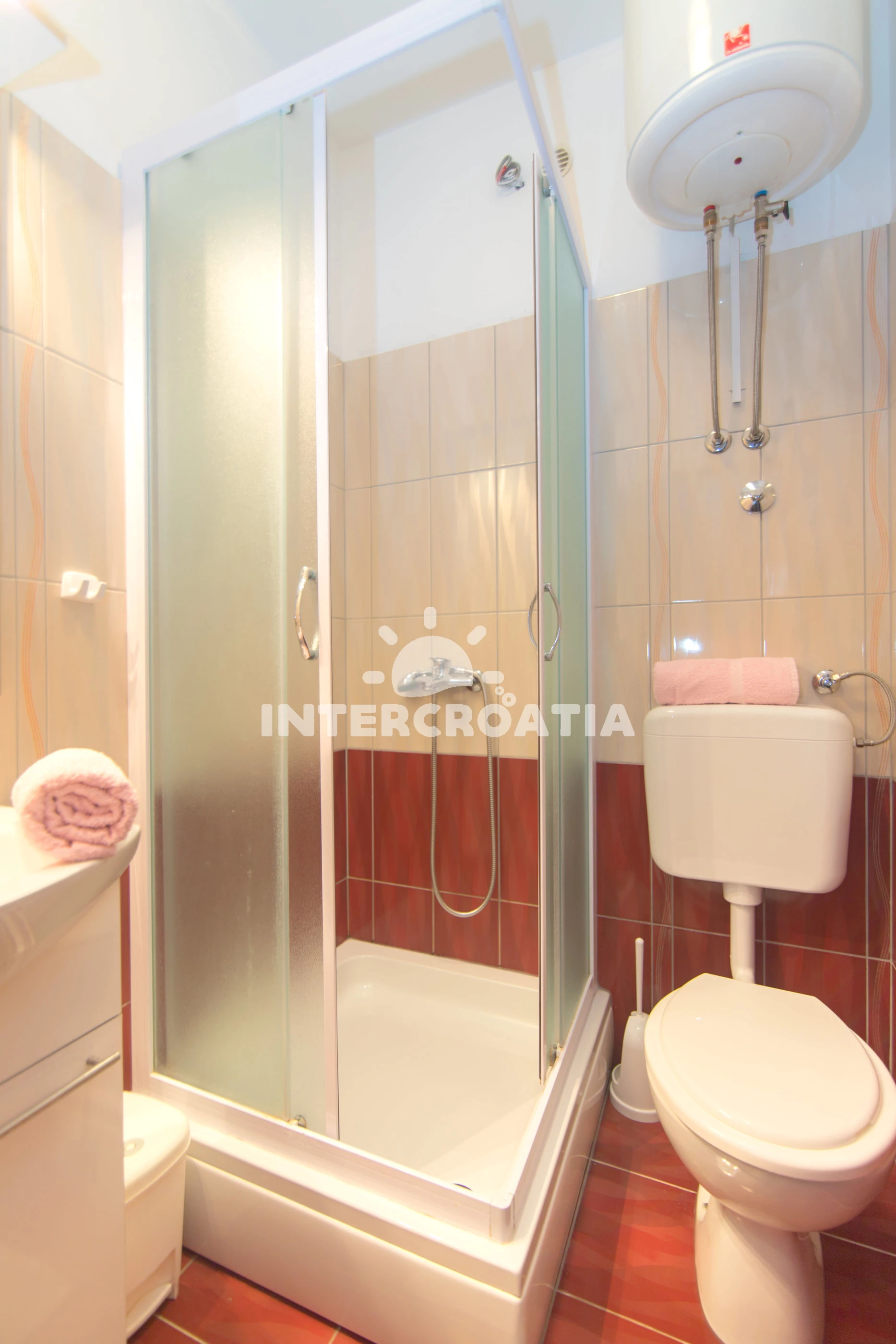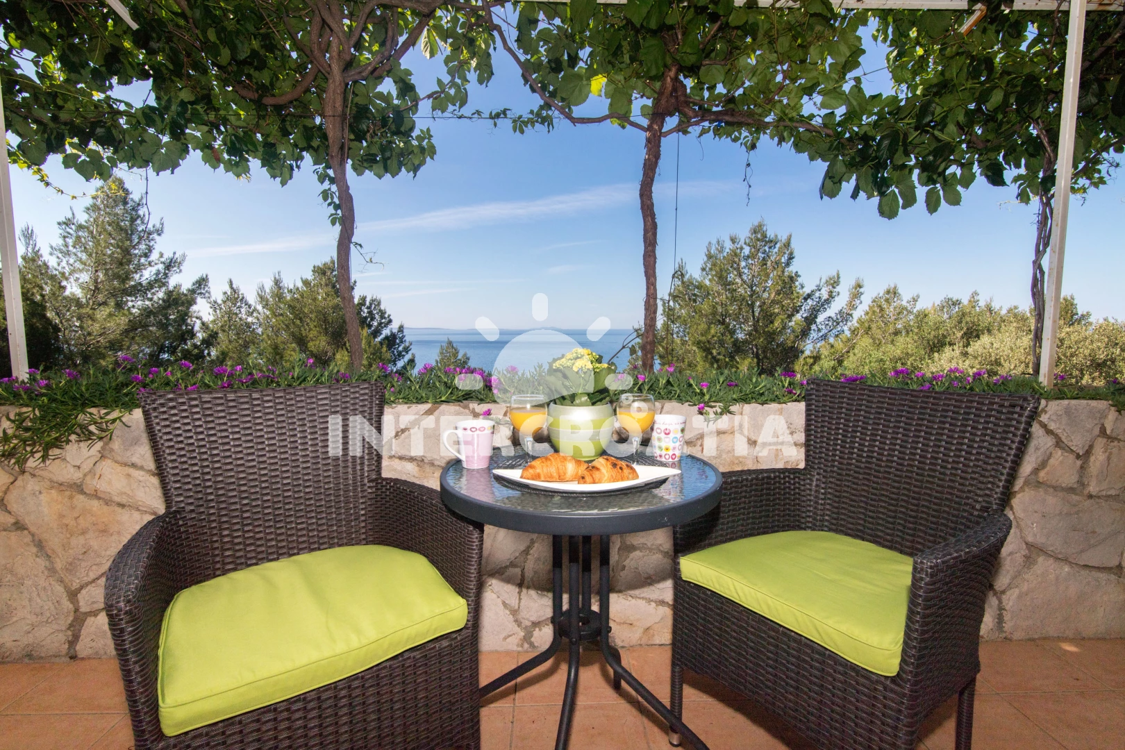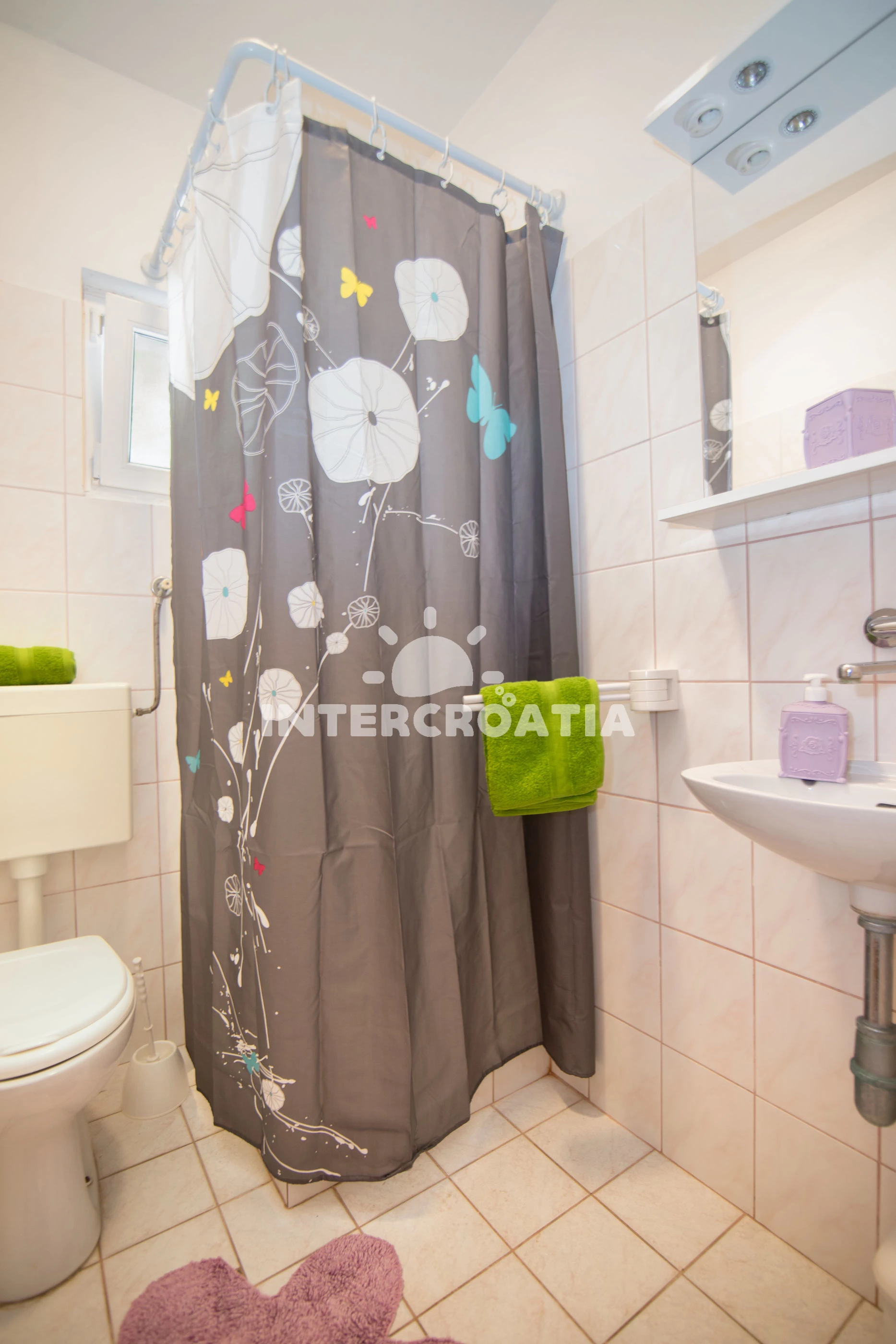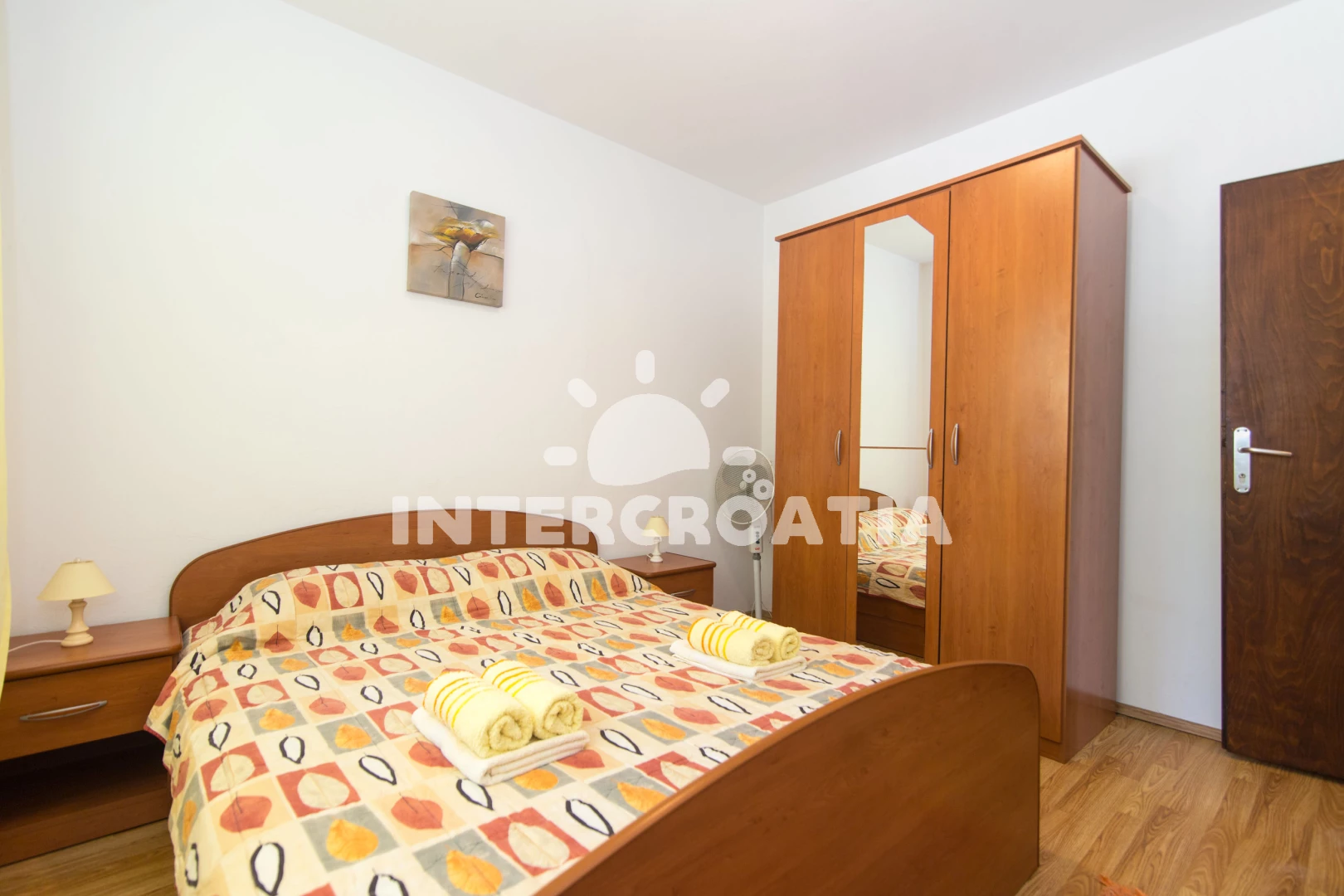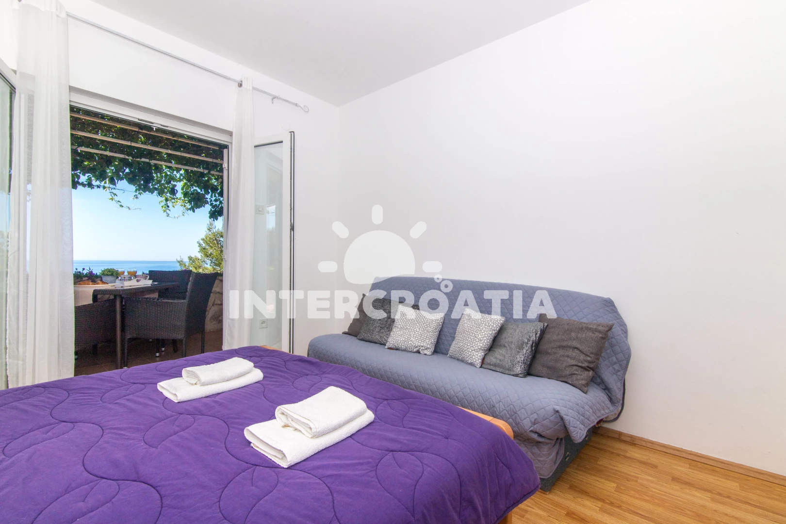 Apartmán se nachází 90 m od moře a pláže. Pláž je skalnatá, oblázková, větší kamení a betonové desky. U objektu je k dispozici společná zahrada s posezením a grilem. Parkování je před domem.