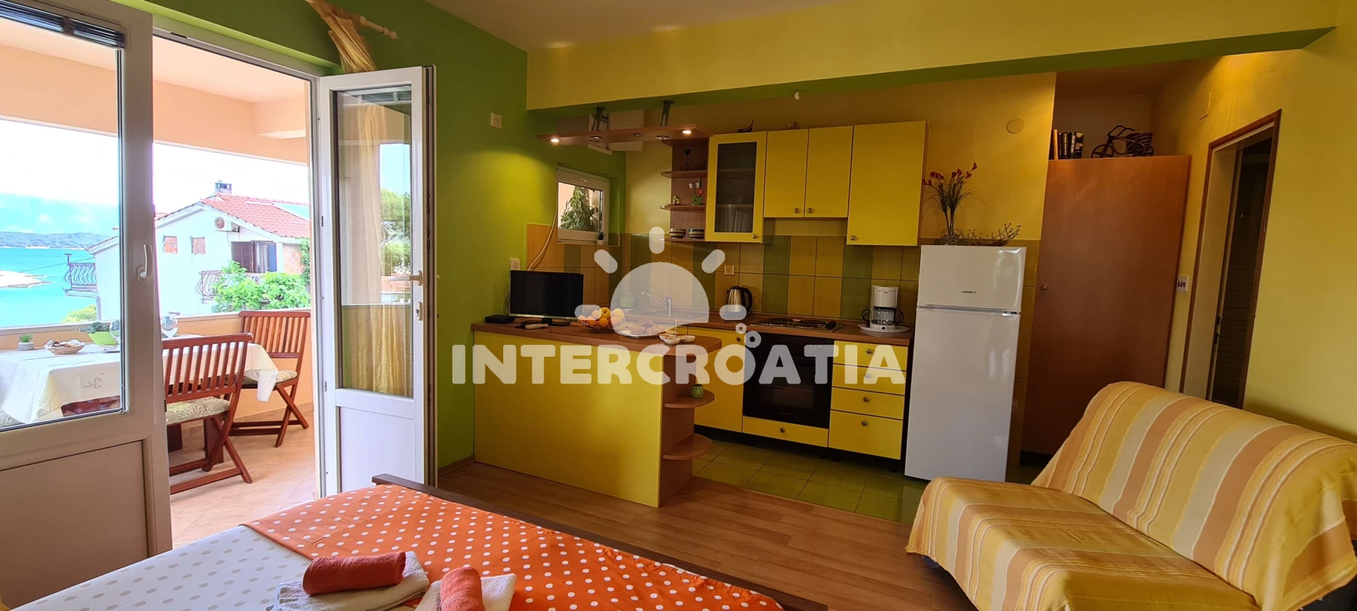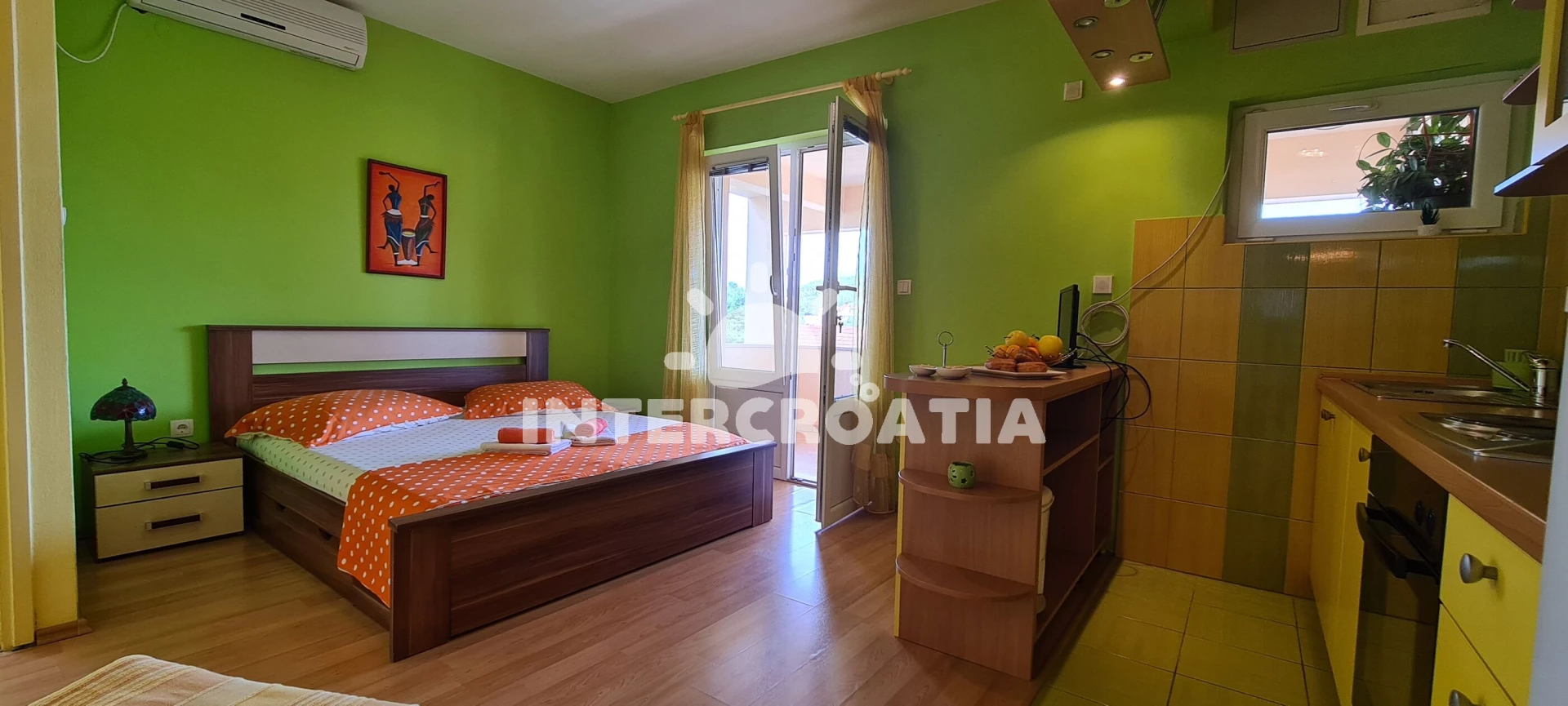 Apartmán se nachází 300 m od moře a pláže. Pláž je písčitá, skalnatá, oblázková, větší kamení a betonové desky. U objektu je k dispozici společná zahrada s posezením a grilem. Parkování je 50m - 150 m od domu.