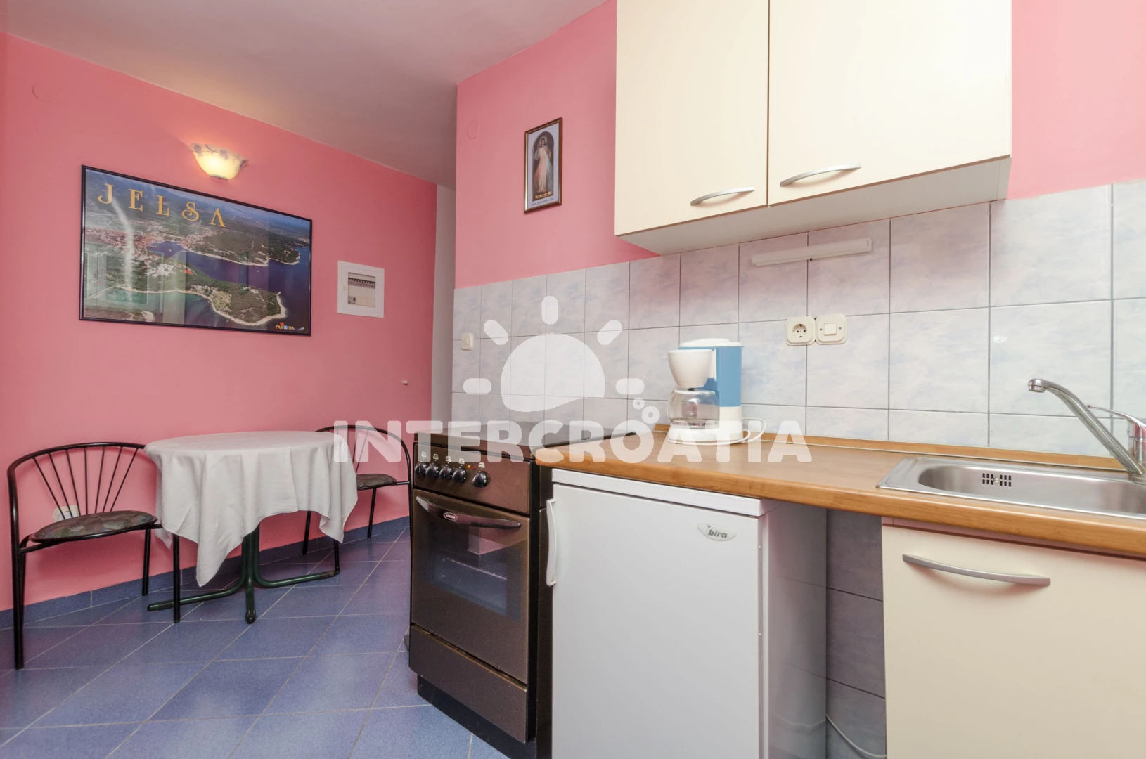 Vzdálenosti: Moře 80 m, pláž 100 m (kamenné a betonové desky), bar 250 m, směnárna 250 m, tenisové kurty 250 m, restaurace 250 m, ambulance 500 m, čerpací stanice 500 m, potápění 600 m, centrum 1 km, půjčovna kol 1 km, diskotéka 1 km, muzeum 1 km, půjčovna motorových člunů 1 km, pošta 1 km, banka 1 km, lékárna 1 km, veřejná doprava 1 km, supermarket 1 km, mini golf 1,5 km, trajekt (Stari Grad) 10 km,