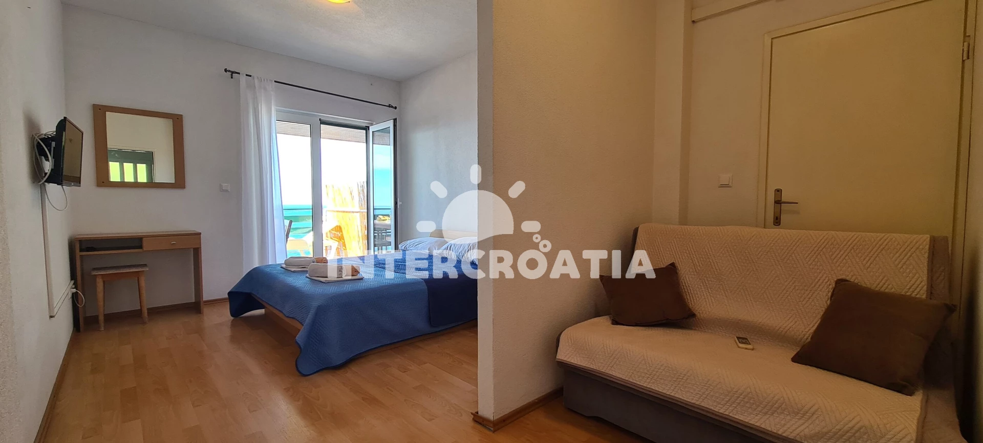 Apartmán (35 m2) s terasou, a výhledem na moře. Nachází se ve 3. patře objektu. Apartmán má 1 ložnici a je vhodný pro až 3 osoby. Kuchyňská linka je vybavena varnou deskou, rychlovarnou konvicí, nádobím, lednicí, mrazákem. K dispozici televize, žehlička. Ložnice s dvoulůžkem, přistýlkou. Koupelna se sprchovým koutem, umyvadlem, fénem a WC.
